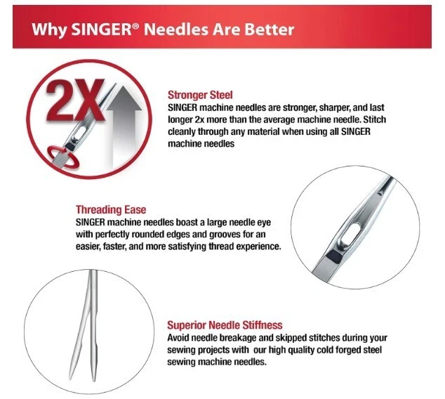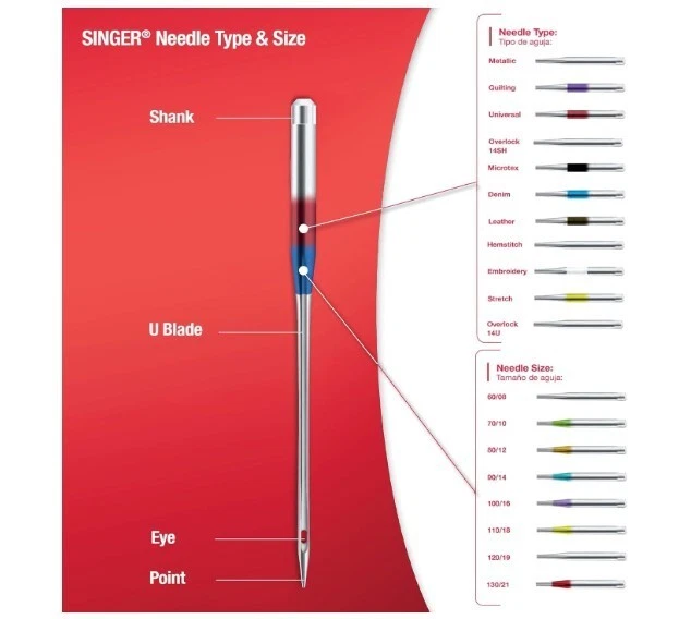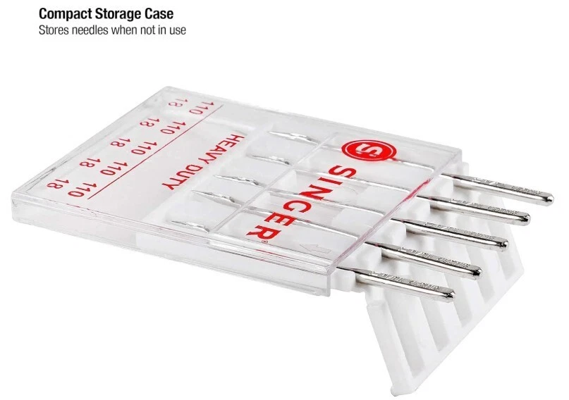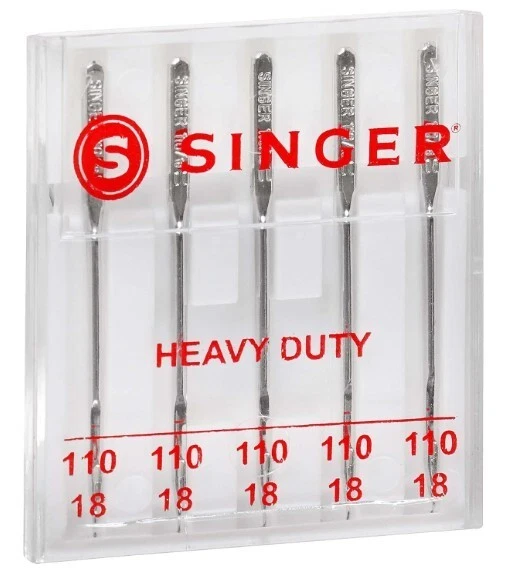 Set of 5 heavy duty sewing machine needles, size 110/18 Heavy duty needles in size 110/18 are necessary for heavyweight fabrics such as denim, upholstery, wool, corduroy or leather Made of high quality cold forged steel to prevent needle breakage and skipped stiches and conveniently developed with larger needle eyes and t-shaped needle heads for an easier sewing experience All singer needles are color coded for easy recognition during your sewing projects; top color corresponds to the needle type and the bottom color corresponds to the needle size Compatible with all quality household domestic sewing machines, including SINGER, Brother, Kenmore, Janome, Juki, and Bernina brands.