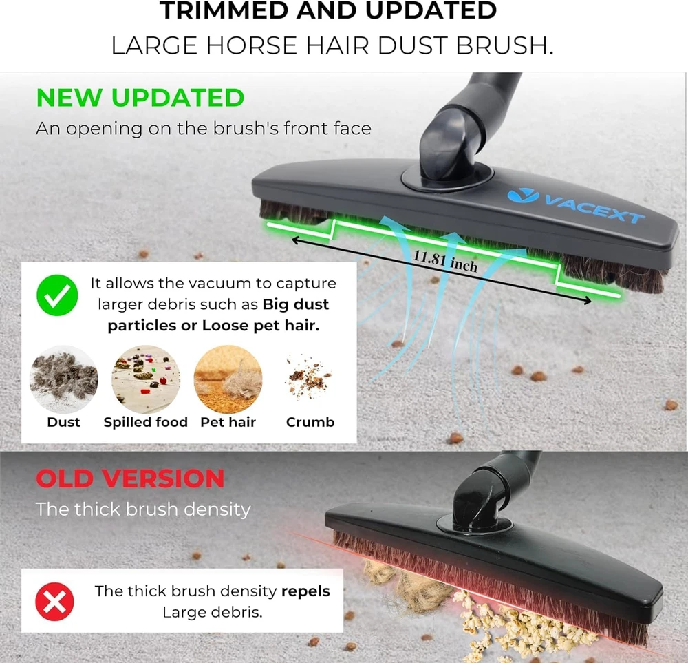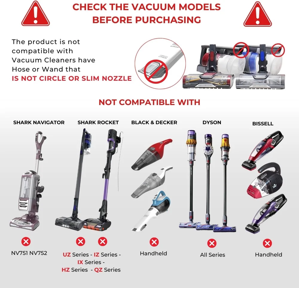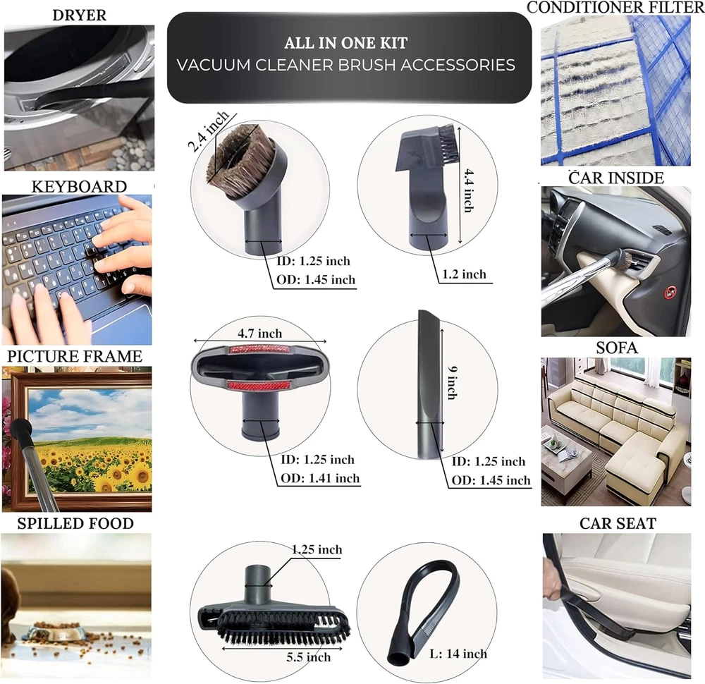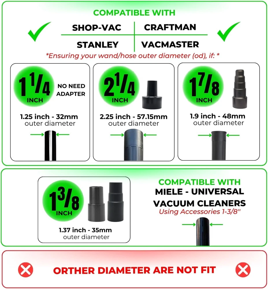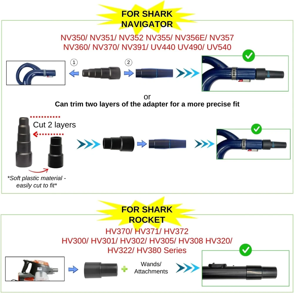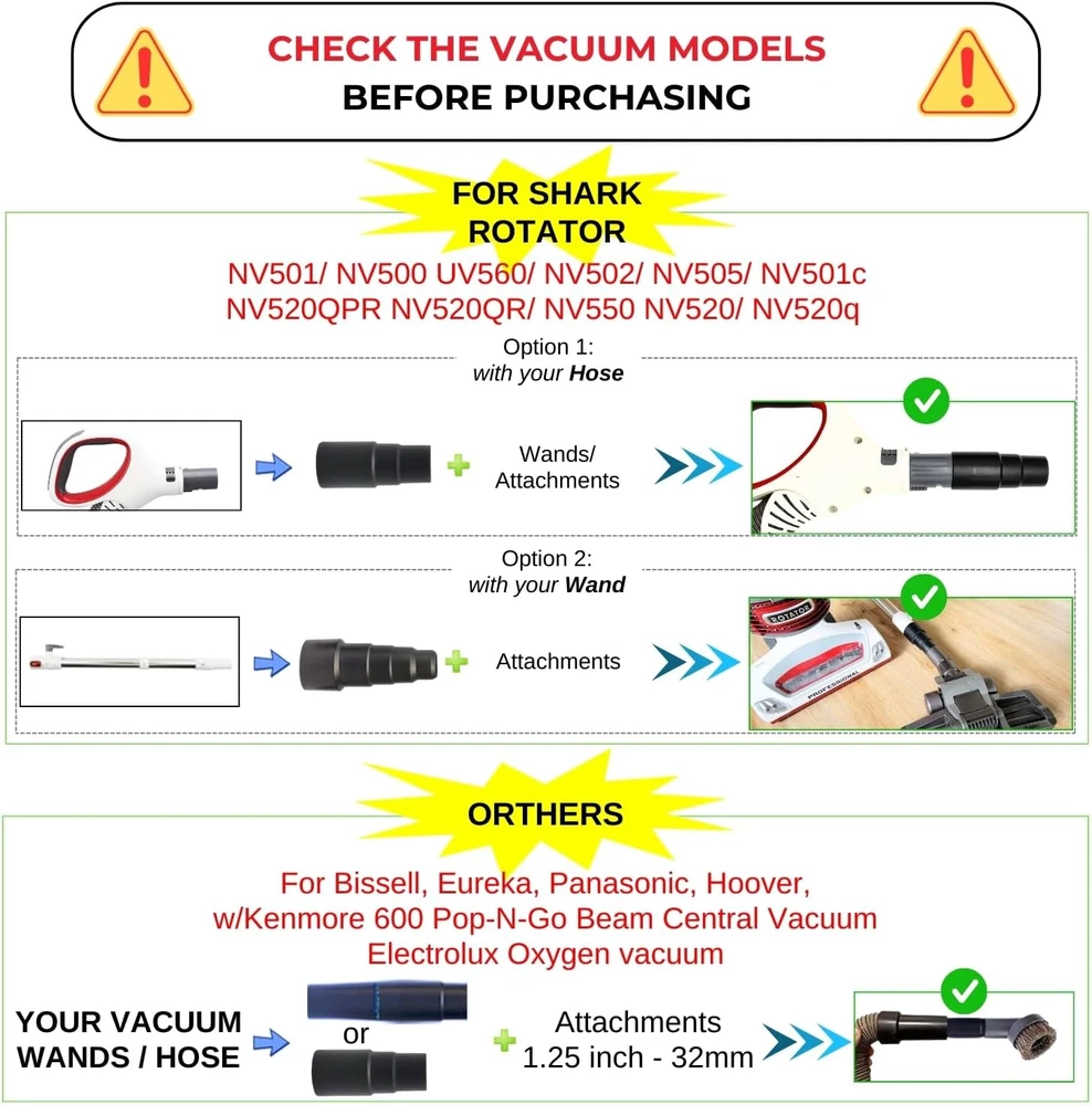 Vacuum Hose Adapter Compatible with Most Shark Vacuums: [Please Check your model before ordering] Vacuum Accessories & Attachments Kit can be compatible with Shark Navigator NV350 NV360, Stratos Duo Clean AZ3002, Rotator NV500 NV501, Rocket HV300 HV301 HV322 HV371 HV372 Models [Other Models NOT fit] 2-1/4'' to 1-1/4'' Vacuum Attachment Adapter for Shop Vac: This household cleaning tool kit is compatible with Rigid Shop vac Vacmaster and more Shop Vacs using 2-1/4'' outer diameter extesion wand/hose What you get: Universal Vacuum Hose Adapter Kit, 11.8'' Horsehair Hardwood Floor Brush Head, 1 1/4" Horsehair Vacuum Dust Brush, 1 1/4" Flexible Crevice Tool, 1 1/4" Vacuum Crevice Tool, 1 1/4" Upholstery Tool Attachment, 1 1/4" Utility Nozzle with Removable Plastic Brush, 1 1/4" Brush & Nozzle Combination Tool. Upgraded 2024 with Improving Pet Hair Pickup on Hard Floors Surfaces (Hardwood Floor Vacuum Attachment) The front of the hardloor brush mouth features a unique design that enhances its ability to pick up pet hair on hard floors. This makes it superior to other products in effectively removing fur from your floors. Flexible Crevice Tool for Hard to Reach Place: can tackle dust in hard-to-reach places around your home and car and can remove lint from the dryer vent as well, Great for corner, heating ducts, under furniture and car seat, along side the refrigerator. Dryer Vent Vacuum Attachments Product Description Universal Vacuum Attachments & Brushes Kit (13 packs) Hardwood Floor Vacuum Brush with Horsehair Bristles All in one kit Vacuum cleaner brush accessories Please ensure your WAND or HOSE outer diameter (OD) before purchasing InCompatible Vacuum Models