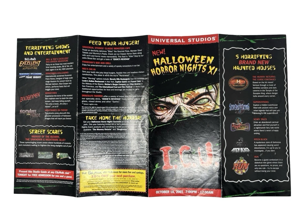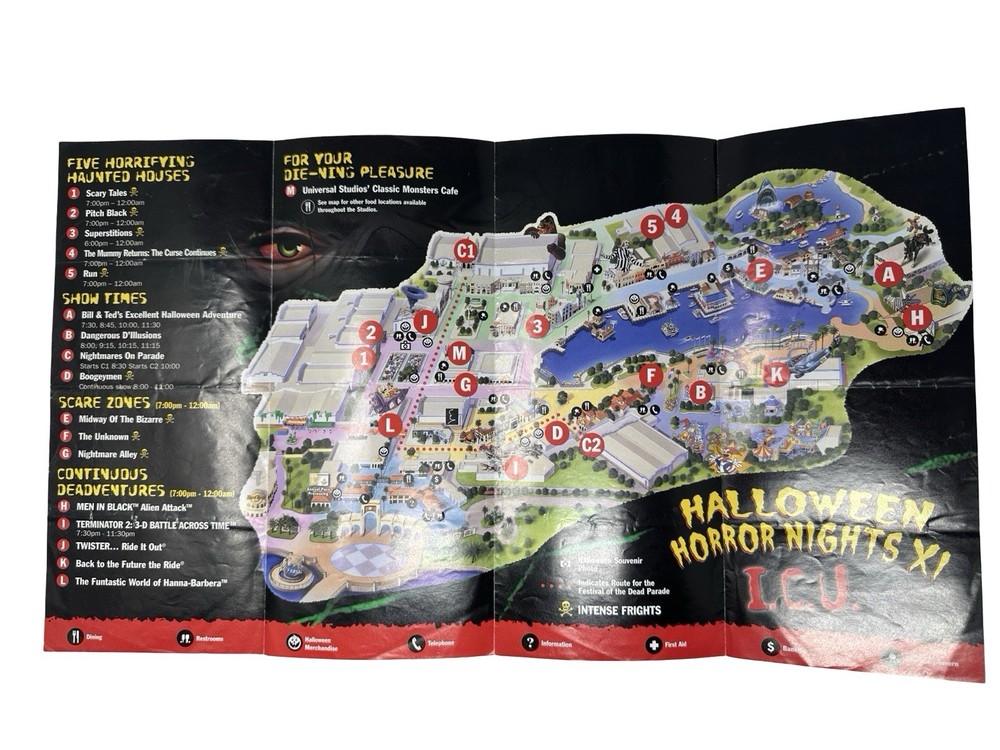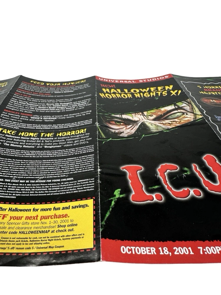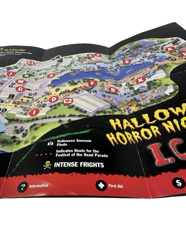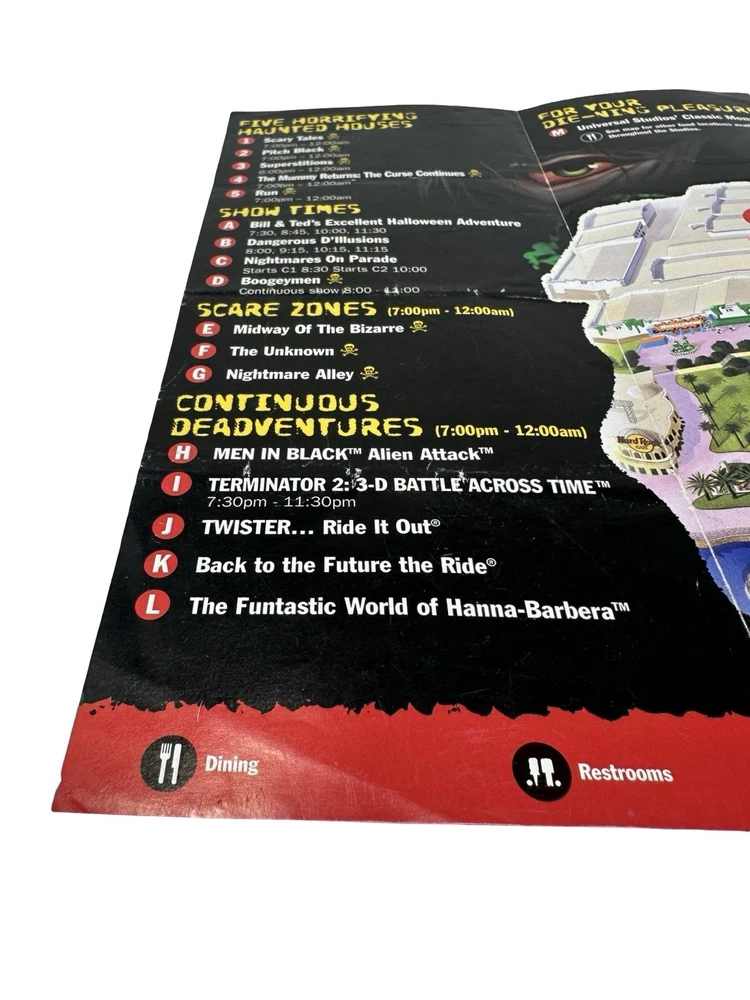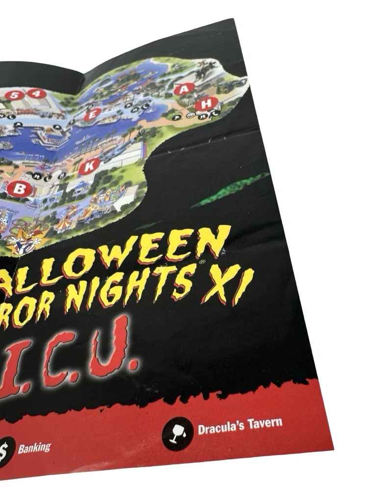 Offered here is an original Halloween Horror Nights XI (2001) Event Guide from Universal Studios Florida : These were distributed during the event and were typically used by guests navigating the park and attractions, meaning most examples were discarded after the event. Surviving guides from this era are increasingly scarce. Halloween Horror Nights XI is considered one of the most historically unique years in the event’s history . The event took place only weeks after the September 11, 2001 attacks , and Universal Studios had to quickly revise the tone, marketing, and theme of the event before opening in October. The event theme was “I.C.U.” , and the guide highlights many of the attractions from that year including: Haunted Houses The Mummy Returns: The Curse Continues Pitch Black Superstitions Scary Tales Run Shows & Entertainment Bill & Ted’s Excellent Halloween Adventure Dangerous D’Illusions Boogeymen Nightmares on Parade Scare Zones Midway of the Bizarre The Unknown Nightmare Alley The guide also includes a full event park map of Universal Studios Florida , attraction locations, show schedules, and period promotions featuring brands such as Fanta, Taco Bell, Ticketmaster, and Spencer Gifts . Because Halloween Horror Nights guides were temporary event materials meant for use during the night , they were rarely preserved. As a result, early HHN event guides have become collectible pieces of Universal Studios and theme park history . Collector Note This guide contains an interesting historical detail tied to Halloween Horror Nights lore. Inside the guide a specialty drink is listed as “Eddie’s Revenge.” The character Eddie was originally planned to be the main icon for Halloween Horror Nights XI. However, following the events of September 11, 2001, Universal Studios significantly toned down the event and removed most references to Eddie from marketing materials before the event opened. Small traces of the character remained in some printed materials produced earlier, including references such as the “Eddie’s Revenge” drink shown in this guide. Details like this make HHN XI guides particularly interesting to collectors of Halloween Horror Nights history. Features Original Halloween Horror Nights XI event guide Year: 2001 Location: Universal Studios Florida Theme: I.C.U. Includes: Fold-out park map and event guide Highlights: haunted houses, scare zones, show schedules Features attractions based on: The Mummy Returns, Pitch Black, and more Vintage Universal Studios theme park collectible Condition: used park guide with fold lines and handling wear (VG vintage Condition, please see photos) Condition Summary Used vintage condition with visible fold lines, creases, and bends from normal park use. No major tears or missing sections observed. Graphics remain clear and the guide appears complete. Please review all photos carefully as they are part of the description. Shipping & Returns Free US Shipping 30 day returns (must be returned in original condition)