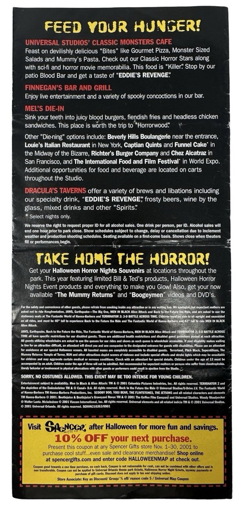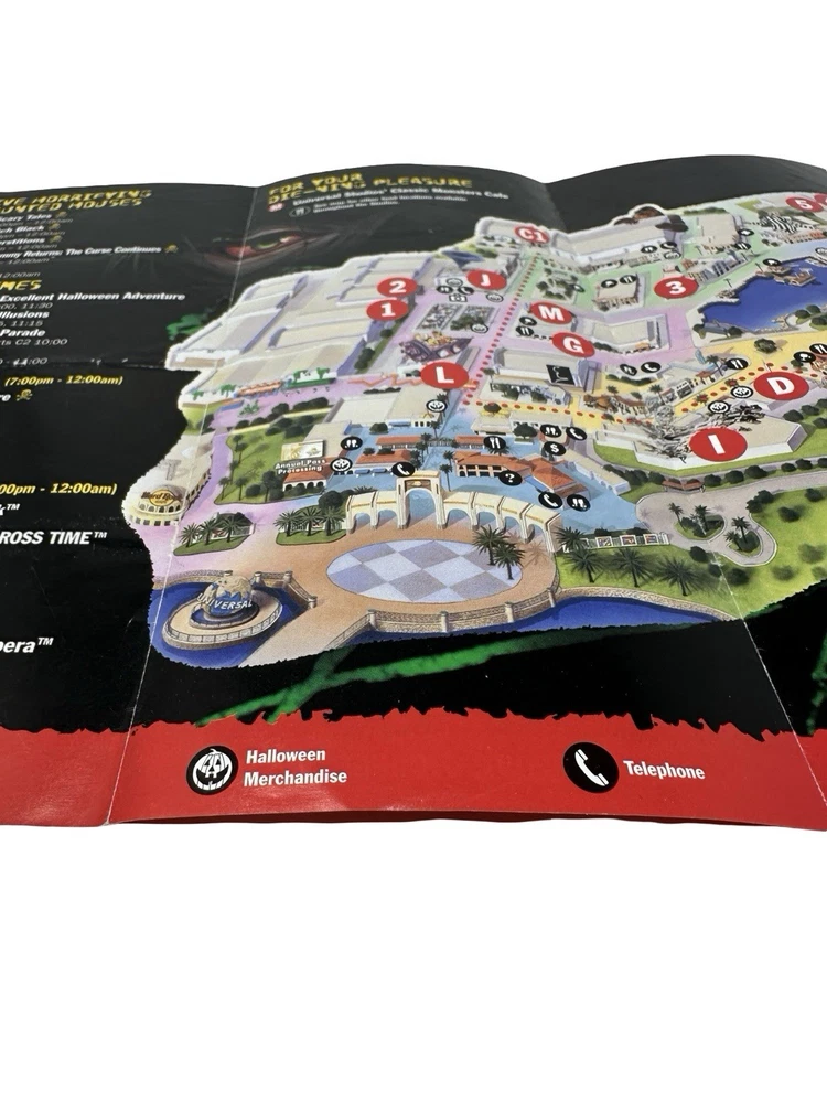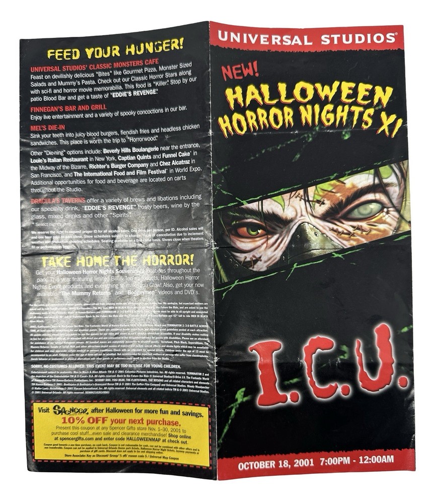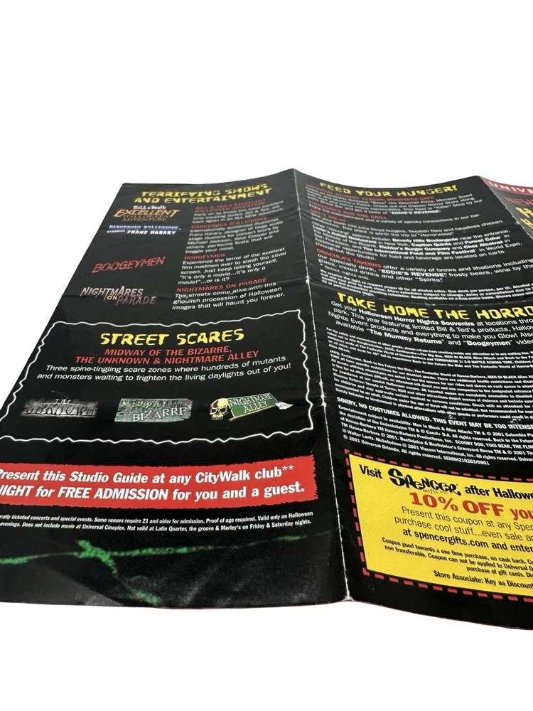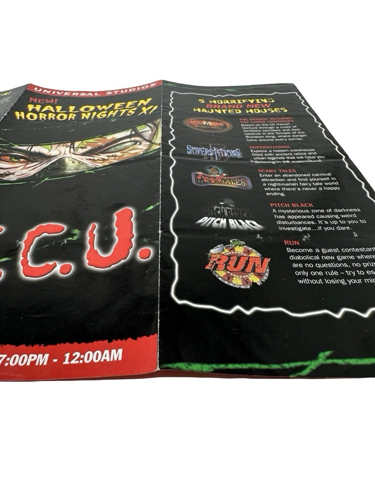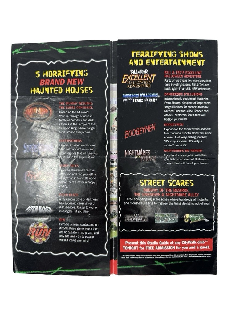 Offered here is an original Halloween Horror Nights XI (2001) Event Guide from Universal Studios Florida : These were distributed during the event and were typically used by guests navigating the park and attractions, meaning most examples were discarded after the event. Surviving guides from this era are increasingly scarce. Halloween Horror Nights XI is considered one of the most historically unique years in the event’s history . The event took place only weeks after the September 11, 2001 attacks , and Universal Studios had to quickly revise the tone, marketing, and theme of the event before opening in October. The event theme was “I.C.U.” , and the guide highlights many of the attractions from that year including: Haunted Houses The Mummy Returns: The Curse Continues Pitch Black Superstitions Scary Tales Run Shows & Entertainment Bill & Ted’s Excellent Halloween Adventure Dangerous D’Illusions Boogeymen Nightmares on Parade Scare Zones Midway of the Bizarre The Unknown Nightmare Alley The guide also includes a full event park map of Universal Studios Florida , attraction locations, show schedules, and period promotions featuring brands such as Fanta, Taco Bell, Ticketmaster, and Spencer Gifts . Because Halloween Horror Nights guides were temporary event materials meant for use during the night , they were rarely preserved. As a result, early HHN event guides have become collectible pieces of Universal Studios and theme park history . Collector Note This guide contains an interesting historical detail tied to Halloween Horror Nights lore. Inside the guide a specialty drink is listed as “Eddie’s Revenge.” The character Eddie was originally planned to be the main icon for Halloween Horror Nights XI. However, following the events of September 11, 2001, Universal Studios significantly toned down the event and removed most references to Eddie from marketing materials before the event opened. Small traces of the character remained in some printed materials produced earlier, including references such as the “Eddie’s Revenge” drink shown in this guide. Details like this make HHN XI guides particularly interesting to collectors of Halloween Horror Nights history. Features Original Halloween Horror Nights XI event guide Year: 2001 Location: Universal Studios Florida Theme: I.C.U. Includes: Fold-out park map and event guide Highlights: haunted houses, scare zones, show schedules Features attractions based on: The Mummy Returns, Pitch Black, and more Vintage Universal Studios theme park collectible Condition: used park guide with fold lines and handling wear (VG vintage Condition, please see photos) Condition Summary Used vintage condition with visible fold lines, creases, and bends from normal park use. No major tears or missing sections observed. Graphics remain clear and the guide appears complete. Please review all photos carefully as they are part of the description. Shipping & Returns Free US Shipping 30 day returns (must be returned in original condition)