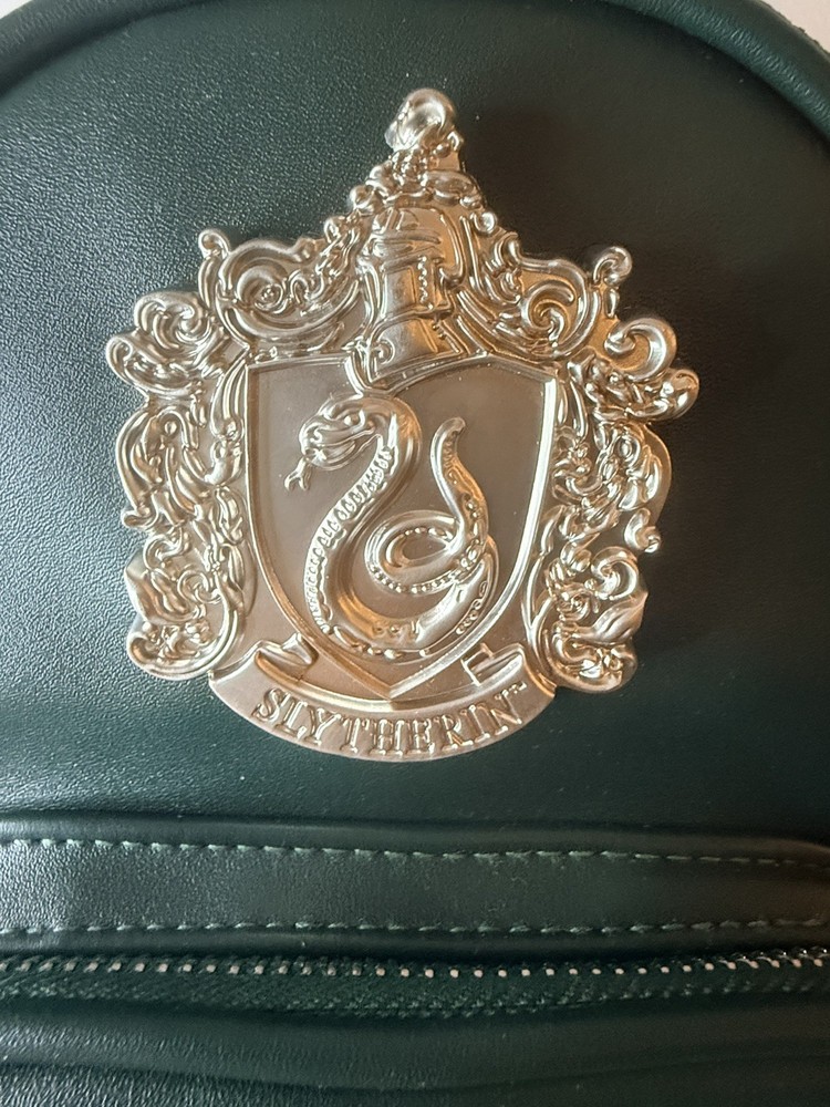 The product is a Universal Studios Harry Potter Slytherin Crest Mini Backpack in emerald green, designed as a purse. This collectible item is part of the Wizarding World brand, inspired by the fantasy franchise Harry Potter. The backpack features the iconic Slytherin crest, making it a must-have for fans of the magical world created by J.K. Rowling. Perfect for showcasing one's allegiance to the house of Slytherin or for adding a touch of fantasy charm to any outfit.