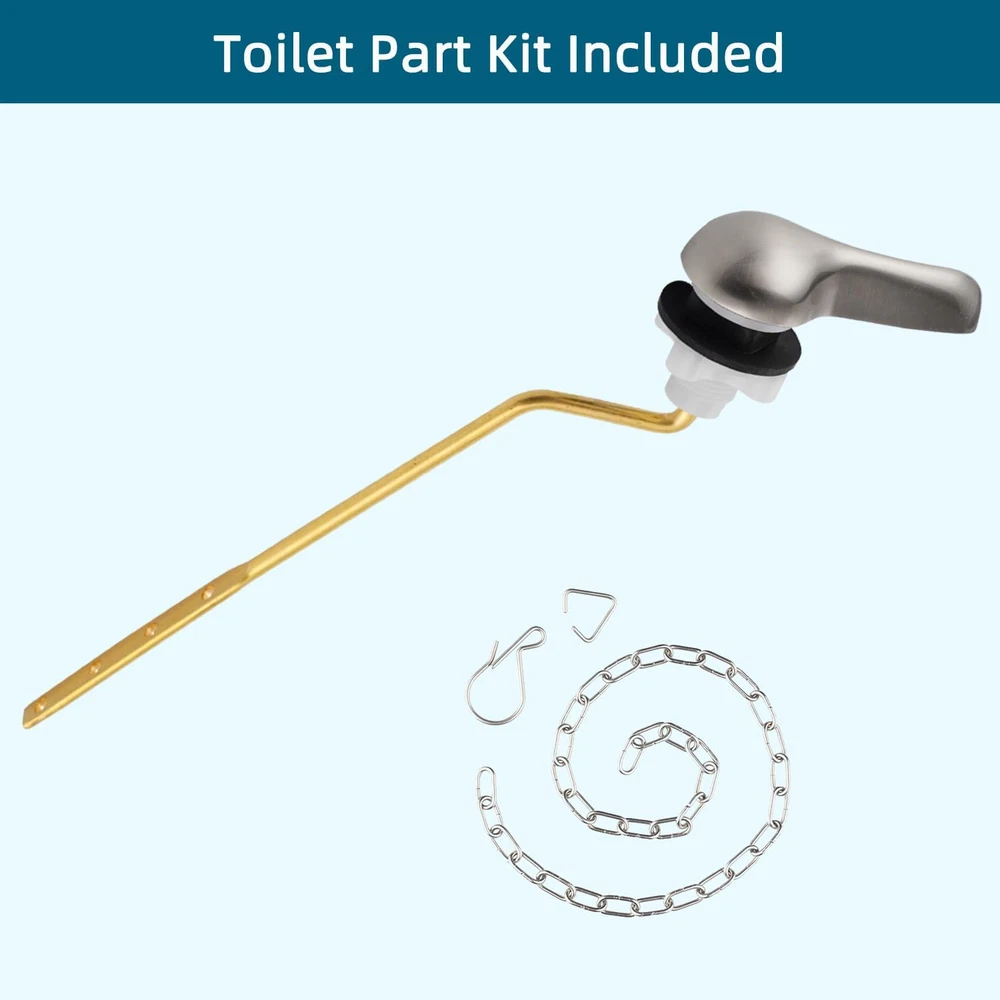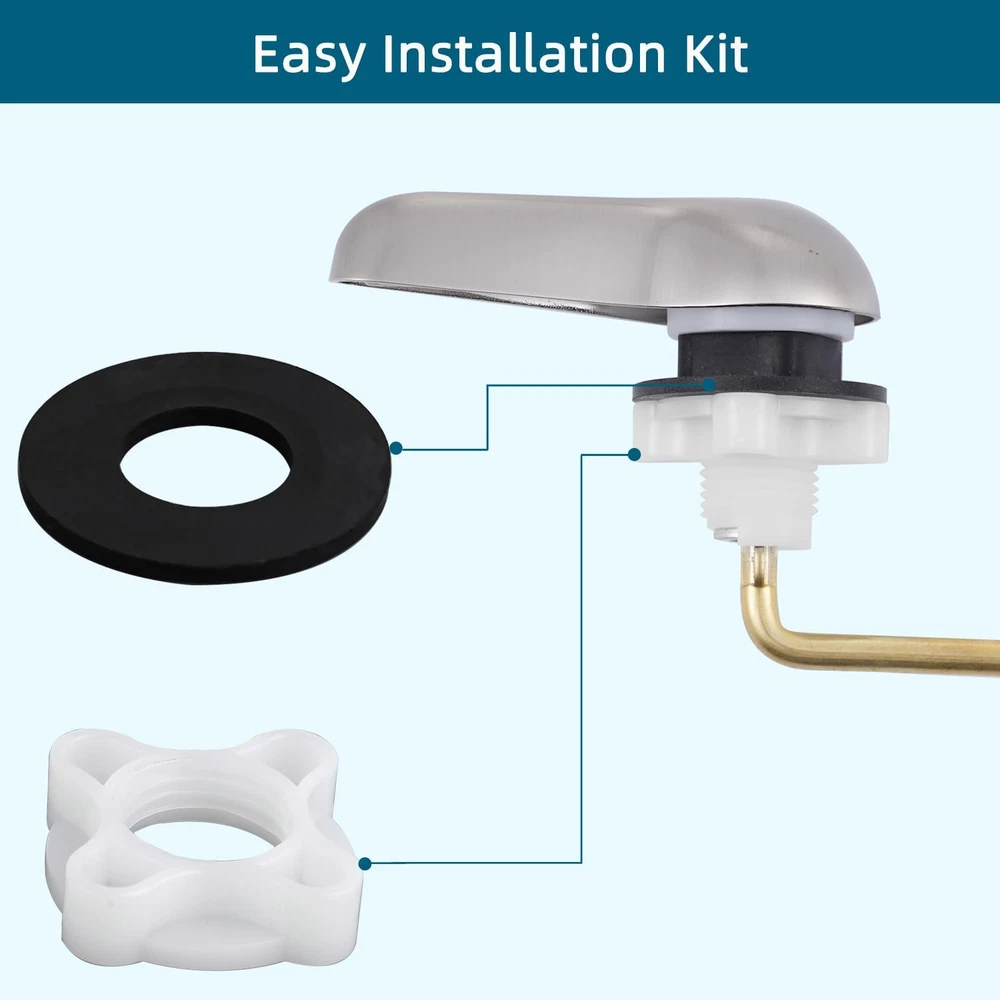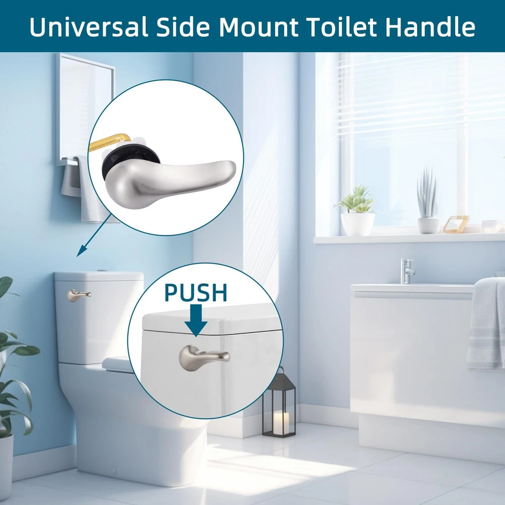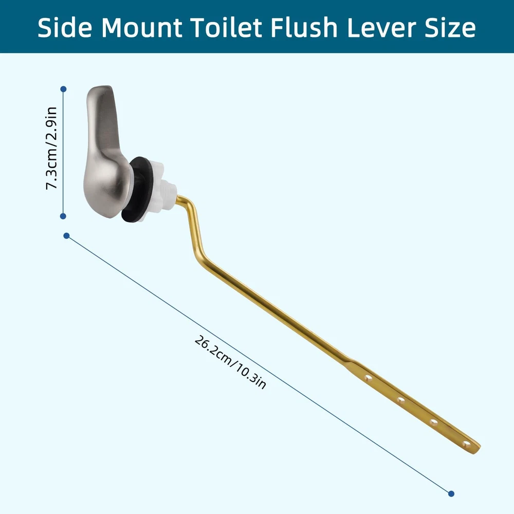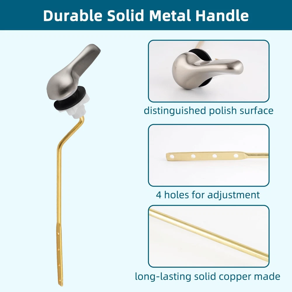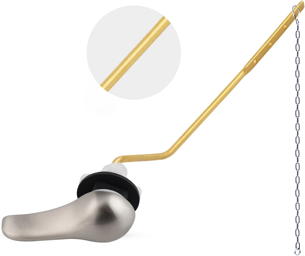 Universal Side Mount: The toilet tank lever is a high quality handle arm construction with a Side mount design, nice for almost all common toilet tanks Toilet Flush Lever Size: Wrench width: about 8 cm/3.1 in; Lever length: about 21 cm/8.26 in; Flapper chain length: about 35.3 cm/13.9 in Easy to Install: The toilet tank lever is not too large and you can fix it by hand, without any tool, taking minutes Metal Handle: Made of a solid brass handle and Brushed Nickel plated wrench, which will last for a long life and be rustless Package Included: 1pc toilet flush handle front mount + 1pc stainless steel flapper chains, a good toilet part to replace your old toilet tank kit Product Description Brushed Nickel Finish Front Flush Lever Good Plastic Nut Lock Metal Lever Handle Toilet Flapper Chain Included FIND MORE TOILET HANDLE REPLACEMENT HERE! Add to Cart Add to Cart Add to Cart Add to Cart Customer Reviews 4.4 out of 5 stars 99 4.4 out of 5 stars 99 4.5 out of 5 stars 678 4.3 out of 5 stars 145 4.5 out of 5 stars 678 4.3 out of 5 stars 145 Price — — $14.99 $ 14 . 99 $20.99 $ 20 . 99 $15.99 $ 15 . 99 $21.99 $ 21 . 99 Style Front Mount Front Mount Front Mount Front Mount Side Mount Side Mount Package 1pc 2pcs 1pc 2pcs 1pc 2pcs Material ABS+Brass ABS+Brass ABS+Brass ABS+Brass ABS+Brass ABS+Brass Brushed Nickel Color ✔ ✔ ✔ ✔ ✔ ✔ Easy to Install ✔ ✔ ✔ ✔ ✔ ✔