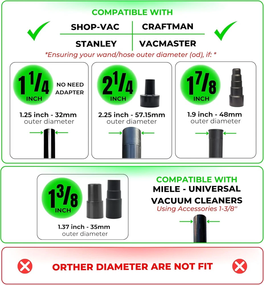 Universal Vacuum Attachments & Brushes Kit - Hardwood Floor Black Product Details Material: Plastic Brand: GHAMADE Color: Black Item dimensions L x W x H: 12.7 x 6.67 x 4.21 inches Connector Type: Adapter Exterior Finish: Plastic Thread Type: NPT Item Weight: 1.5 Pounds Number of Pieces: 9 Manufacturer: GHAMADE 【Wide Compatibility】 Vacuum attachments are suitable for Most Vaccum (not all ). Vacuum adapter kit includes 2 1/2" to 1 1/4" Vacuum Hose Adapter and 1 7/8" to 1 3/8" to 1 1/4 to 1" vacuum adapter to provide you a wide application which can meet all your different needs in daily clean, and suitable for most vacuum. Not Fit for shop vac accessories with 2 1/4 inch inner diameter. 2 1/2" to 1 1/4" Vacuum Hose Adapter】 Fits most 2-1/2" and 1-1/4" hose systems. 2.5" to 1.25" reducer enables you to use all your 1 1/4" inner diameter vacuum attachments with 2 1/2” inner diameter vacuum cleaner. Big end measures 2.44" OD and 2.26" ID. Small endmeasures 1.18" OD and 1" ID. Upgraded Vacuum Floor Attachment: Works on low carpets and all floor surfaces (hard floors, hardwood floors, bare floors). It effectively removes pet hair from floor surfaces. Flexible Crevice Tool for Hard to Reach Place: can tackle dust in hard-to-reach places around your home and car and can remove lint from the dryer vent as well, Great for corner, heating ducts, under furniture and car seat, along side the refrigerator. 【Vacuum attachments including】 2 1/2" to 1 1/4" Vacuum Hose Adapter, 1 7/8" to 1 3/8" to 1 1/4 to 1" Vacuum Adapter, 12in wide Vacuum Brush Attachment, 1 1/4" Horsehair Vacuum Brush, 1 1/4" Flexible Crevice Tool, 1 1/4" Vacuum Crevice Tool, 1 1/4" Upholstery Tool Attachment, 1 1/4" Utility Nozzle with Removable Plastic Brush, 1 1/4" Brush & Nozzle Combination Tool.