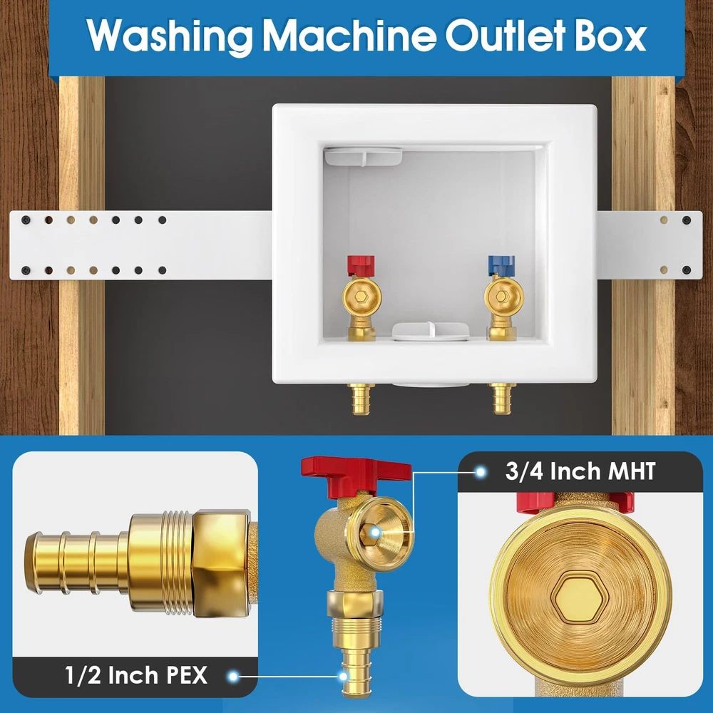 Package Includes: Washing Machine Outlet Box, 1/2-Inch Pex Crimp Connection x 3/4 Inch MHT; Support Bracket ×2 Pipe Compatibility: This pex washing machine outlet box is with crimp pex fitting system, NOT with expanding fitting system. The box is equipped with 1/4-turn hot and cold shut off valves; the inlets of washing machine box work well with 1/2 inch PEX pipes; the outlets fit well with 3/4 inch MHT washing machine hoses Long Lasting: The washing machine outlet box is made from high-quality C46500 brass, known for its high corrosion and abrasion resistance. This material ensures long-lasting performance and reliable water flow Standards Compliance: The washing machine outlet box meets American standards and complies with UPC and NSF requirements, ensuring adherence to strict safety and quality standards Versatile Applications: 1/2 pex washing machine outlet box allows for inverted installation and provides solutions for a range of residential washing machine applications. It features a recessed design and features a snap on frame which accommodates to drywall Flexible Installation: The washing machine outlet box is perfect for connecting your washing machine or water dispenser to your water supply