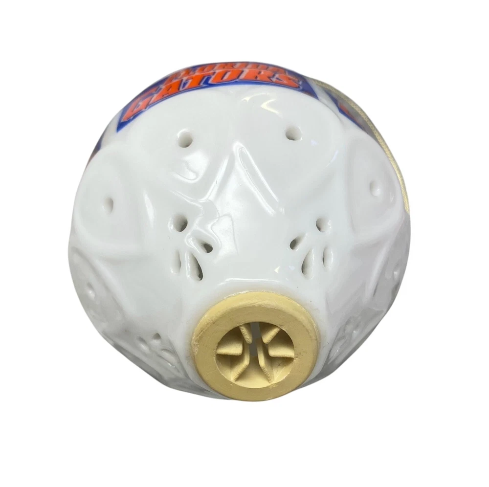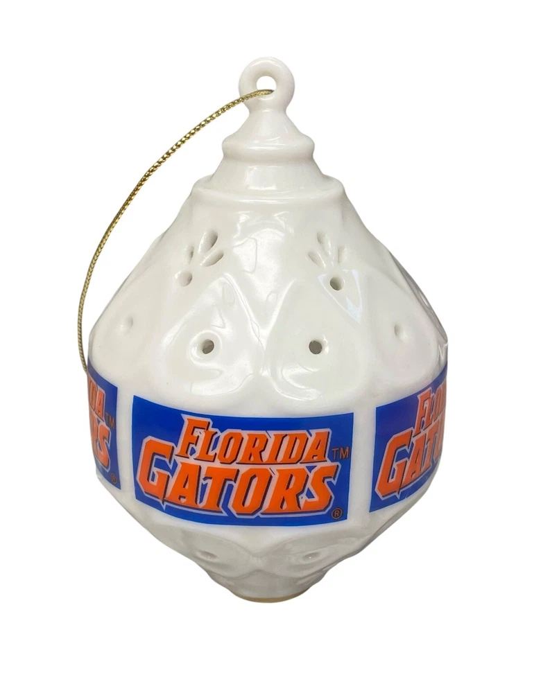Add some holiday spirit to your collection with this beautiful University of Florida Gators Christmas ornament from Danbury Mint. The ornament features a stunning design with the team's iconic blue, orange, and white colors. Made from high-quality porcelain, this hanging decor piece is perfect for any Gators fan looking to add some festive cheer to their home. This medium-sized ornament measures 4 inches in height and 4 inches in length, making it the perfect addition to any Christmas tree. The ornament is part of the Danbury Mint Florida Gators collection, and is a great gift for any collector or fan of the team. Celebrate the holidays and show off your team spirit with this one-of-a-kind ornament. You just put one of the string lights from your Christmas tree into the bottom to illuminate it.