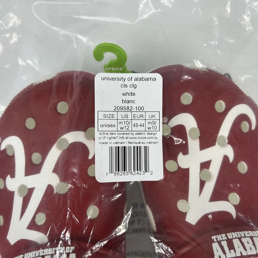 Features: Ankle Strap, Breathable, Comfort Character: Al the elephant Type: Casual Upper Material: Synthetic Theme: College, University of Alabama, University, Crimson Tide Occasion: Activewear, Casual, Travel Color: Crimson Red Brand: Crocs Vintage: No UK Shoe Size: 9 Department: Unisex Adults Model: Classic Croc Style: Clog US Shoe Size: 10 Accents: Logo EU Shoe Size: 43