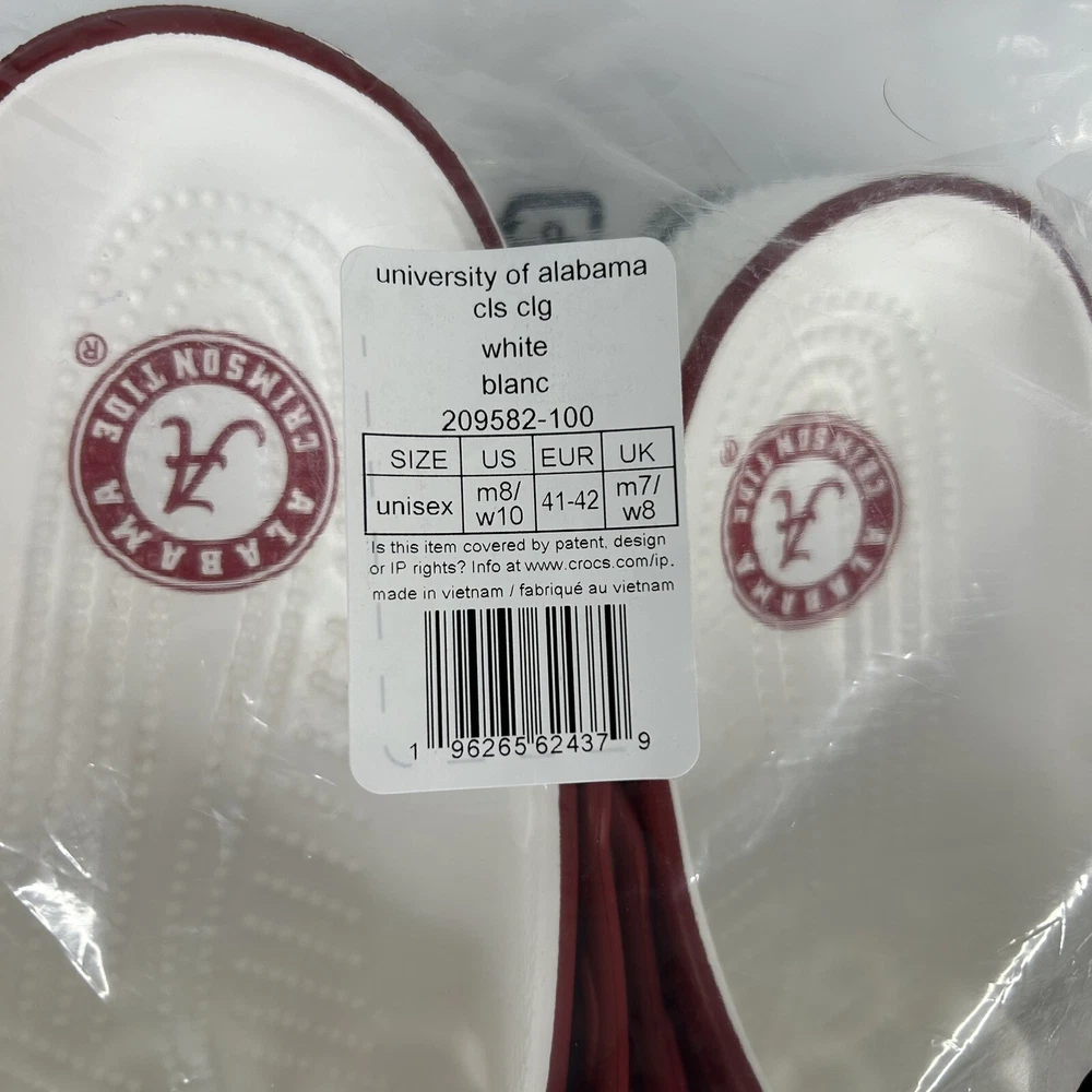 Type: Casual UK Shoe Size: 7 Theme: College, University of Alabama, University, Crimson Tide Character: Al the elephant Vintage: No Style: Clog Department: Unisex Adults Model: Classic Croc Occasion: Activewear, Casual, Travel Color: Crimson Red US Shoe Size: 8 Accents: Logo Upper Material: Synthetic Brand: Crocs Features: Comfort, Breathable, Ankle Strap EU Shoe Size: 41