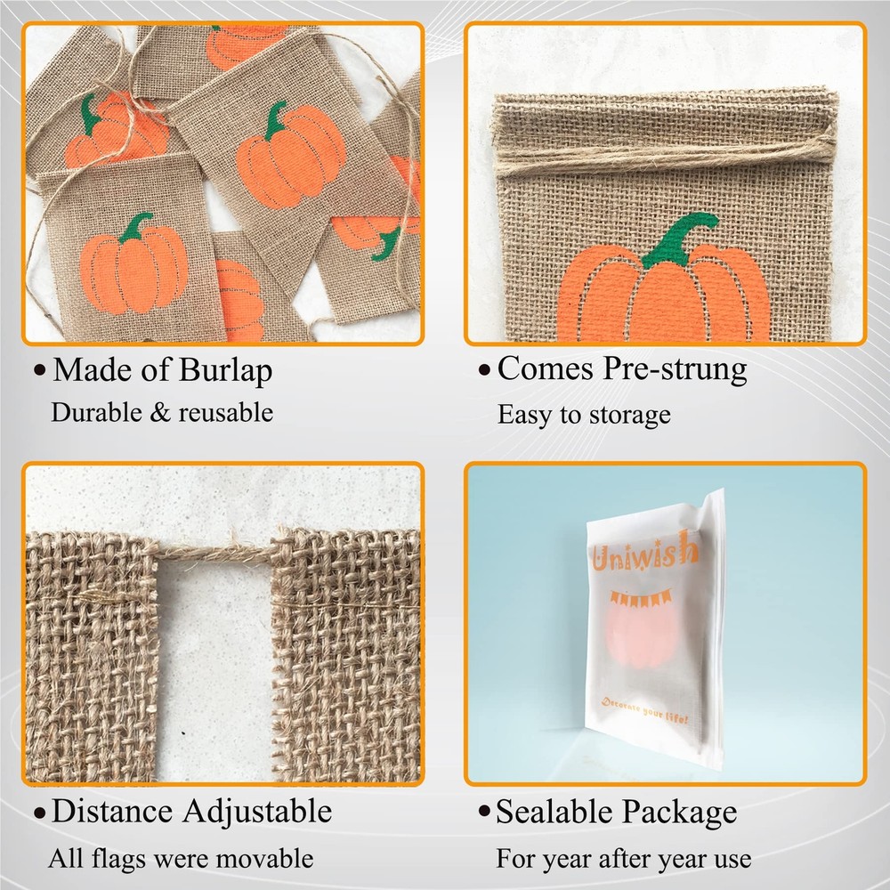 Uniwish Pumpkin Banner Happy Fall Y’all Garland Thanksgiving Day Decorations Birthday Baby Shower Home Décor Rustic Harvest Bunting Warmly welcome family and friends to celebrate Thanksgiving with this festive pumpkin banner. Use it as a photo prop and then hang it over the dessert table at the party. Perfect for cozy holiday mantels, adds rustic fall favor to the home. It will be great for all your fall theme party decorations! Perfect for autumn home décor, too! How to use: Banner comes PRE-ASSEMBLED! You can hang and move to any location you like. Where to use: Fall Wedding, Baby Shower, Pumpkin Patch Photo Props, Garland Birthday Party, Dessert Table Decorating, etc. Package included: 1 x Pumpkin Sign Kindly Note: The product is made of natural jute; it will send out jute smell, please ventilation before use and keep away from fire! We have been focusing on improving product quality and providing good service, any questions please don't hesitate to contact us, you'll receive satisfied reply within 24 hours. Click "Add to Cart" button and buy it now! CONVENIENT: Pre-strung, no assembled required MATERIAL: 100% natural burlap made, durable and reusable SIZE: Each flag measure 5 x 7 inch, the rope is 8.2 feet; Easy to hang and storage PHOTO SHOOT PROP: The pumpkin sign is sure to make your party pop out as the centerpiece of all your fall themed party decorations VERSATILE: Hang it across windows, along tables or at the top of a doorway, adds the Thanksgiving feel of the house Shipping from the USA All of our products are shipped from the USA, ensuring quick delivery to your destination. Payment We offer the following payment methods: PayPal, credit card, bank transfer, and eBay's secure payment system. Free Shipping & Free Returns Shipping within the USA is FREE. Additionally, any return is absolutely free for you. Risk-Free Purchase You have the option to return an item within 30 days without any justification. We cover the return shipping costs! Fast Shipping We ship immediately upon receipt of payment. Generally, the package is delivered within 2-3 days in the USA. If it takes longer, we will contact you. Quality and Costs Made in Europe, USA, China No customs fees or additional charges Total satisfaction guarantee Invoice with declared VAT available upon request in .pdf format Feedback Your feedback is very important to us. After you pay for your purchase, you will automatically receive positive feedback from us.