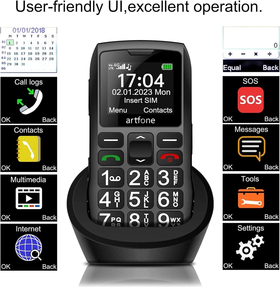 Why Choose Artfone C1+ 4G, SOS Button Phone? If you are looking for a simple, easy-to-use, and reliable phone for yourself or your loved ones, you should consider the Artfone C1+ 4G phone. This phone is specially designed for seniors, kids, and visually impaired people who need a phone that can make calls, send texts, and perform basic functions without any hassle. The Artfone C1+ 4G, SOS button phone has many features that make it stand out from other similar products on the market. Here are some of them: Unlocked to T-Mobile, MetroPCS, SpeedTalk, Tello and RedPocket GSMT 4G Nano SIM Card. Please note that this phone is NOT compatible with AT&T, Cricket or with any CDMA Networks like Verizon, Sprint, and Boost Mobile. Product specifications: Chipset: Spreadtrum T107 CPU frequency: 1000MHz Display: 1.77-inch QVGA Battery capacity: 1400 mAh Standby time: 240-300 hours Headphone jack: 3.5 mm Card slots: Single standard SIM card + 1 SD card Micro SD Card: Support (expands up to 32GB) Speaker: Yes Headphone jack: 3.5 mm socket Flash memory: 128 + 48 MB 4G bands:FDD B2/4/5/12/13/17/26/66+TDD B41 Support languages: English, German, French, Italian, Spanish, Polish, Dutch, Czech, etc. Functions: Flashlight, SOS button, support headphones (not included) Packing included: 1 x Mobile phone 1 x Charging station 1 x USB charging cable 1 x Instruction 1 x Charger Supports 4G Nano SIM Card and Report the Real-time You can use 4G nano SIM card from carrier, and enjoy fast and stable connectivity wherever you go. You can also press and hold the volume + key to hear the time in real time, which is very convenient for those who have difficulty reading the screen. Backlit Large Buttons, Large Font and Large Icon Software One of the most common problems that seniors, kids, and visually impaired people face when using a phone is the difficulty of seeing and pressing the buttons, and reading the text and icons on the screen. The Artfone C1+ 4G phone solves this problem by having backlit large buttons that are easy to see and press, even in the dark. The phone also has large font and large icon software that makes the menu and interface clear and simple to navigate. You can adjust the font size and contrast according to your preference and comfort. AAC Receiver, 2030 Large Speaker Box Another common problem that seniors, kids, and visually impaired people face when using a phone is the poor sound quality and volume of the calls. The Artfone C1+ 4G phone solves this problem by having an AAC receiver and a 2030 large speaker box, similar to the iphone’s AAC receiver, that ensure loud and clear calls every time. The AAC receiver reduces the background noise and enhances the voice clarity, while the 2030 large speaker box amplifies the sound and delivers rich and crisp audio. You can also use headphones (not included) to listen to the calls privately. Multifunctional, Built-in Audio, Video, Bluetooth, FM Audio, etc. The Artfone C1+ 4G button phone is not just a phone, but also a multifunctional device that can entertain and assist you in various ways. The phone has built-in audio and video players that can play your favorite songs and videos from the micro SD card (not included, expands up to 32GB). The phone also has Bluetooth and FM audio functions that allow you to connect to other devices and listen to the radio wirelessly. The phone also has a calculator, an alarm clock, a calendar, and a flashlight that can help you with your daily tasks. The phone can store up to 100 phone book entries, which is very convenient for keeping in touch with your family and friends. High-end Chip T107, Stable Quality and Performance The Artfone C1+ 4G phone is powered by a high-end chip T107, which not only improves the phone’s network signal, but also makes the phone stable in quality and performance. The phone does not malfunction or freeze during operation, and can handle multiple tasks smoothly and efficiently. The phone also has 128 + 48 MB of flash memory, which is enough for storing your basic data and files. High-quality Lithium Battery, Long-lasting Power The Artfone C1+ 4G phone has a high-quality lithium battery that provides long-lasting power for your phone. The improved 1000 mAh battery has a higher battery capacity than any similar product, and can support uninterrupted talk time of 4-5 hours and standby time of 200 hours (8-10 days). The phone also has two charging methods, one is to use the USB cable alone, and the other is to use the charging base. The charging base is very convenient and safe to use, as you just need to slide the phone into the charger and it will start charging automatically.
