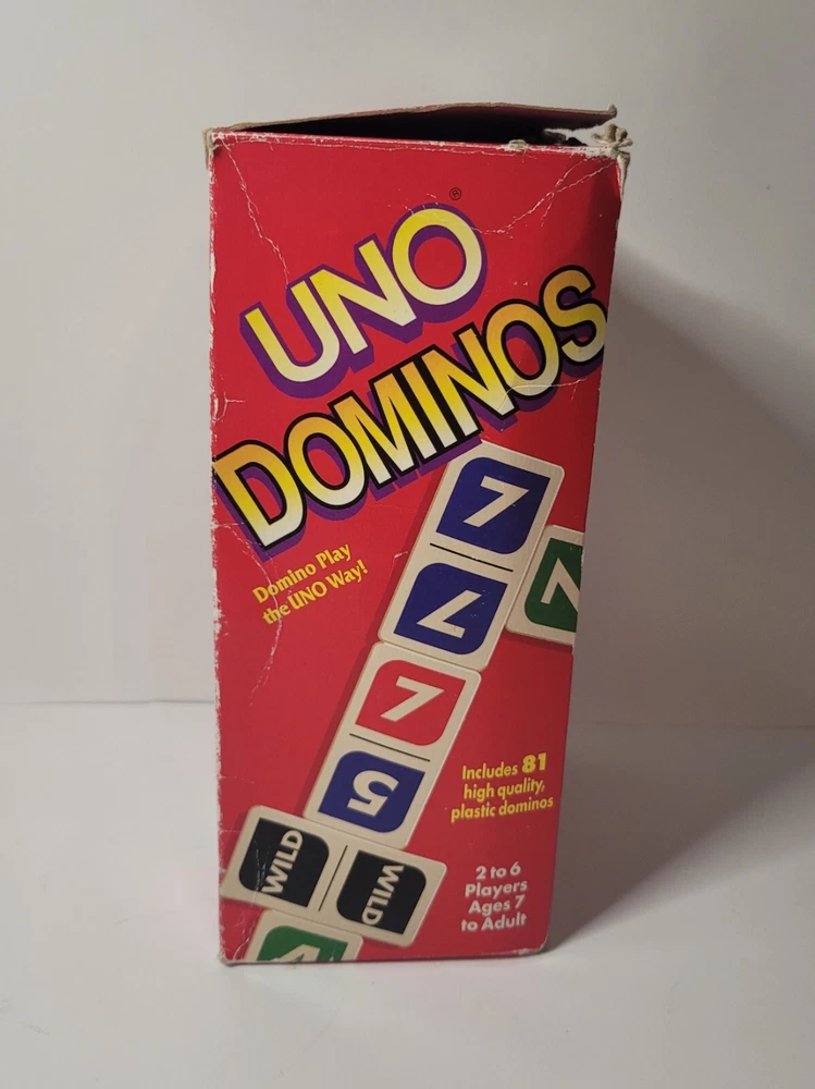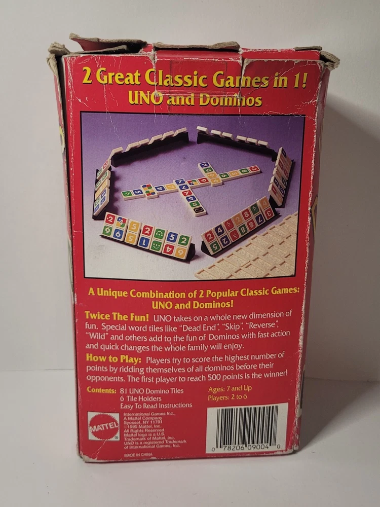 This is a complete game of Uno Dominos produced by Mattel in 1995. The game includes 81 domino pieces and 6 tile holders. It is a family game that can be played with a minimum of 6 players. The game title is Dominoes and it is a strategy game. The game comes in an open box and the brand is Mattel.