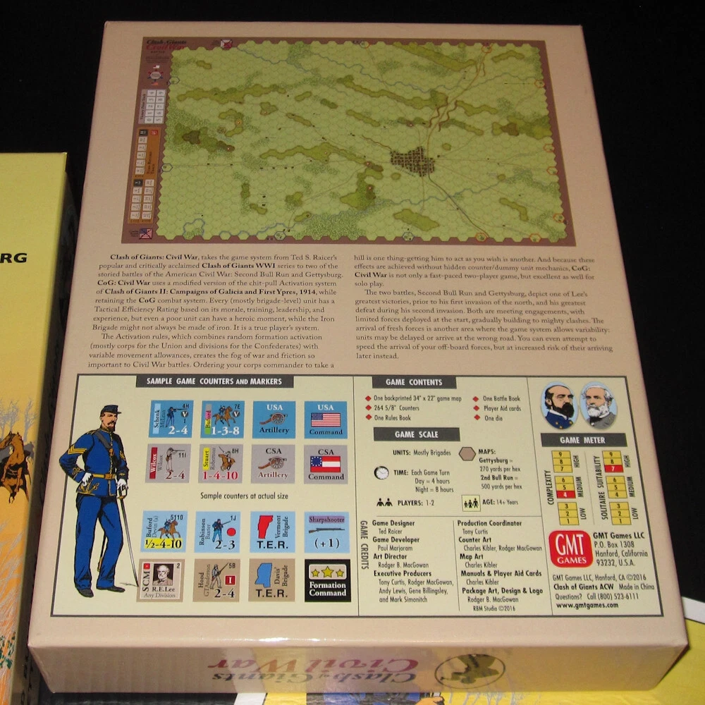Unpunched GMT Games ***CLASH OF GIANTS: CIVIL WAR*** 2016 Battle of Gettysburg Second Bull Run Wargame 1603 Complete with all game components in excellent (near mint) condition. Box is in excellent condition. Includes: box double sided game map 4x charts/player aid cards 2x unpunched counter sheets 2x d6 dice storage bags 2x rules booklets Free USPS ground advantage shipping in the USA; thanks for looking!