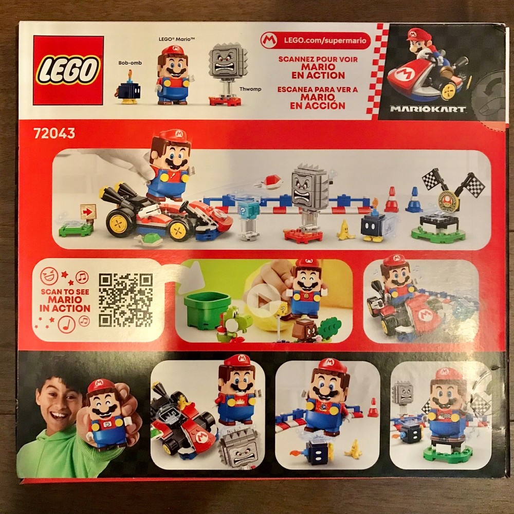 I have this in hand. Ready to ship immediately! The set includes an interactive LEGO Mario toy figure and a Standard Kart with with a shell-launching function. Structures included are a start area, connectible track barriers, traffic cones, and a winners circle. LEGO Mario interacts with green and red LEGO plates, triggers Mario Kart sounds and visual effects, and can earn digital rewards from the Item Box, as well as defeat Bob-omb and Thwomp.