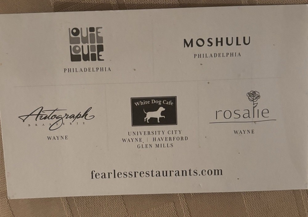 Fearless restaurants gift card. Never been used. Balance is $100. I can provide email verification of balance if needed. Will include pape Sleeve, but middle Will be cut Out due To personal message. Able to be used at restaurants in the Philadelphia area, perhaps even elsewhere. To be used at the following Philadelphia area restaurants: Louie Louie Moshulu White Dog Cafe Rosalie Autograph