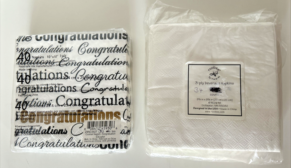 Leftover lot of graduation napkins - not used - 30 -3 ply "Congratulations" napkins 10"x10" and 34-3ply "cap" napkins 9 7/8" x 9 7/8"