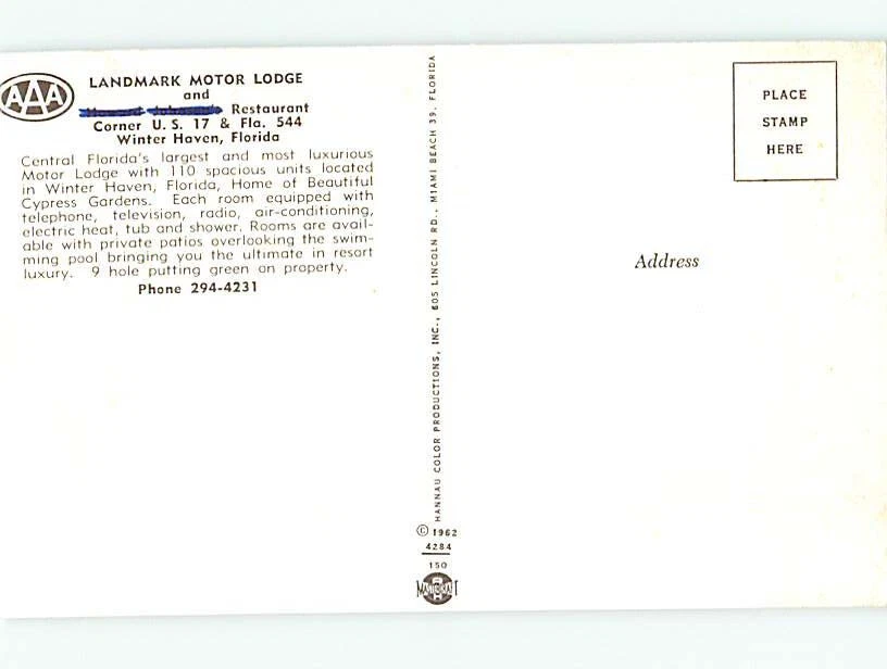 Unused Pre-1980 LANDMARK MOTEL & RESTAURANT Winter Haven Florida FL M3985