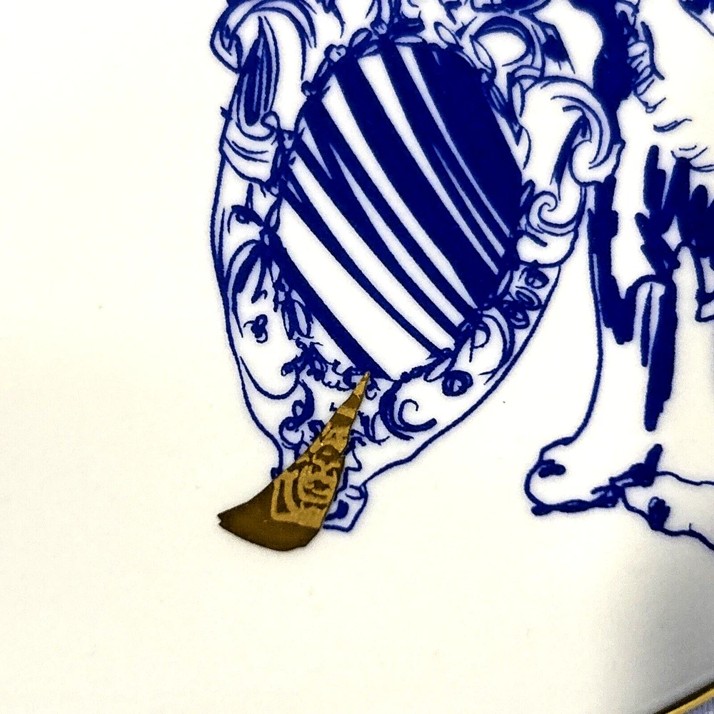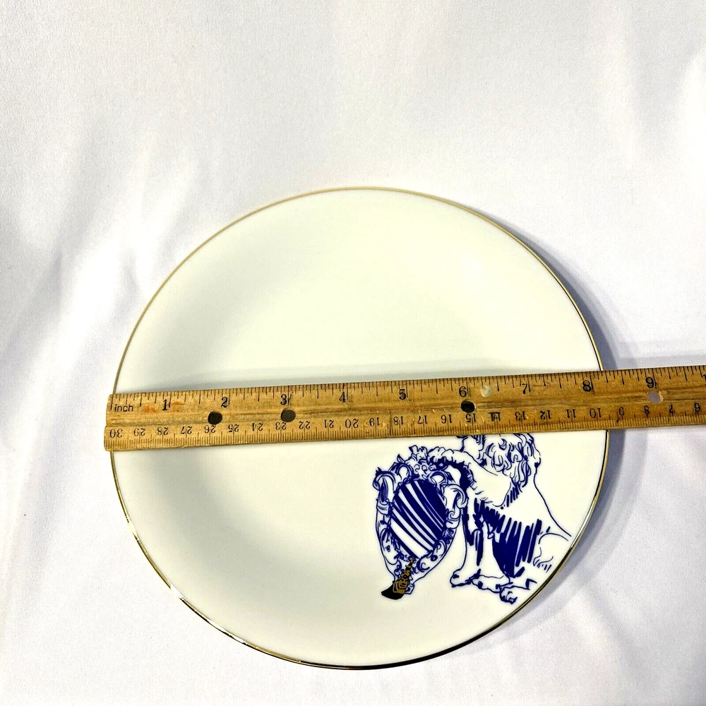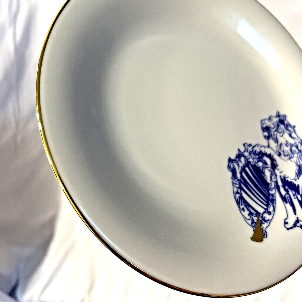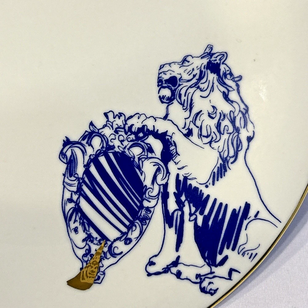 This beautiful and unusual salad plate from Kulturgut is a must-have for any collector. The round white porcelain plate has a diameter of 8.25 inches and features a stunning lion design inspired by Bavaria's Bayerns Lowen. The plate is an original 21st-century piece and is printed with the brand's backstamp. Hand wash only and perfect for any contemporary style setting, this plate is a great addition to any decorative cookware, dinnerware, and serveware collection. The set includes one plate and is an ideal choice for anyone who loves Bavarian culture. Cream background with blue lion design. Gold rim and design accent. 8.25" diameter. Maker's mark on back. Thank you for looking! 56893991024
