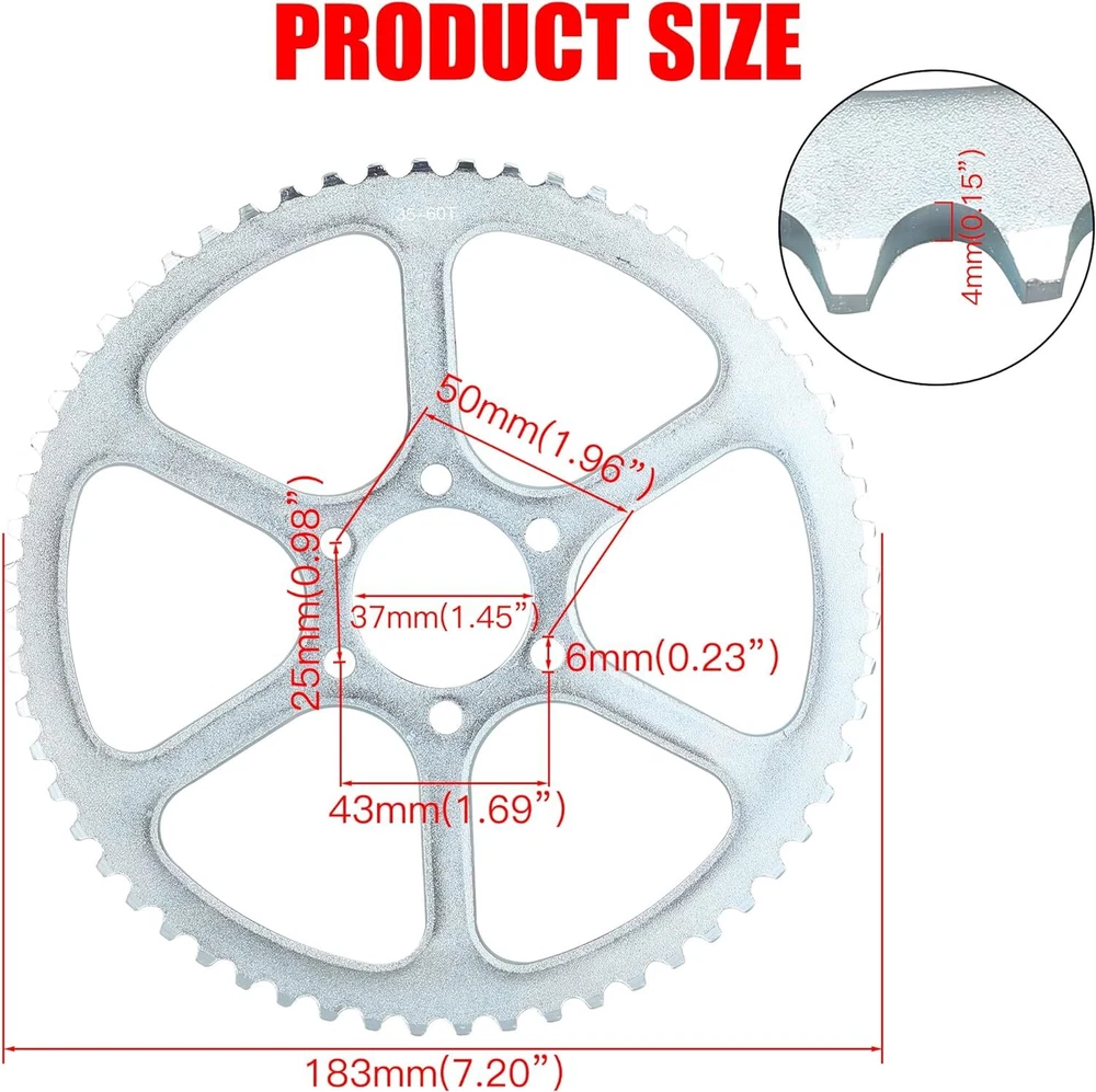 Upgrade #35 Chain 60 Tooth Rear Drive Sprocket Cog for 98Cc 3.5Hp Coleman CT100U FITMENT—60 tooth sprocket 35 chain fit for 98cc 3.0HP Colema* CT100U CC100X mini bike parts,Colema* CK100 SK100 go kart. Compatibility: 35 chain sprocket is compatible with Baja Motorsports Doodle Bug DB30, Hensim Doodle Bug DB30, Motovox MBX10 MBX11, Monste* Moto/Mega Moto Classic 80cc MM-B80 /105cc MM-B105/1000w electric mini bike drift trike profile 6 Hole. HIGH QUALITY MATERIAL & EASY TO INSTALL—the 60 tooth #35 chain rear drive sprocket uses a combination of ultra-high strength substrate material and an extremely wear-resistant surface, significantly increases the service life of the sprocket, is durable and can be used for a long time. The chain sprocket has 60 teeth sized for #35 chain and it has 6 inner mounting holes, a weight reduction design and is lightweight for easy installation and use. PLAYING AN IMPORTANT ROLE—the rear drive chain sprocket is an important part of the drive system and makes the chain drive more stable and efficient. In the same condition of the front sprocket unchanged, larger rear sprocket can increase torque and climbing ability, and the smaller rear sprocket can increase speed and save fuel. It can perfectly replace the old original one. PRODUCT SIZE—#35 Chain,Teeth: 60 Tooth/ Mounting Hole Distance (center to center, bolt hole circle): 50mm (2.0 inch)/ Center Hole Diameter: 37mm (1.46 inch)/ Overall Diameter: 227mm (8.94 inch)/ Mounting Hole Diameter: 6mm (0.26 inch)x6. NOTE—please check as much as possible to the item picture, model and size carefully before purchasing.Or leave us messages for assistance if you're not sure if the ct100u chain sprocket fits. Shipping We offer FREE shipping on all orders! We ship within Three business days of payment, usually sooner. We use a selection of shipping services such as UPS, FedEx, USPS etc. We only ship to the lower 48 states, no APO/FPO addresses or PO Boxes allowed. Local pickups and combined shipping options are not provided at this time. Return You can return a product for up to 30 days from the date you purchased it. Any product you return must be in the same condition you received it and in the original packaging. Please keep the receipt. Payment We accept payment by any of the following methods: PayPal Please pay as soon as possible after winning an auction, as that will allow us to post your item to you sooner! Feedback Customer satisfaction is very important to us. If you have any problem with your order, please contact us and we will do our best to make you satisfied. Contact Us If you have any queries, please contact us via ebay. We usually respond within 24 hours on weekdays. Please visit our eBay store to check out other items for sale! Thank you for shopping at our store.