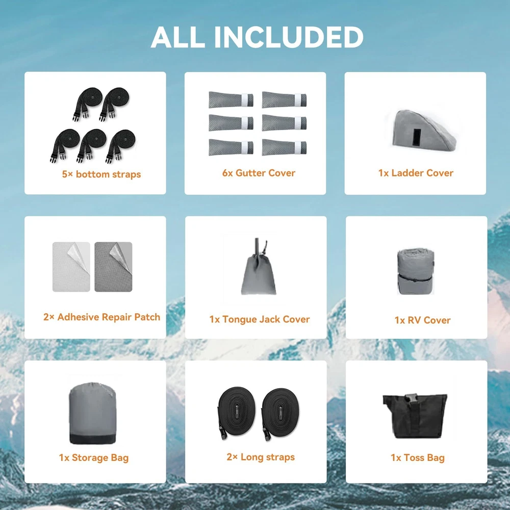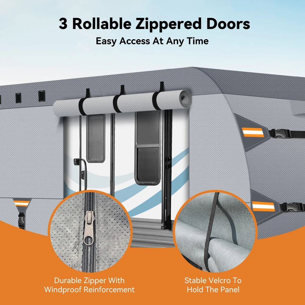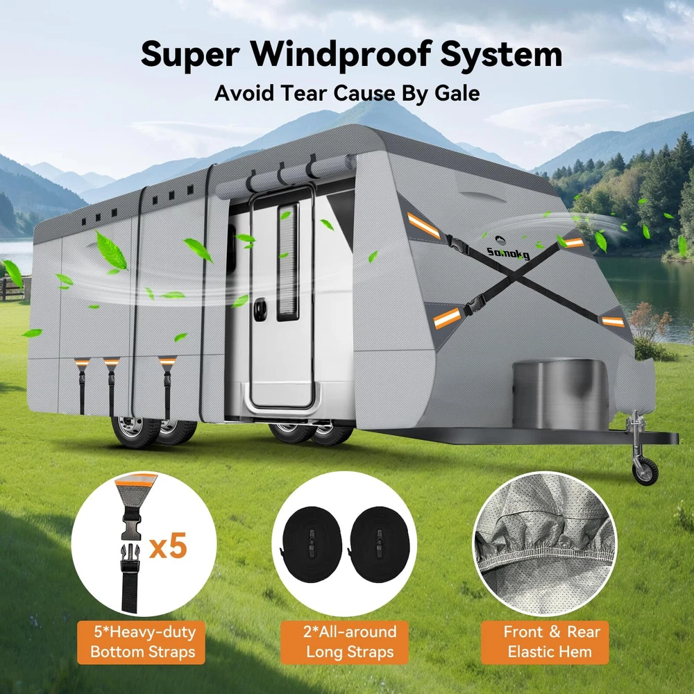 Upgrade 7 Layers RV Cover 30-33 FT, Somokg Heavy Duty Travel Trailer RV Cover, Utility Trailer Cover for Snowproof, Rip-Stop Camper Cover with 5+2 Windproof Straps & Abundant Kit PREMIUM FABRIC & INNOVATIVE TECHNIQUE - Somokg RV cover is crafted from upgraded 7 layers non-woven fabric that combines anti-UV coating, watertight membrane & heat insulating material, which offers exceptional protection agains UV, rain, snow and scratches, ultimately preventing aging and prolonging service life. The trailer cover features tight & double stitching and is thickened at the top, edges & cornors, which can resist tear strength up to 400 lbs without cracking at stress points. WINDPROOF & SNOWPROOF - Our trailer cover provides super windproof, with elastic hem, 5 reinforced bottom straps & 2 extra long straps to keep the RV cover firmly fixed on the camper without being blown away. The camper cover features a 4-sided tension panel to increases the force area, thus reducing the impact of wind pressure to avoid ripping. The RV cover has built-in snowproof material that blocks snow penetration and easy to clean up, preventing direct damage to the RV from heavy snow. VENTILATION & NIGHT SAFTY - There are 6 air vents strategically placed on the RV cover(1 on front and rear, 2 on both sides), which can maximize air circulation to reduce internal humidity and wind pressure. Besides, the breathable fabric of camper cover can speed up water evaporation to keep the RV dry all the time. Each side of the trailer covers has reflective strips with high visibility to make your camper easily to be noticed in night & dark, avoiding collisions for safety. EASY INSTALLATION & ACCESSIBILITY - The lightweight RV cover is easy to install and disassemble with simple structure and quick-release buckles. The sewn-in front label inside the RV cover helps users to indicate correct orientation when mounting. When in not use, the camper cover can be folded in the attached storage bag without taking up space. The trailer cover comes with 3 rollable doors and quick zippers in passengers side, allowing users to access the motorhome conveniently at any time. PACKING LIST & 24-MONTH SUPPORT - 1 * RV Cover; 1 * Storage Bag; 5 * Bottom Strap; 2 * Extra Long Straps; 6 * Gutter Cover; 1 * Ladder Cover; 1 * Tongue Jack Cover; 2 * Adhesive Repair Patch; 1 * Toss Bag; 1 * User Manual. Somokg travel trailer cover is backed by 2-year support. Please rest assured to purchase, we will always provide you with a satisfactory solution for any problem. Shipping We offer FREE shipping on all orders! We ship within Three business days of payment, usually sooner. We use a selection of shipping services such as UPS, FedEx, USPS etc. We only ship to the lower 48 states, no APO/FPO addresses or PO Boxes allowed. Local pickups and combined shipping options are not provided at this time. Return You can return a product for up to 30 days from the date you purchased it. Any product you return must be in the same condition you received it and in the original packaging. Please keep the receipt. Payment We accept payment by any of the following methods: PayPal Please pay as soon as possible after winning an auction, as that will allow us to post your item to you sooner! Feedback Customer satisfaction is very important to us. If you have any problem with your order, please contact us and we will do our best to make you satisfied. Contact Us If you have any queries, please contact us via ebay. We usually respond within 24 hours on weekdays. Please visit our eBay store to check out other items for sale! Thank you for shopping at our store.