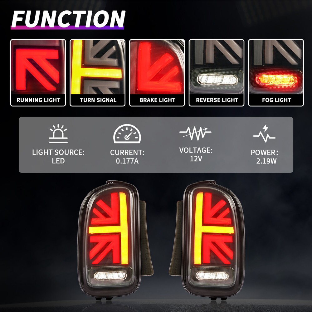Compatibility: LED tail lights compatible with 2007–2014 Mini Clubman R55,Mini Cooper/Cooper S/John Cooper Works. OEM: 63217167412,63217167411,63212754530,63212754529,63217255919,63217255920 What's Included: 1 Pair of Tail Lights Required harness Specifications: Bulbs Type: LED Chips(No need bulbs) Certifications:DOT/Emark Housing Color: Black Lens Color: Smoked Housing Material: ABS plastic Lens Material: PC Connector(s): OEM-Size Plug and Play Protection: IP68 Weatherproof After-sales:1 year warranty Features: Starting Animation:When it is ignited, it has the dynamic of scanning welcome Sequential Turning Light:Use dynamic sequential turning light, more eye-catch than the original turn light Full LED Design:More brighter than the original rear lights Plug and Play Compatibility: LED tail lights compatible with 2007–2014 Mini Clubman R55,Mini Cooper/Cooper S/John Cooper Works. OEM: 63217167412 , 63217167411 , 63212754530 , 63212754529 , 63217255919 , 63217255920 What's Included: 1 Pair of Tail Lights Required harness Specifications: Bulbs Type: LED Chips(No need bulbs) Certifications:DOT/Emark Housing Color: Black Lens Color: Smoked Housing Material: ABS plastic Lens Material: PC Connector(s): OEM-Size Plug and Play Protection: IP68 Weatherproof Features: Starting Animation:When it is ignited, it has the dynamic of scanning welcome Sequential Turning Light:Use dynamic sequential turning light, more eye-catch than the original turn light Full LED Design:More brighter than the original rear lights Plug and Play :Directly replace the taillight assembly, no additional bulbs required Warranty: Provide one year of after-sales service. If you have any problems during installation or work of the lights, please feel free to contact us. On Dec 13, 2024 at 01:37:59 PST, seller added the following information: