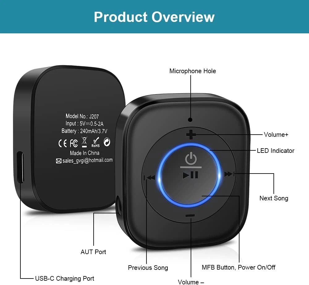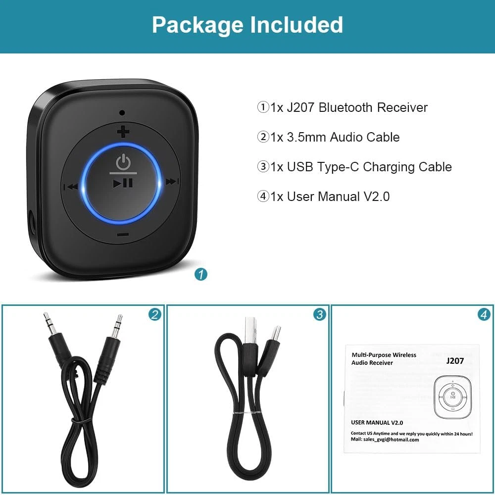 Store New Arrivals Add to Favorite View Feedback Contact Golvery Bluetooth Receiver for Old Speaker with Latest Bluetooth V5.4, 20-Hour Description Item model number Stereo J207 with Mic & Volume Control Style Stereo J207 with Mic & Volume Control Color Black Country of Origin China Product Dimensions 4.06"D x 1.1"W x 0.41"H Surround Sound Channel Configuration 2.0 Connector Type USB Type C Compatible Devices Smartphone, Speaker Item Weight 2.08 ounces Connectivity Technology Bluetooth Audio Output Mode Stereo Batteries 1 A batteries required. Manufacturer JTKJ Special Feature Dual Connection, Built-In Microphone, Hands-Free Calling Brand Golvery Controller Type Push Button 【The Latest Bluetooth V5.4】 With upgraded Bluetooth V5.4 technology and the advanced chipset, combining A2DP profile, this J207 receiver comes with stable connectivity and remarkable signal stability. Provides high quality and clear Hi-Fi music streaming. Creates enjoyable listening experience 【Save Your Old Speakers】Golvery J207 Bluetooth receiver is a perfect solution to make your old speaker/stereo system/car stereo/wired headphones to play music wireless from your phone/tablet/laptop via Bluetooth connection. Bring new life to your old audio equipment! NOTE: it is NOT a Bluetooth transmitter, CANNOT work for TV/PC to pair with Bluetooth headphones/speaker 【Easy to Use】Pairs with your Bluetooth devices like smartphone/tablet/laptop and connect it to your car stereo/old speaker/home stereo system/wired speaker/headphones by the 3.5mm audio cable (included). 【Keeping Working While Charging】This upgraded Bluetooth receiver can keep working while it is charging, which means it will never stop streaming. It will pair with the last pairing devices automatically when you turn on the Bluetooth function of the device 【20-Hour Long Battery Life】With the built-in 240mAh rechargeable lithium battery, it takes only 2 hours to fully charge by the USB-C charging cable . And it can last to work for about 20 hours, brings you all-day music enjoyment Product Description Lastest Bluetooth V5.4 Faster transmission and more stable connection 33ft Bluetooth Range Dual Link Pairing It can pair with 2 devices simultaneously Switch beetween 2 devices to play music or answer call Hands-free calling It supports one-key to answer / redial / hang up / reject calls via built-in mic Super Long Working Time It supports 20-hour working time after 2-hour full charge with 240mAh rechargeable lithium battery 1 Lastest Bluetooth V5.4 2 Dual Link Pairing 3 Hands-free calling 4 Long Working Time What's in the package? 1x J207 Bluetooth Receiver 1x 3.5mm Audio Cable 1X Type-C Charging Cable 1X User Manual 1 How to use it? 2 Where to use it? 3 What's in the package? Can I use it while it it charging? Yes, when you charge J207, it will keep always on working! Can it pair with bluetooth headphones/speaker? No, it can't pair with bluetooth headphones or speaker. It's a bluetooth receiver, not a transmitter. It can make your old speaker/stereo system/car stereo/wired headphones to play music wireless from your phone via Bluetooth connection. Can I connect two phones simultaneously? Sure, our J207 support dual link connection. You can connect two phones simultaneously. But only one device can play music at any time. You have to stop the music on one device to play on the other. Can it work for TV/PC/DVD/Projector? I'm afraid it can't work for TV/PC/DVD/Projector. Can I use it answer the calls while driving? Yes, our J207 support one-key to answer / redial / hang up / reject calls. Golvery Bluetooth Receiver and Bluetooth Transmitter Comparison Table Add to Cart Add to Cart Add to Cart Add to Cart Customer Reviews 4.4 out of 5 stars 4,681 4.4 out of 5 stars 4,681 4.2 out of 5 stars 1,819 4.1 out of 5 stars 4,395 3.9 out of 5 stars 1,263 Price $19.99 $ 19 . 99 $19.99 $ 19 . 99 — $35.99 $ 35 . 99 $49.90 $ 49 . 90 Working Mode Receiver Receiver Transmitter/Receiver Transmitter/Receiver Headphones Set for TV Bluetooth Version 5.4 5.4 5.3 5.0 5.0 Audio Input/Output Ports 3.5mm AUX 3.5mm AUX, RCA 3.5mm AUX, RCA 3.5mm AUX, RCA & Optical 3.5mm AUX, RCA & Optical Charging Time 2 Hours 2 Hours 2 Hours 2 Hours 2 Hours Working Time 20 Hours 20 Hours 16 Hours 25 Hours 25 Hours Hands-free calling ✔ ✘ ✘ ✘ ✘ ABOUT US We offer the best prices around on high quality products. Our E-store includes media such as books, movies, music and games while offering electronics, toys, sporting apparel, clothing, tools, general home, garden items and more. SHIPPING We are always working hard to ensure your package arrives as soon as possible. Please understand that some factors like weather, high postal traffic, and the performance of shipping companies are outside of our control. We offer free shipping to the lower 48 states and ship within 2 business days of payment, usually sooner. We do not accept P.O. Boxes. Please provide a physical address. RETURNS We offer a 30-Day Return Policy on items which you are not completely satisfied with. You have the option for a full-refund or an exchange of the item. No returns are available on items shipped outside of the USA. PAYMENT We accept PayPal. CONTACT US This page content is yet to come Please ad us to your favorite seller and visit again later Thank You CUSTOMER SATISFACTION We try our very best to make sure every customer is completely satisfied. If there's a problem, message us! We're happy to help.