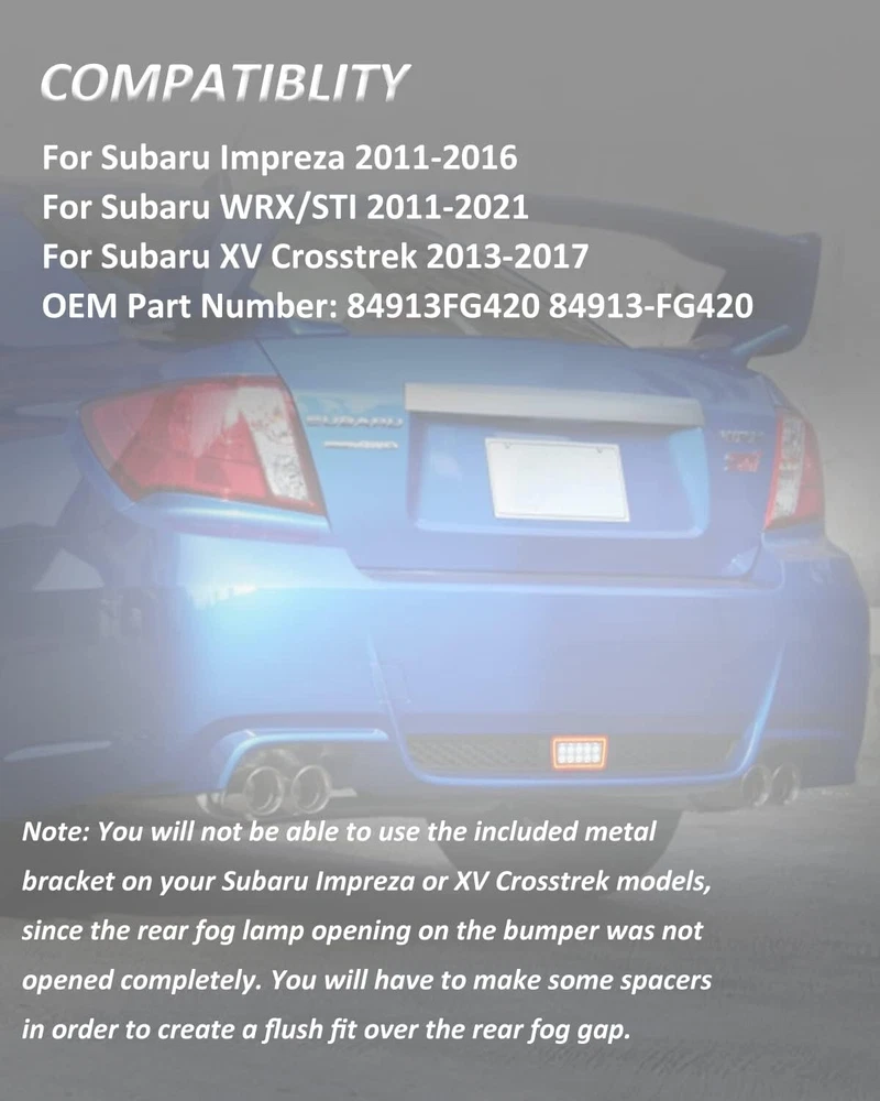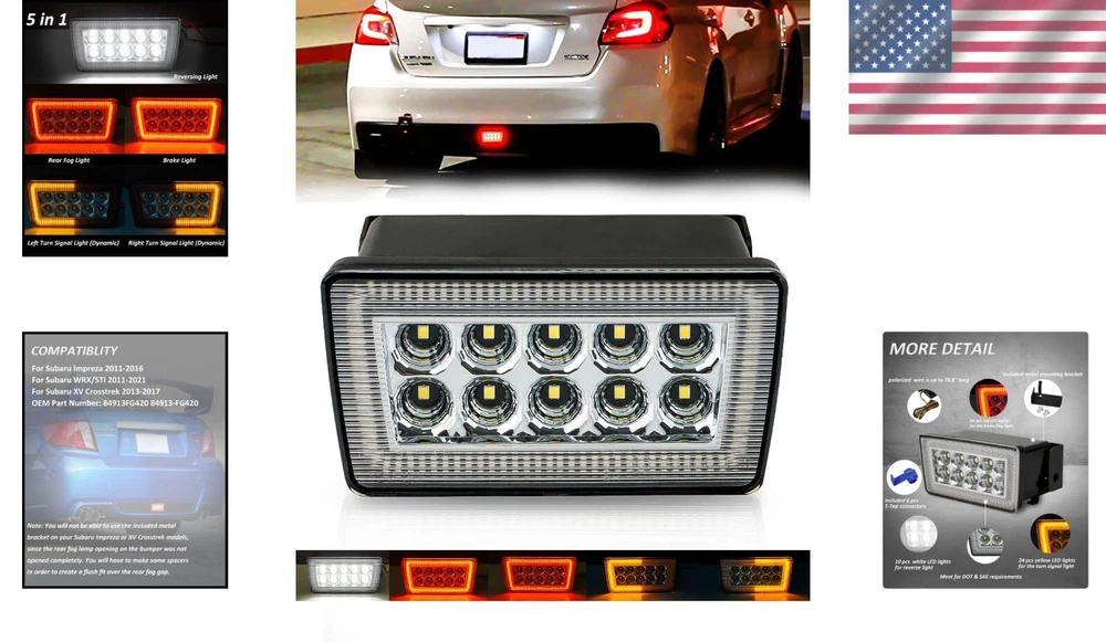 Upgrade Rear Visibility with 5-in-1 LED Fog Lights for Subaru WRX & Crosstrek ‹ › ‹ › ‹ › ‹ › ‹ › ‹ › ‹ › ‹ › ‹ › ‹ › ‹ › Upgrade Rear Visibility with 5-in-1 LED Fog Lights Compatible with: 2011-2021 Subaru WRX STI 2011-2016 Subaru Impreza (Adjustment required) 2013-2017 Subaru XV Crosstrek (Adjustment required) Product Features: 5-in-1 Functionality: Wired for multiple uses - fog light (low Red), brake light (high Red), dynamic left and right turn signals (amber), and ultra-bright white LED reverse lights. Easy Driver Control: Switch modes conveniently from the driver’s seat, enhancing driving efficiency. High-Quality Installation: Six-wire installation for proper connectivity - detailed instructions are recommended via professional installation. Superior Brightness: Outshines OEM options, providing enhanced visibility in all conditions. Durable & Waterproof Housing: Protects sensitive electrical components from environmental factors. What's Included: LED rear fog light Wiring harness Back mounting bracket T-taps and screws for secure installation Why Choose Our 5-in-1 LED Fog Lights? Elevate your Subaru's safety and style with our 5-in-1 LED Fog Lights. Designed specifically for your vehicle, these lights not only improve rear visibility but also add a modern aesthetic to your ride. With easy mode switching and a robust waterproof design, they are built to last while providing superior performance on the road. Experience utmost satisfaction with our lifetime warranty against manufacturing defects. Upgrade your Subaru today and drive with confidence! Shipping Free & Fast Shipping - We offer free shipping to most of the USA with a normal delivery time of 3-7 days. However, due to the current situation, additional delivery time (up to 3 weeks) may be required for some items. Alternative Carriers - We may use alternative carriers (e.g. USPS, FedEx, UPS, etc.) to ensure your package arrives safely and on time. Due to the use of multiple carriers, we are unable to provide a tracking number automatically. Handling Time - Orders are processed and shipped within 1-2 business days of receiving cleared payment. Shipping Restrictions - Shipping to Alaska, Hawaii, Puerto Rico, Guam, and other US territories may incur shipping charges or delivery restrictions. Please contact us before ordering, or your order can be refunded/cancelled. State Restrictions - There may be restrictions based on your state of purchase. For example, certain items may not be shipped to California due to state regulations. Contact for Tracking Updates - If you require tracking updates or have any concerns about the delivery of your order, please feel free to contact us, and we will be happy to assist you. Return 30-Day Hassle-Free Returns - We want you to be completely satisfied with your purchase. If you are not, you can return the item within 30 days of receiving it for a full refund or exchange. Easy Return Process - To start a return, simply contact us and we will provide you with a prepaid return shipping label and detailed instructions. Restocking Fee - There are no restocking fees for returns. However, the buyer is responsible for return shipping costs if the return is not due to a seller's error. Refund Processing Time - Refunds will be processed within 5 business days of receiving the returned item in its original condition. Payment We accept all major credit cards, PayPal, and Apple Pay for your convenience. Your payment information is secure and encrypted to ensure a safe and seamless transaction. Please complete your payment within 3 days of purchase to avoid any delays in shipping. Feedback Your feedback is extremely important to us. We strive to provide the best products and customer service possible. If you are satisfied with your purchase, please take a moment to leave us a positive review. If you have any concerns or issues with your order, please contact us before leaving negative feedback. We are committed to resolving any problems and ensuring your satisfaction. Contact Us If you have any questions or concerns, please feel free to reach out to our customer support team. You can contact us through the eBay messaging system. We are available Monday to Friday, 9:00 am to 5:00 pm EST, and we will do our best to respond to your inquiry within 24 hours. Thank you for supporting our small family business! UPC: Not Set Model: Not Set Placement on Vehicle: Lower Features: DOT-Certified,Waterproof,Bright LED,Dynamic Turn Signal,5-in-1 Functionality Items Included: Wiring Harness,Back Mounting Bracket,T-taps,Screws,LED Rear Fog Light Mounting Style: Screws Finish: Smooth Brand: Unbranded Type: Fog Light Lighting Technology: LED Number of Bulbs: 1 Light Color: Warm White Housing Color: Black Bulb Shape Code: Not Set Lens Color: Clear Manufacturer Part Number: Not Set OE/OEM Part Number: Not Set Wattage: Not Specified Voltage: 12 V Item Length: Not Set Item Height: Not Set Item Width: Not Set Country/Region of Manufacture: Not Set Color Temperature: Not Specified Lumens: Not Specified Manufacturer Warranty: Not Set Interchange Part Number: Not Set Superseded Part Number: Not Set Vintage Part: Not Set Universal Fitment: Not Set Performance Part: Not Set