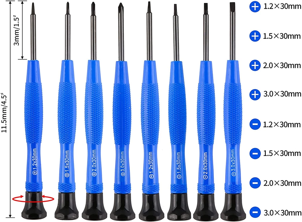 πŸ’œ Complete & Exquisite Eyeglass Repair Kit: Our eye glass repairing kit includes 4pcs Phillips and 4pcs Flathead magnetic screwdrivers, 16 sizes of tiny eyeglass screws, 14 pairs of eyeglass nose pads(7 different sizes), 1 curved tweezer, 1 micro screwdriver, washers, nuts, screw caps, cleaning cloth and screw box for glasses repair. With this glasses repair kit, you can repair your glasses everywhere whether you want to change nose pad or your glasses screws are aging or missing. 🧑 Useful & Comfortable Precision Magnetic Screwdriver Set: We have PH0000/1.2, PH000/1.5, PH00/2.0, PH0/3.0 Phillips screwdriver set and 1.2mm, 1.5mm, 2.0mm, 3.0mm Flathead screwdriver set in our glasses repair kit that are great for tiny screws. πŸ’› Multi-functional Keychain Screwdriver: The 3 in 1 keychain screwdriver includes Phillips and Flathead screwdriver and nut holder, which is designed for eyeglasses repair, but you can also attach it to your key chain for standy applications. πŸ’š Various Nose Pads & Screws : Our eyeglass repair kit is also equipped with 11/13/15/17mm different nose pads. You can choose according to your needs. Besides, 16 sizes of tiny screws can also meet your requirement. You can use the curved tweezer included in this kit to grip these tiny screws. And they are all included in our screw box, which is quite convenient to collect and carry. πŸ’™ Widely Applications: The Phillip and Flathead screwdriver covers a wide range of works and repairs in our daily life. This repair tool kit can used for eyeglass, sunglasses, watches, clocks and those small electronics with tiny screws. Product Description Flexible with Swivel Cap It is equipped with flexible swivel cap, which is convenient to hold in hand and freely turn with swivel cap, good for long time use. Complete Screwdriver Set Our eye glass repairing kit includes 4pcs Phillips and 4pcs Flathead screwdriver, which are PH0000/1.2, PH000/1.5, PH00/2.0, PH0/3.0 Phillips screwdriver set and 1.2mm, 1.5mm, 2.0mm, 3.0mm Flathead screwdriver set. Non-slip Handles The handle of the screwdriver set is made of plastic, which is non-slip when using. You don't need to worry about falling it down easily.