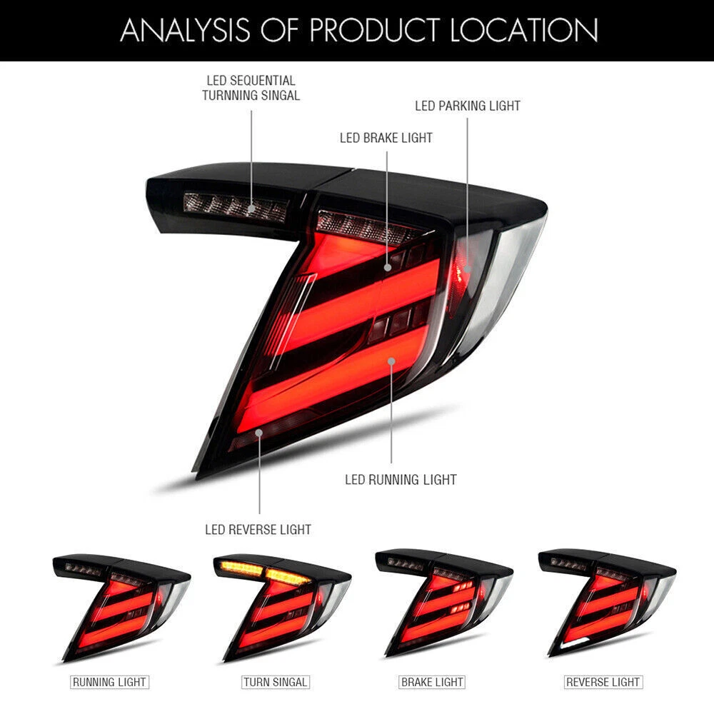 YOU MAY LIKE(FOR HONDA CIVIC) Pair LED Headlights For Honda Civic 2016-2021 Red Demon Eye Front Lamp Assembly BUY NOW LED Headlight for Honda Civic 11th Gen 2022-2024 Animation Sequential Front Lamp BUY NOW For 2022 2023 2024 Honda Civic Sedan LED Head Lamp RGB Tailights Lamp Assembly BUY NOW RGB LED Projector Headlights For 2016 2017 2018 2019 2020 2021 Honda Civic LH&RH BUY NOW Clear Lens LED Headlights For 2006-2011 Honda Civic 4Dr Sedan Animation Signal BUY NOW Pair RGB LED Projector Headlight DRL Assembly For 2016-2021 Honda Civic 10TH Gen BUY NOW LED Taillights For Honda 2006-2011 Civic Sedan Inner Outer Side Brake Rear Lamps BUY NOW LED Tail Lights for Honda Civic 11th Gen 2022 2023 2024 RGB Sequential Rear Lamp BUY NOW For Honda Civic Sedan 2016-2021 Pair RGB LED Tail Lights Dynamic Rear Rear Lamps BUY NOW 4-Lens LED Headlights DRL for 2006-2011 Honda Civic 4-Door Front Lamp Assembly BUY NOW Pair LED Tail Lights For Honda Civic Hatchback 2016-2021 Rear Lamps Sequential BUY NOW RGB LED Projector Headlights DRL For Honda Civic 2016-2021 Head Lamps Assembly BUY NOW Fitment: For Honda Civic Hatchback 2016-2021 Package Includes: 1 Pair (Left Side + Right Side) Taillights Assembly Set 1 Pair (Driver Side + Passenger Side) Headlights Assembly Set (Including Some Installation Accessories) Specification : Brand :TT-ABC Product Condition: 100% Brand New Type: LED Headlights And Taillights Assembly A few second of Start up Animation Sequential Turn Signal Full LED, No need to purchase additional light bulbs Functions: Running light +Brake light +Turn Signal+Reverse light DRL +High Beam+Low Beam lights+Turn Signal Operating Voltage: 12V-14V Material:High Quality ABS Plastic+PC+PMMA Waterproof Rate:IP67 Warranty:1 year Features:DOT-Certifed, Durable, Easy lnstalation, High Quality, OE-Certified, SAE-Cerified, Sealed Assembly, Waterproof, ISO-Certifed, Dustproof And Shurdy Note: 1.Using your factory supplied connector/harness will avoid cutting or modifying any wires.It is plug and play, easy to install still professional installation is recommended. Benefits of LED making you safer on the road for other road users to see. 2.If you have any problem, please contact me . About us Payment Shipping Returns Contact us Feedback TT-ABC is a company specializing in the production and sales of automotive parts. We offer a variety of products, including headlight, high beam lights, low beam lights, fog lights, contour lights, turn signals, brake lights, reverse lights, and interior lighting. We have our own production factory and collaborate with hundreds of component factories, committed to providing customers with high-quality products, the most favorable prices, and a professional after-sales customer service team. Our goal is to meet the needs of our customers and provide them with an excellent shopping experience. 1.Please confirm if the address and postal code are correct before placing an order! Convenient and fast shipping. 2.We can accept payment method is PayPal, Google Pay, Visa, Master Card, Amex and Discover and other payment way. 1.Shipping from the US Stock by USPS,FedEx or UPS . 2.Within 1-3 business days after payment cleared. 3.Please offer us your telephone number and correct zip code,or your order will be delayed since the courier will need it for the delivery. 4.Delivery time depends on destination,usually arrive 1-6 days after delivery. There are some tips for you: 1. If There are any problems with the product, please contact with us before leaving neutral and negative reviews feedback ,give me a Chance to make it right 2. If you are in our exclusion countries. Please write to us for shipping .If When the goods arrive, please check them carefully 3. If you find that the goods have been damaged, please be sure to refuse to collect the goods and ask the courier to return the goods to us. If the goods are damaged, please do not collect. 4. If the item you have ordered is defective, contact us within the warranty period, we will replace the defective item for you with an item of equal functionality at first. 5. If buyer do not want neither replacement nor partial refund, but want returning,buyer should be responsible for all the returning ship charges. 6. To be eligible for a return, the item(s) must be in new, unused condition with all original tags and packaging intact. Please note that we cannot accept returns for items that have been used, damaged, or altered in any way. Our working hours are from 9:00am to 18:30 China time (Monday to Friday). Communication is the best way to solve problems. If you have any questions, please contact us or leave us a free message. We will reply immediately at our convenience. After-sale If it happens that the lights get moisture after you install them on your car, it would be normal for first time using. You just need to keep using for a period of days, the moisture will disappear. because there is inner air cycling in the lights as we design. As for headlights, you can also open the cover of low/high beam so that the moisture will out more quickly. If the moisture still exist, please feel free to send us message for help, we will try our best to help you. After you install, if you find that there have function does not work, please check if the harness is connected correctly, and exchange the left and right , If it still does not work, please rember take some photos or videos, please feel free to contact us. We will appreciate if you can takes some pictures or videos about your problem, and also send us the barcode of the products(every product we sell has a barcode on the backside of the light and outside of the package, it's very important for us to find the problem) If you open a request or case optionaly before communication, it would be hard for us to serve you. Feedback Policy: At our store, we pride ourselves on providing an exceptional shopping experience for our customers. We offer high-quality products and outstanding customer service, an
