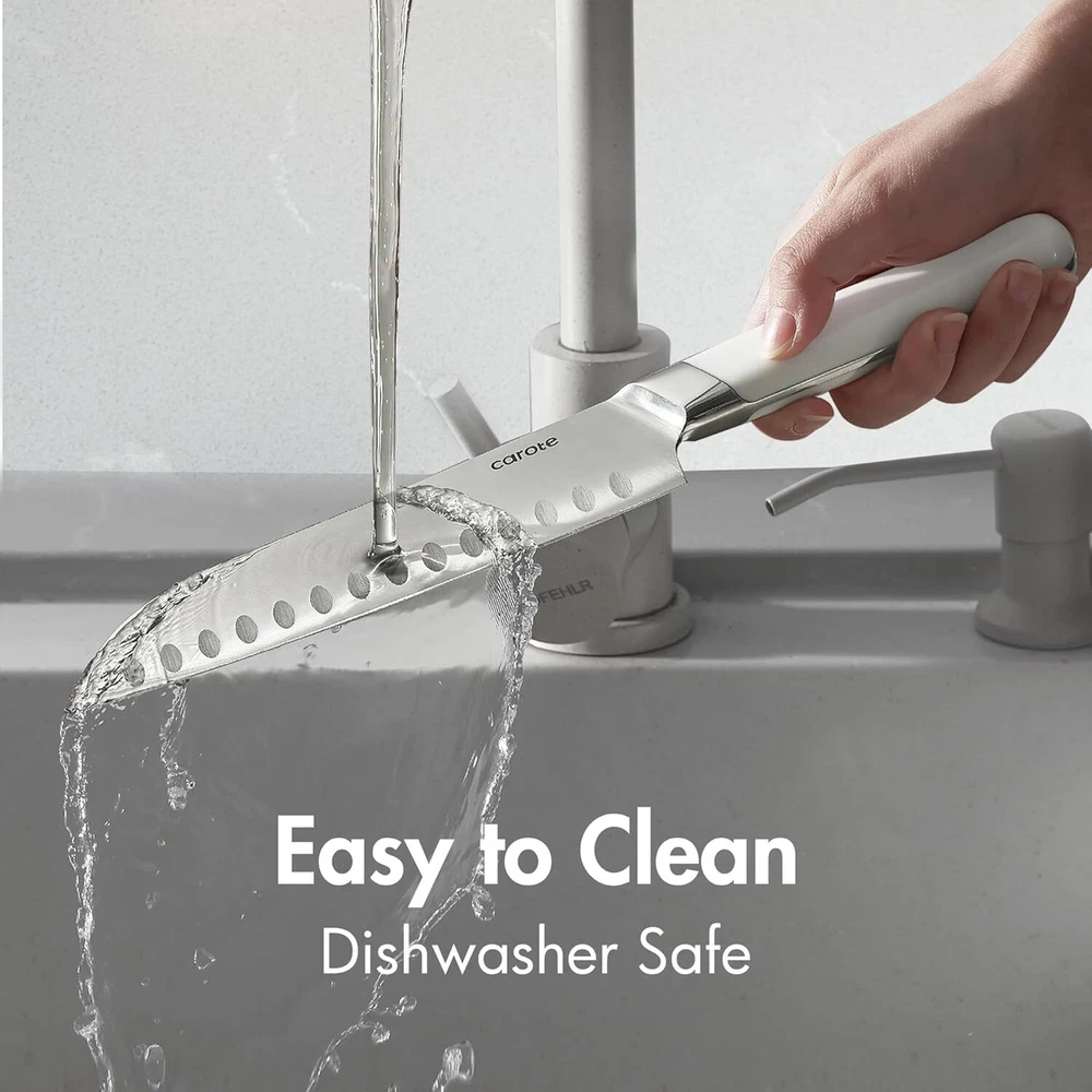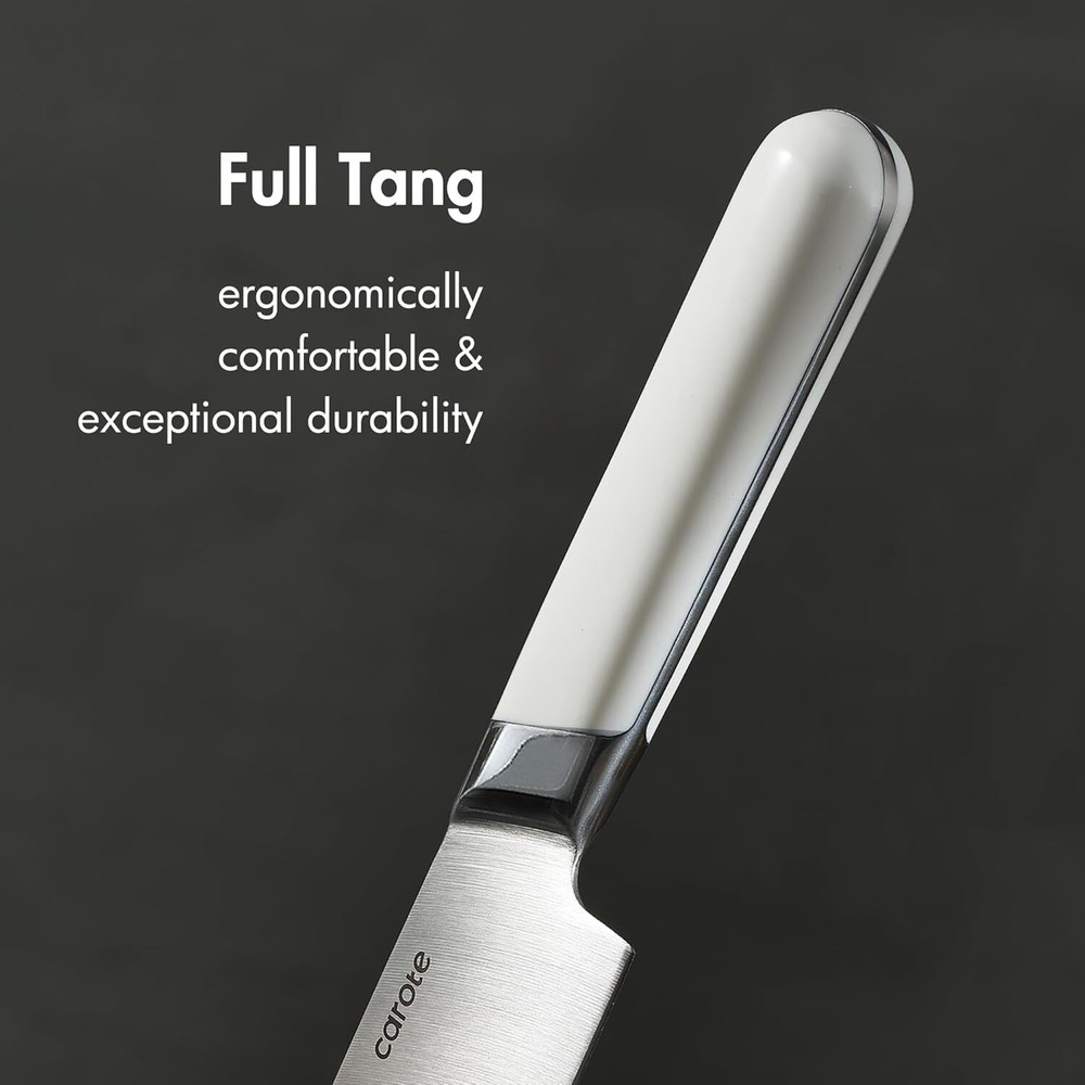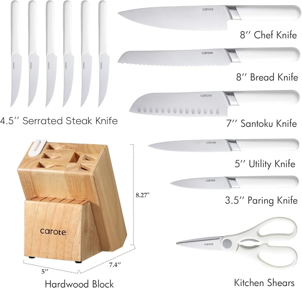 Color Alabaster Brand CAROTE Blade Material Stainless Steel Blade Edge Straight Edged;Serrated Item dimensions L x W x H 7.5 x 5 x 16.5 inches About this item CAROTE Knife Set Precise lasers are used to ensure each blade edge is at the optimal cutting angle for sharpness.It brings efficiency to save more time in everyday food preparation. CAROTE Kitchen Knife Set features precision stainless-steel blades that resist stains and rust. And each knife is precision forged from single piece of sturdy stainless-steel that for exceptional durability. Ergonomically handle provides a secure, comfortable grip. And full tangs and extra-wide forged bolsters ensure balance, stability and control.The Block with Built-in Sharpener saves storage space and saves time in making the knife sharper. CAROTE Knife Set with Block includes all the most common kitchen knives, 8" chef knife, 8" bread knife, 7" santoku knife, 5" utility knife, 3.5"paring knife, as well as a six-piece steak knife set, kitchen shears, 14-slot hardwood storage block with built-in sharpener. Product information Color Alabaster Brand CAROTE Blade Material Stainless Steel Blade Edge Straight Edged;Serrated Item dimensions L x W x H 7.5 x 5 x 16.5 inches Style Tableware Is Dishwasher Safe Yes Handle Material Polypropylene Construction Type Forged Manufacturer CAROTE Included Components chef knife; bread knife; santoku knife; utility knife; steak knife*6; kitchen shears; hard wood knife block with built-in sharpener Product Dimensions 7.5 x 5 x 16.5 inches Item Weight 8.62 pounds ASIN B0CS2VJ1NR Country of Origin China Item model number A08131