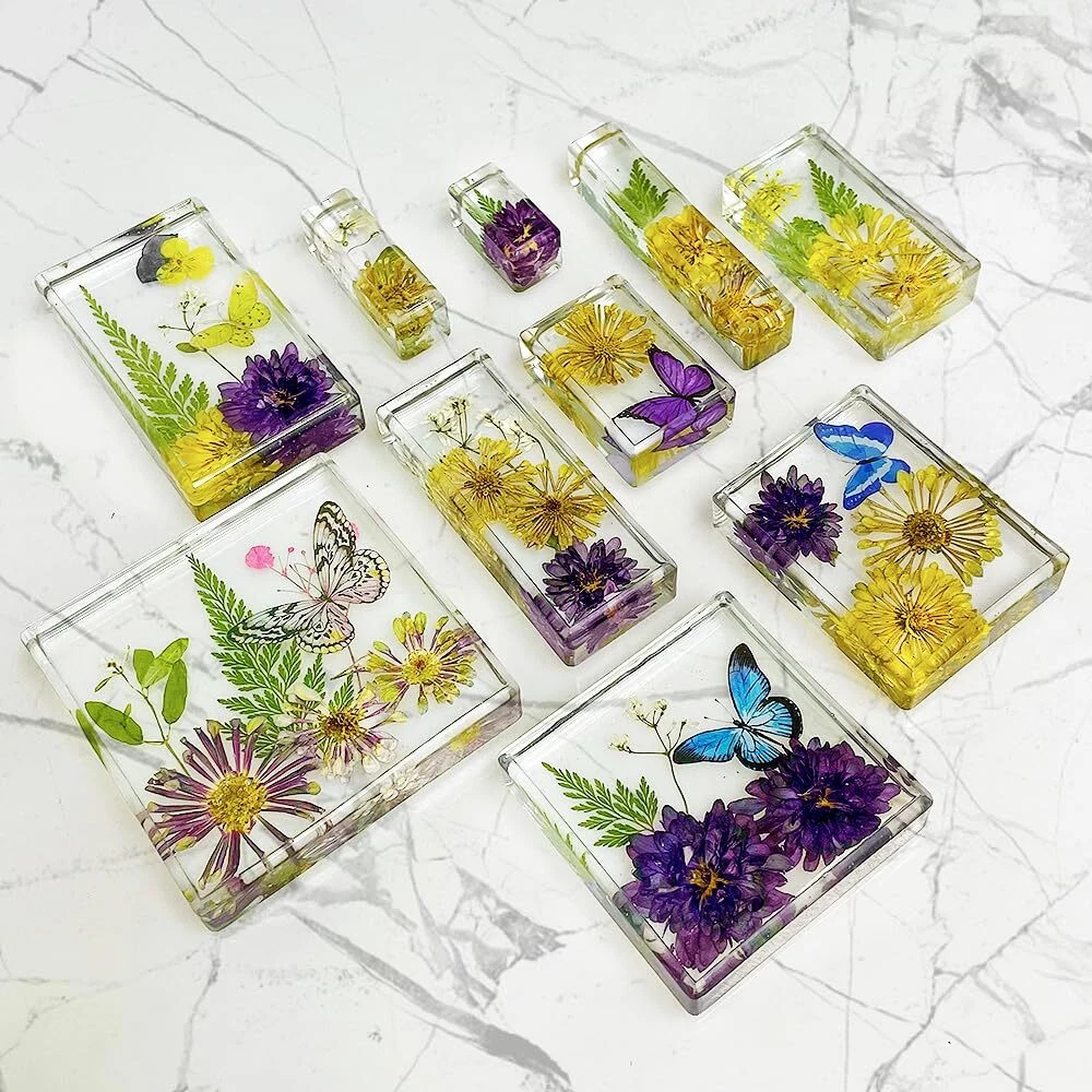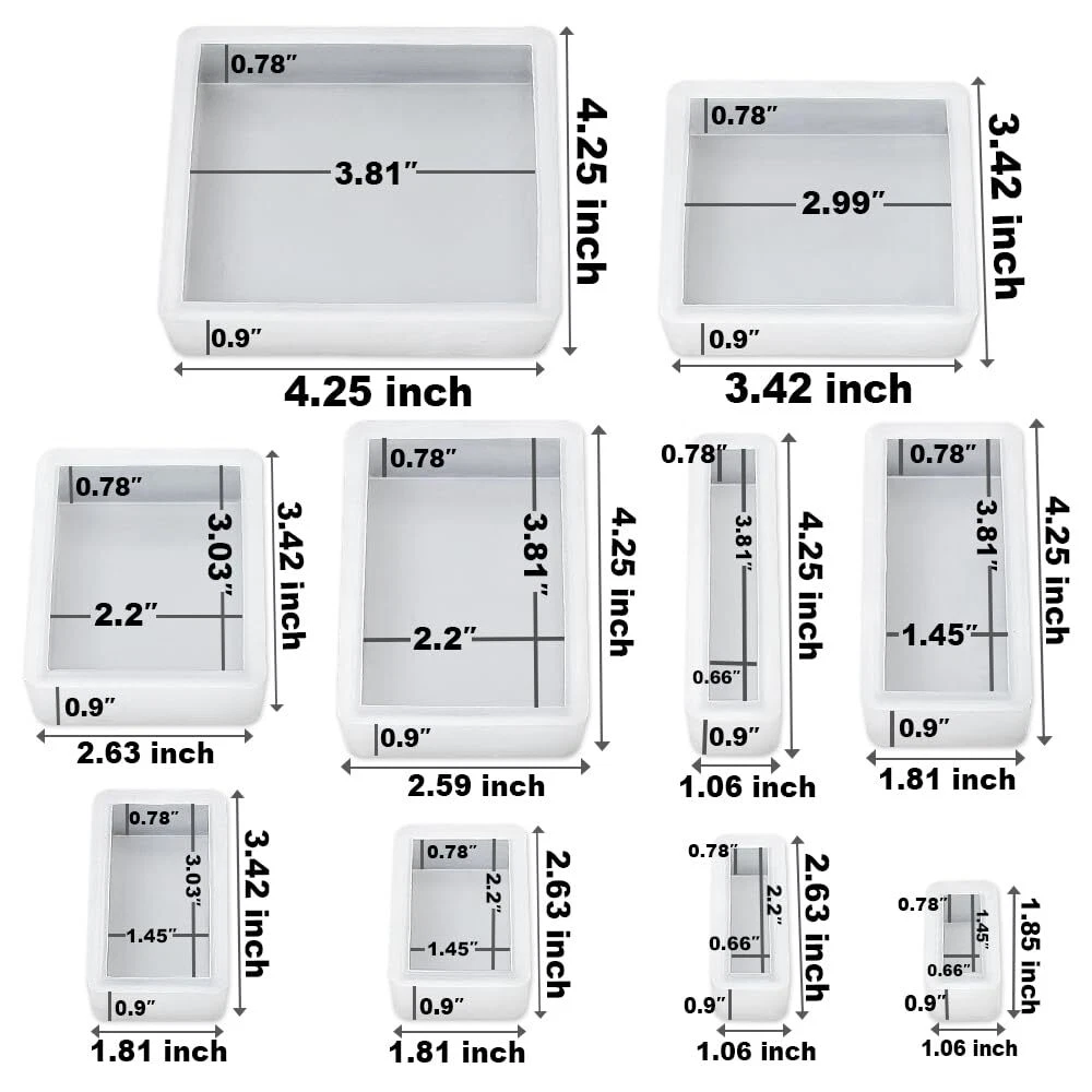 【Upgraded No Polishing Silicone Mold】: This set of rectangle square molds, designed with rounded corners, is easy to use and requires no polishing. 【10 Different Sizes Cube Resin Mold Set】: This epoxy casting mold set includes 10 sizes, it can meet your various crafting needs. 【Thick Shiny Silicone Molds】: The silicone material of this mold set is thick and sturdy. The finished piece has glossy surface with mirror effect. 【Suitable for Various Casting Material】: These silicone resin molds are compatible with most casting material such as epoxy resin, UV resin, dry flowers, insects, specimen, candles, wax, concrete, soap, clay, plaster, gypsum, etc. 【Creative Project DIY 】: These silicone molds can be used to make resin ornaments, resin night light, paperweight, specimen dried leaf flower preservation, Christmas wedding home decoration.
