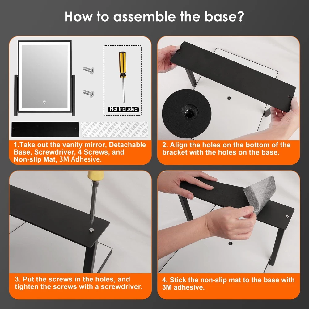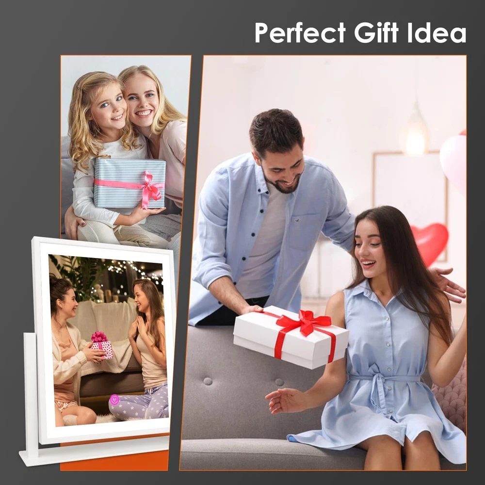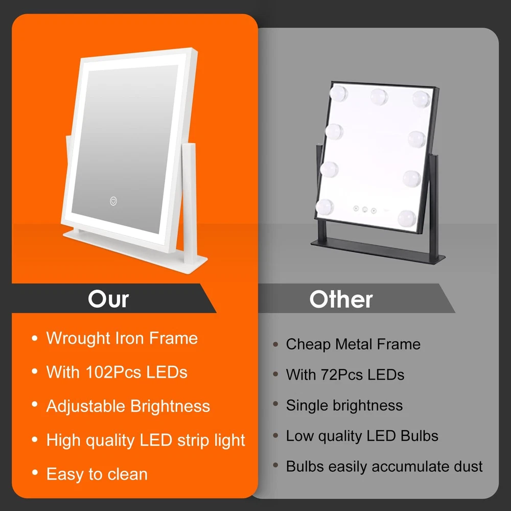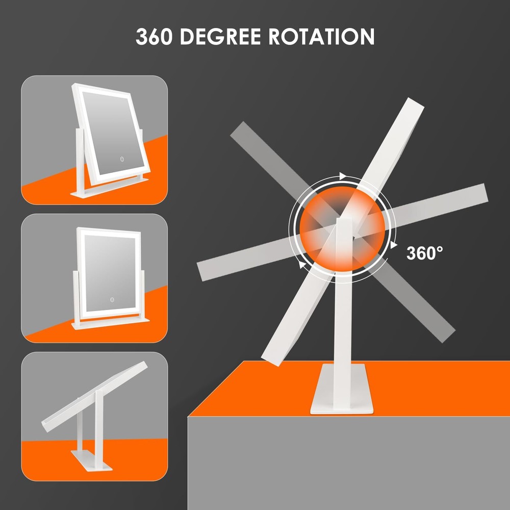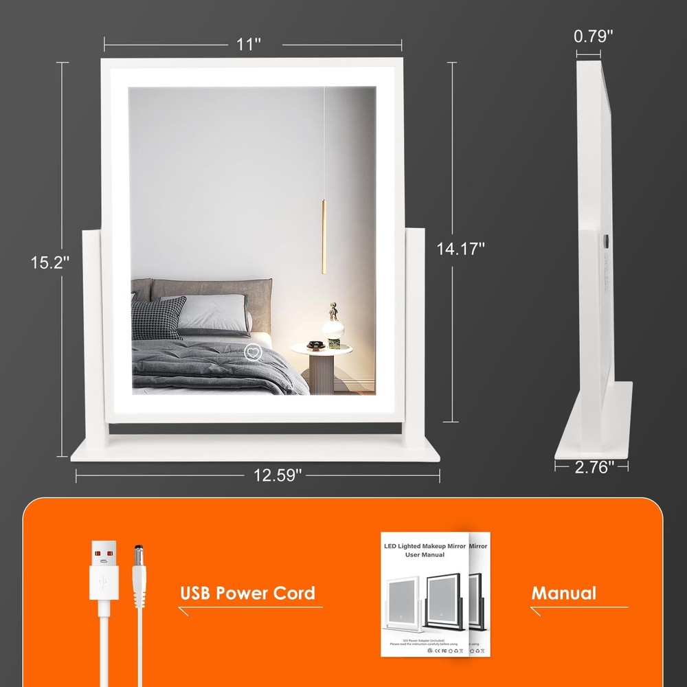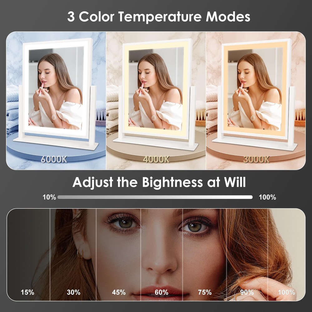 【3 Color Modes & Adjustable Brightness】lighted vanity mirror built-in eye protection LED light strip, offers three color lighting modes: Natural light, Warm light and Cold light. Long press to adjust the light brightness between 10%-100%. The dimmable makeup mirror with light can meet the different personal makeup needs of different occasions. 【Smart Touch Control & Memory Function】The smart touch button of LED vanity mirror provides a sleek and modern look. Easy to use by touching the light button. The memory function of light up mirror for makeup can keep the light settings just like the last time it was used, allowing you to save your preferred lighting settings for your next use. 【Sturdy Frame & 360°Rotation】The desk mirror with light features a robust U-shaped stand made of strong metal, making the LED mirror makeup more stable and durable. 360-degree rotation allows you to see more detail, convenient for you to select the ideal viewing angle or position. 【Elegant Design】 Come with a 5V DC charging cable so that you can plug it into any USB interface. Corded vanity mirrors can provide more than 30% brightness than other battery power supply methods. ( Not rechargeable, charger not included ) 【Perfect Present Her & 2-Year Satisfaction Service】 Our HD lighted tabletop mirror is a thoughtful, practical and stylish present for any great moments such as Valentine's Day, Mother's Day, Birthday, Christmas, anniversary, etc. White desk vanity mirrors also can be widely used in bedrooms/beauty salons/dressing rooms. If you encounter any issues with our light up vanity mirror, please simply reach us & we'll provide a replacement .