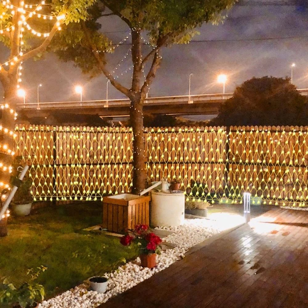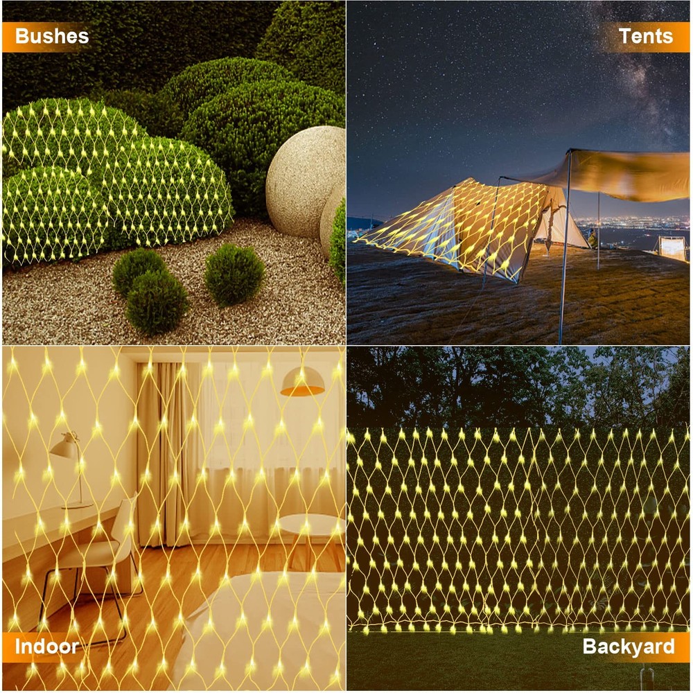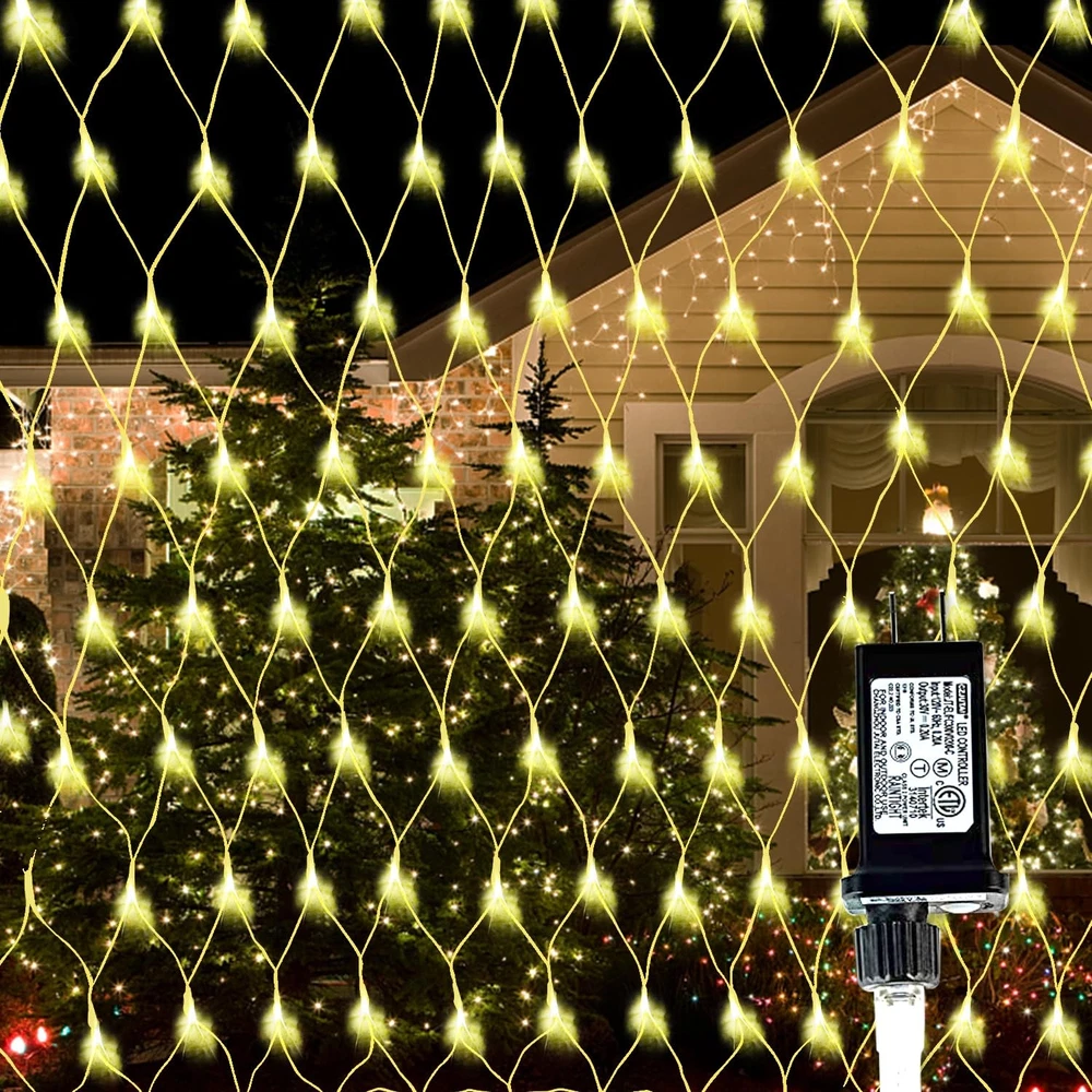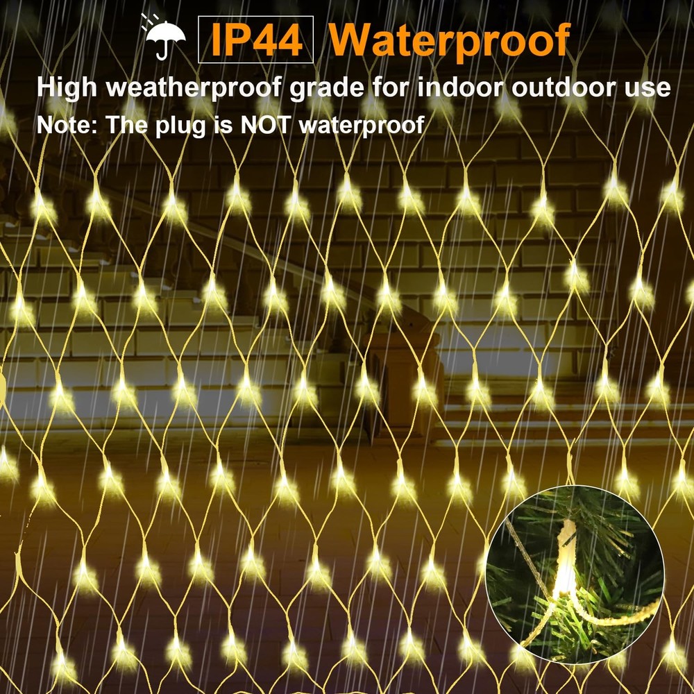 -Large Size Outdoor Net String Lights -Upgraded sturdy and durable PVC net, not easy to break 【UPGRADED STURDY WIRE OUTDOOR NET LIGHT】We have completely upgraded our outdoor net light, made of thickened PVC net, which is stronger and not easy to break compared to other net lights on the market, 360 super bright LEDs emit dazzling light, powered by UL listed 30V low voltage plug. Size: 12ft x 5ft, Lead Length: 16.5ft. Perfect for decorating indoor and outdoor, such as home, bar, garden, patio, balcony. 【IP44 WATERPROOF OUTDOOR CHRISTMAS LIGHTS】IP44 waterproof rated cords and bulbs can withstand most weather conditions such as rain and snow. Can be used for indoor and outdoor decorations, such as Christmas, festivals, weddings, parties, gardens, patios, bushes, and etc., can meet the normal outdoor use. Note: the plug is NOT waterproof, please keep away from water. 【8 LIGHT MODES NET LIGHTS 】This Christmas outdoor decorative mesh light has 8 light modes to choose from: combination, in waves, sequential, slogs, chasing/flash, slow fade, twinkle/flash, and steady on. Suitable for different occasions and environments, press the button on the plug directly to switch modes. 【CONNECTABLE MESH LIGHTS】Our Christmas Shrub Grid Lights are scalable to up to 3 light groups (up to 1000 LEDs) to easily cover hedges, treetops, walls, hedgerows, shrubs, fences, tree trunks, tree wraps, railings, windows, utility poles and posts. Add a stunning glow to your home and yard! 【EYE-CATCHING FAIRYTALE STRING LIGHT】LED Christmas Lights Outdoor Patio Decorative Nets are great decorations for Christmas trees, front yards, gardens, rooftops, ceilings, terraces, and irregular bushes, just hang these light nets to create a romantic atmosphere for marriage proposals, surprises, weddings, birthdays, and anniversary parties, and can also be used for home and bedroom curtains background decorations.