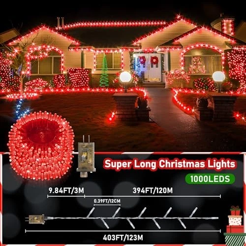 Upgraded 403FT 1000 LED Christmas Lights with Clear Wire in Green