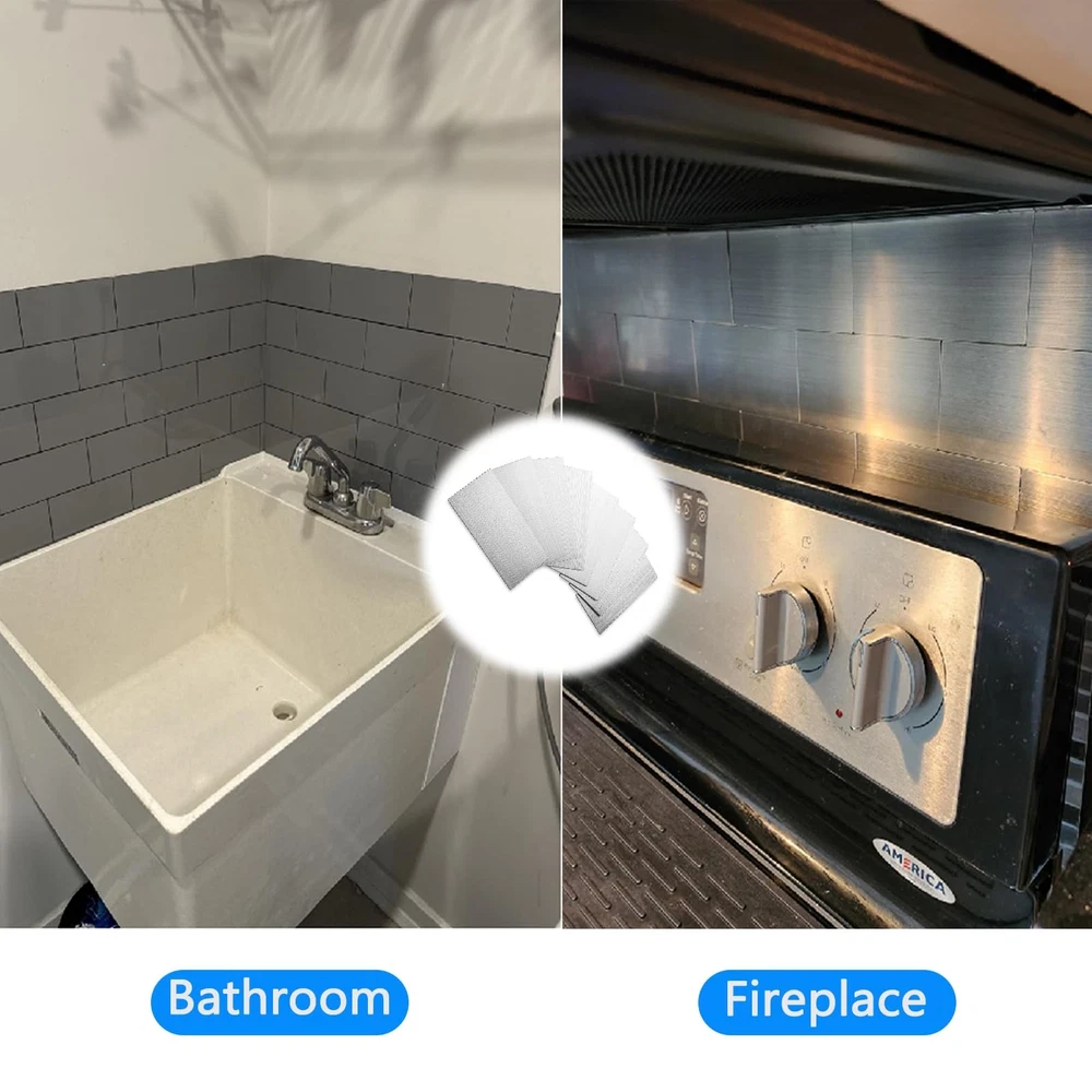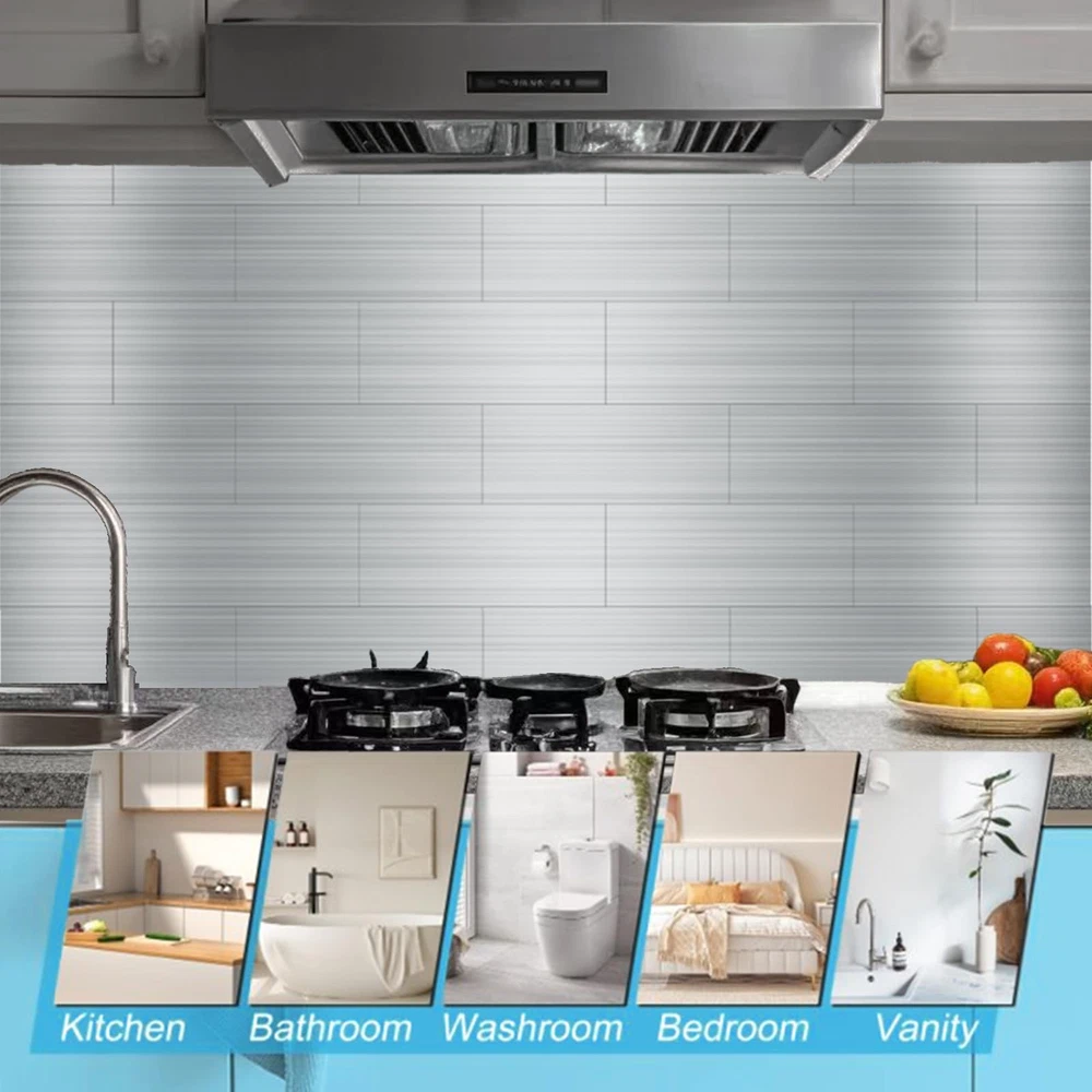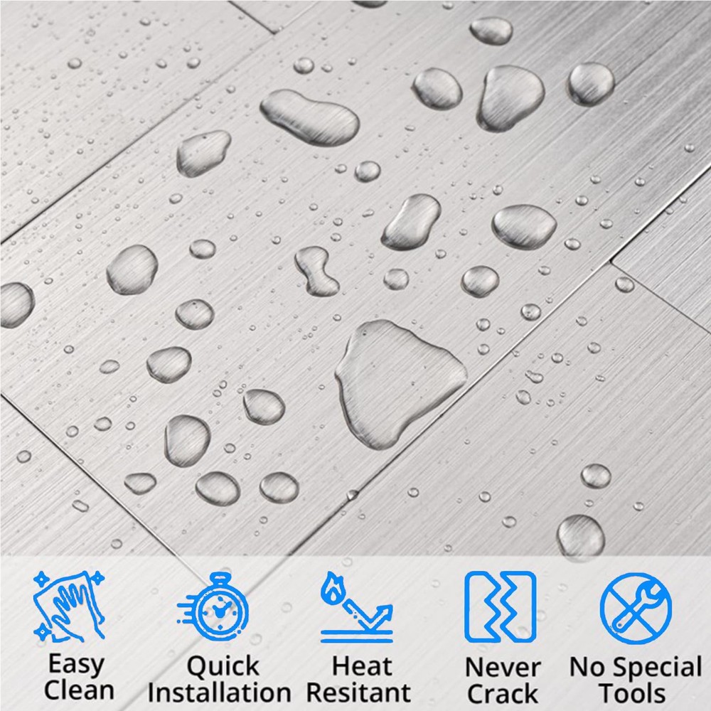 Elevate your kitchen's style with these sleek and modern porcelain tiles. Crafted from high-quality materials, these tiles offer a sophisticated linear pattern that adds depth and texture to your space. Their durable construction ensures long-lasting beauty, while the neutral gray hue complements a variety of design aesthetics. Whether you're renovating or building new, these versatile tiles are an excellent choice for backsplashes, countertops, or floors. Effortlessly blend form and function with this stylish and practical tile collection. Function: Easy to DIY self-adhesive metal tiles for kitchen tailboards, peeling and pasting installations. Dry-installation:No thin backing or decorative cement paste, no dirt or disorder. Widely used:Subway Backsplash, Kitchen, Bathroom, Laundry Room, Camper, Fireplace, RV,kitchen tailboards, decorative walls, and decorative purposes. Size: 4'' x 12'' x 0.15'' , with 30 metal tailboards per pack (occupying 10 square feet). Note:The tile is not magnetic, the tiles should not directly contact with flames or submerse in water. If cutting tiles, one of the following tools is required: jigsaw or cutting saw (recommended), steel saw, hole saw or top saw (only used for circular cutting or power socket cutting). 【4mm Thick & Cuttable Design】Upgraded stone-composite tiles (3x thicker than vinyl) withstand daily wear. Easily cut with scissors/utility knife for precise fitting around outlets or edges 【10 Sq.Ft Strong Adhesive Coverage】30 self-adhesive sheets (4”x12” each) cover 10 sq.ft. Industrial-grade glue bonds instantly on ceramic, PVC, glass, or painted walls—no grout or thin-set required 【Waterproof & Heat-Resistant】Moisture-proof polymer core prevents warping in kitchens/bathrooms. Withstands splashes, grease, and moderate heat (not for direct flames). Wipe clean effortlessly 【Multi-Surface Versatility】Install over existing tiles or smooth surfaces (wood, cement, metal) for subway-style accents. Ideal for kitchens, laundry rooms, campers, and decorative walls 【DIY-Friendly & Durable】Peel-protected adhesive ensures bubble-free application. 0.15" rigid design resists dents. Note: Non-magnetic surface; avoid submersion or extreme heat exposure