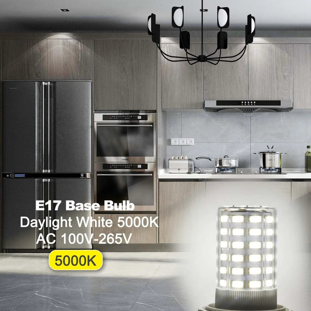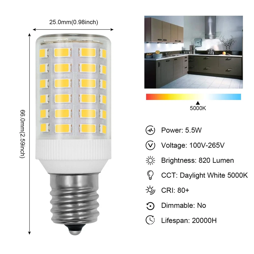 【E17 Intermediate Base】The product size is 1''(D)* 2.6'' (H)/25mm * 66mm. Suitable for appliance bulb with E17 base. But the base of some appliance light bulb is E26(26mm/1in), while the base of this LED appliance bulbs is E17(17mm/0.6in), many parts look the same, but won't fit your model. So bofore purchases, kindly make sure base of bulb is the same. 【Super Bright】5.5W E17 LED bulb with an incredible light high output up to 820 Lumens, CRI up to 80, Great for environments that need brigh. Ideal for Counter range hoods, Refrigerator lights, Cabinet lights, Floor lamp, Wall light, Chandelier, Desk lamp etc. And AC 100V-265V the input voltage can be applied to the grid voltage requirements of any country in the world. 【Save Energy】Get huge energy savings replacing E17 socket 40W-60W halogen lamp with this 5.5W A15 E17 bulb. The energy consumption of each bulb is 5.5kWh/1000h, saving 90% of electricity costs. (It is not dimmable, please do not use a dimmer, otherwise it may cause flicker and affect the use effect. ) 【Ceramic Body】E17 intermediate base led bulb, the ceramic body allows for fast heat dissipation and lower heat generation than traditional T8 E17 light bulbs construction. This makes the bulb work more stable and the service life is greatly improved. 【After Sales】 If you have any questions after purchasing LED bulb, you can us and We will give you perfect after-sales service.