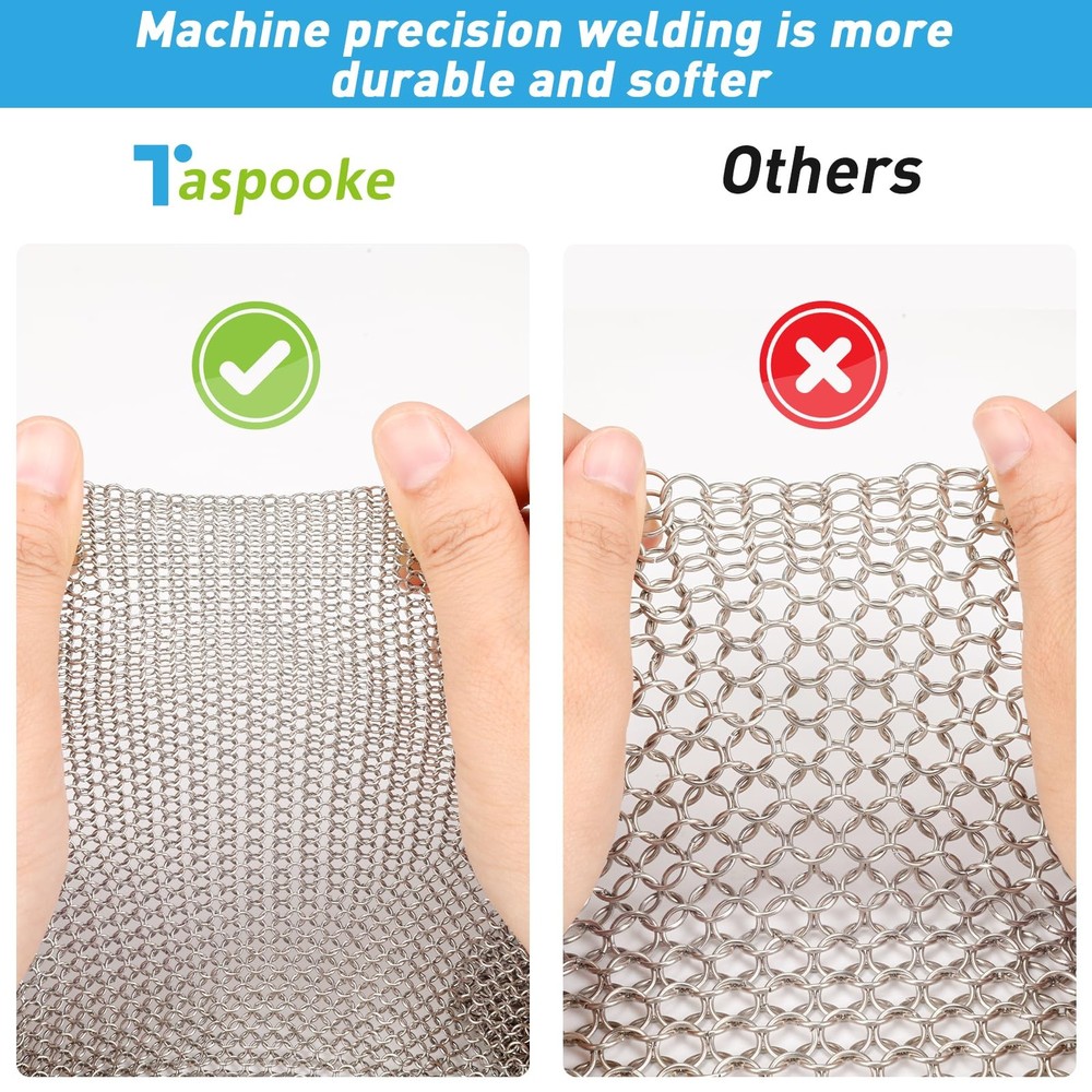 Clean your cookware with ease with our upgraded premium cast iron cleaner! Made from high-quality 316L stainless steel, this durable chainmail brush features finer and smaller circles with a hole diameter of 3.8mm and a wire diameter of 0.5mm, meeting all your needs for cast iron, stainless steel, and glassware. Its unique design allows for effective cleaning without damaging your pots and pans, ensuring your favorite cookware stays in top condition. Dishwasher-safe and easy to store, this versatile brush is perfect for indoor and outdoor cooking. Enjoy a lifetime satisfaction guarantee and experience the magic of worry-free cleaning now! 【Our Advantages】Our chainmail is made with Finer and Smaller Circles with a Hole Diameter of 3.8mm and a Wire Diameter of 0.5mm, which is an Upgraded product. In addition, we offer more and larger size options, and the oversized chainmail can even be used as a pet cage net, fireplace fence, screen or door curtain. 【High-quality Materials】Made of food-grade 316L stainless steel, this cast iron cleaner is durable and rust-resistant, with a smooth ring that effectively removes residue without scratching your cookware. 【Easy to Use】The round mesh design allows for efficient cleaning, minimizing debris from getting stuck. This brush comes with a convenient hanging loop for easy storage and access in any kitchen. 【Sturdy and Durable】Designed to withstand frequent use, this chainmail brush has reinforced edges to protect the seasoning of your cookware for a long life. 【Widely Used】Perfect for cleaning Cast Iron Skillets, Dutch Ovens, Griddles, Pans, Woks and even Glassware, this versatile brush is a must-have tool for home chefs and outdoor enthusiasts.