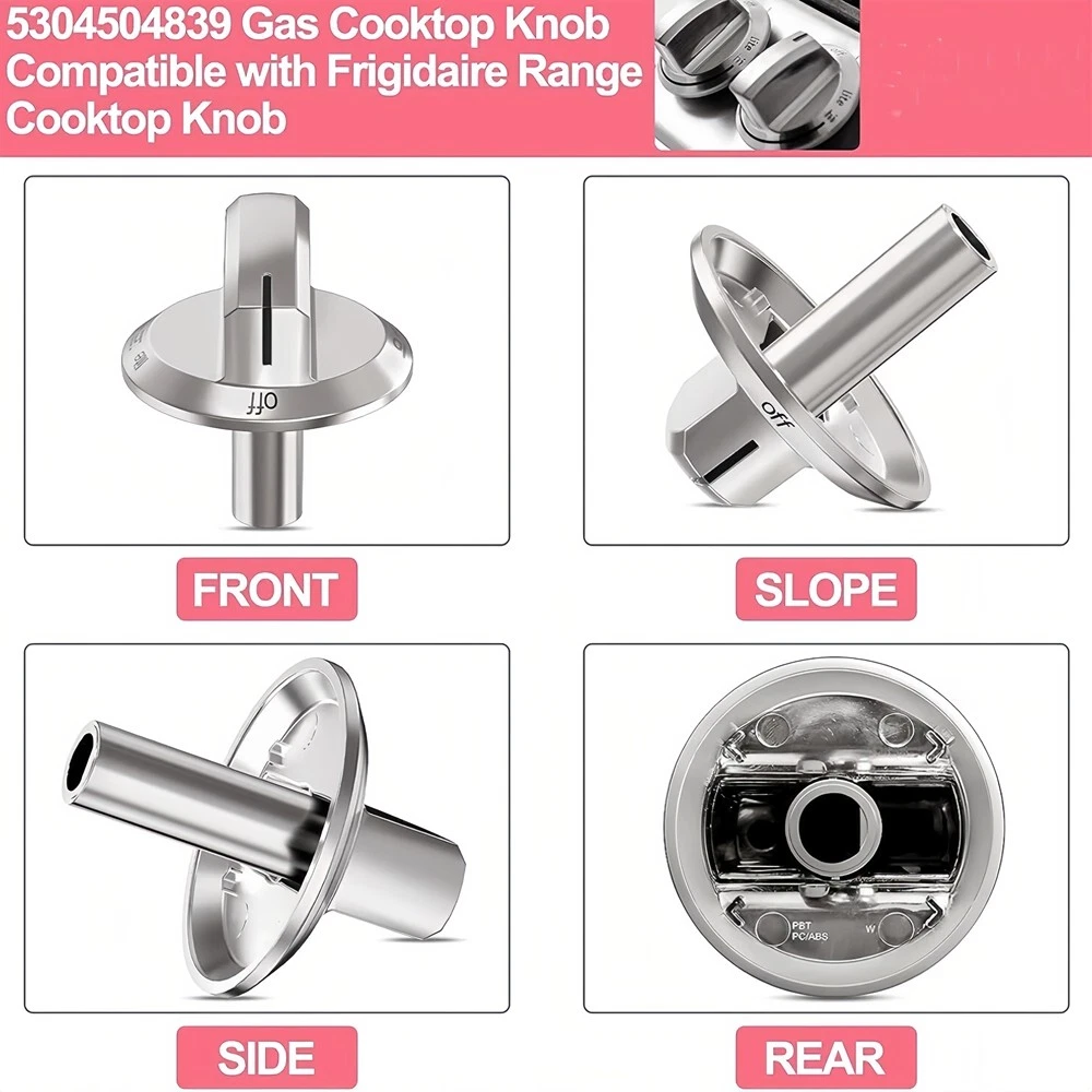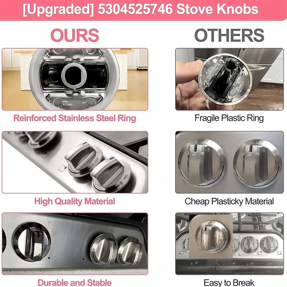 5304525746 Gas Stove Knob Replacement Material:Plastic, ABS Attention: Check first that the dimensions correspond to each other to ensure that our control knobs fit your machine Replaceable Part N O : A03546301/02/03, 5304525746, 5304504839, PD00064795, 4960519, AP6997304, PS16227241, EAP16227241 and is compatible with FFGC3026SS FFGC3626SS FFGC3626SWC FGC3047QS and many more Model Number FFGC3026SBC COOKTOP FFGC3026SBD COOKTOP FFGC3026SSA GAS COOKTOP FFGC3026SSB COOKTOP, GAS FFGC3026SSC COOKTOP FFGC3026SSD COOKTOP FFGC3026SWC COOKTOP FFGC3026SWD COOKTOP FFGC3626SBC COOKTOP FFGC3626SBD COOKTOP FFGC3626SSA GAS COOKTOP FFGC3626SSB COOKTOP, GAS FFGC3626SSC COOKTOP FFGC3626SSD COOKTOP FFGC3626SWC COOKTOP FFGC3626SWD COOKTOP 【Note】 5304525746 knobs burner control knobs, the installation hole diameter (D shaft size) is 0.24 inch/ 6.21 mm in length, 0.21 in/5.38 mm in width, (please refer to size picture) and measure your knobs control insert size to make sure this knob fits before purchasing.This item includes 5 x 5304525746 knobs replacement, which can replace all your old knobs on stove. 【Upgraded Durable Version】 5304525746 stove knobs replacement part are the improved design based on market research. Stove knobs cover is made of high-resistance ABS plastic with the advantage of corrosion resistance, high temperature resistance and strong reinforcement. So that it can be installed more secure, durable sturdy and prolong the lifetime. 【Fits Appliance Models & Replacement Part Number】 5304525746 range control knobs are perfectly compatible with most of Frigidaire series range stove models:FFGC3626SS ,FGC3026SSA,FFGC3026SSB,FFGC3026SSC,FFGC3026SSD,FFGC3026SSE,FFGC3626SSA,FFGC3626SSB,FFGC3626SSC,FFGC3626SSD,FFGC3626SSE, FFGC3626SSF, FFGC3626SSG etc. It replaces for part number 5304504839. (Please contact us if you are not clear the models, and we are here to help you within 24 hours) 【Easy Installed】 No tools required - Easy to install the knobs YOURSELF and quickly get your range stove back to work within few minutes. For any reason you’re not 100% satisfied, please contact us. Our professional service team is on line 24 hours for you. 【After sales guarantee】 For whatever reason, if you are not satisfied, kindly contact us, we would provide you with a quick and satisfactory answer, Customer satisfaction is our top priority.