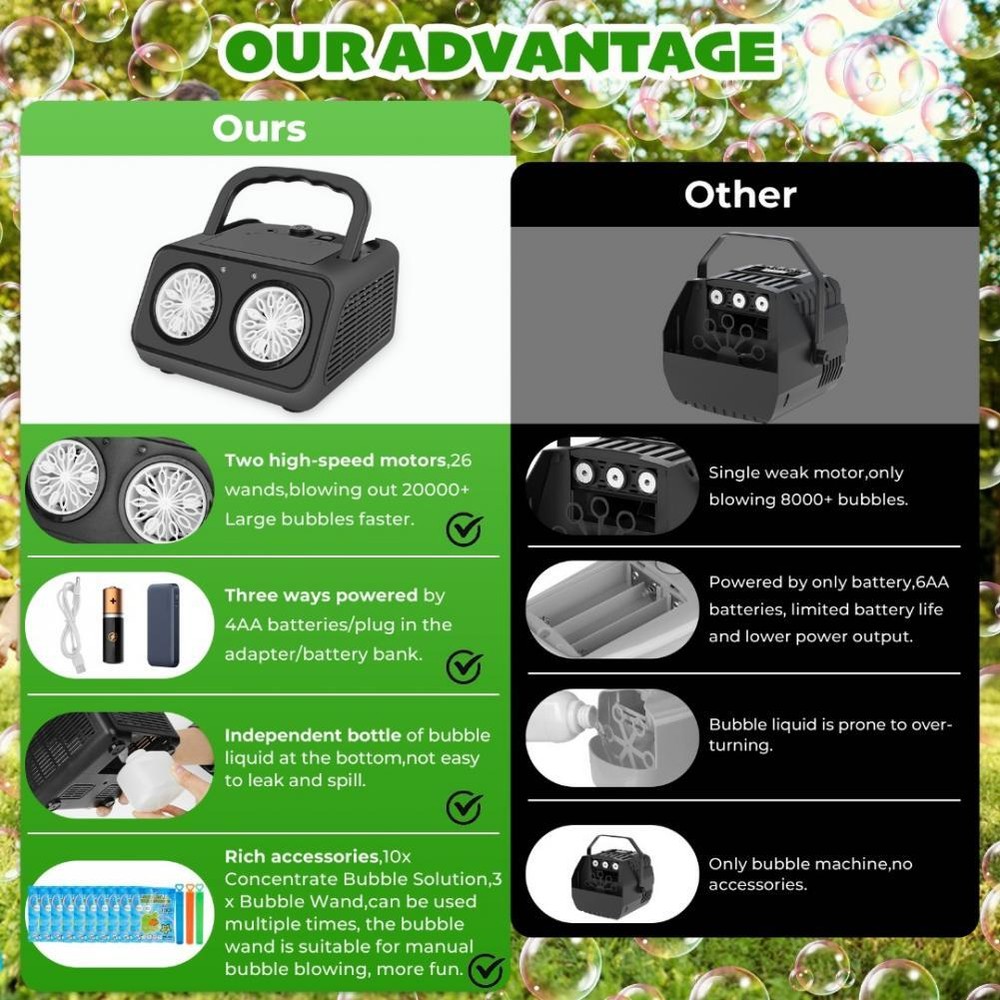 Automatic Bubble Machine Upgrade Bubble Blower w/2 Fans, Portable Bubble Maker Packing list: 1 x Automatic Bubble Machine(BATTERY NOT INCLUDED), 1 bottle 120ml Bubble Solution, 1 x Screwdriver, 1 x USB Charging cable, 1 x Funnel, 1 x Bubble Machine Instruction Manual, 3 x Bubble Wand, 9 x Concentrate Bubble Solution.; Packing size: 16.2*16.2*10.8CM Endless Fun with 20000+ Colorful Tiny Bubbles:Our bubble machine can generate over 20000+ colorful bubbles per minute with 26 spinning wands, 2 fans & super built-in motor. The bubbles emitted by the bubble machine are like tiny, glistening pearls, gracefully drifting in the air, as children chase and play in parks, courtyards, playgrounds, and lawns. Lightweight and Portable:Our bubble machine is lightweight, portable, and equipped with a separate sealed bubble solution bottle, eliminating the issue of traditional semi-sealed bubble machines leaking.It can be charged in three ways: plug in with an adapter (not included), use a power bank, or insert 4 AA batteries (not included). Enjoy bubble play anytime, anywhere. Durable and Safe:Made of durable ABS material, this kids bubble machine has been tested for child safety and complies with all US toy safety standards (CPSIA, CPC, ASTM). Our bubble machine is safe and reliable for kids, toddlers, pets, and adults. Great Gift for Kids & Pets:The ultimate outdoor toy and the best birthday gift for toddlers aged 3-5 years old. Colorful bubbles create a wonderful atmosphere, making outdoor playtime even more enjoyable. Join the bubble craze and make memories that last a lifetime.Great gift for weddings, birthdays, parties, and special occasions. 90 Days After-sales service: Miss the return window within 30 days? Choose a refund only.For troubleshooting issues, you can try resolving them on your own by carefully reading the product manual or watching related videos. Additionally, if the problem persists, you can consult our customer service team for further assistance and support. Payment Delivery details Return Contact us About us Payment 1.We accept PayPal,G Pay Credit Card,Visa ,etc. payment. 2. Please make payment within 4 days after placing an order, or eBay will automatically open an unpaid case on the fourth day. 3. You can contact us for sure if you want to cancel the order to avoid the unpaid case. Delivery details Your goods will be shipped within our handling time after your full payment. Pls note that we don't ship to Alaska, Hawaii and Puerto Rico.APO/FPO’s address. Return We accept return within 30 days, but we are not responsible for human damage.The return shipping cost is the buyer's responsibilities and try to keep it in your original package. Contact us If you have any questions please contact us through "Ask seller a question" link. We will respond within 2 business day or less. About us We are committed to providing you with a comfortable home and by functional and beautiful ceiling fans and lighting fixtures. As a professional modern lighiting fixture supplier, our team has more than 15 years Ceiling fan and lighting production experience. We are not only committed to produce high-tech, stylish, safe and high quality LED products, but also provide our professional and efficient after-sales service, making your lighting experience more pleasant and comfortable.
