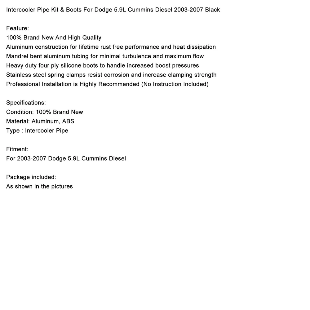 Turbocharger For Ford Fiesta Focus C-Max Transit 1.0 1761178 NEW Turbo + Gaskets 237.17 USD 249.65 USD Free shipping 5% off Turbo VGT Tune-Up Kit-Vane Position Sensor 12635324 w/ VGT Solenoid 3C3Z6F089AA 116.65 USD Free shipping Intercooler Turbo Pipe Hose T-Clamp Front Mount for Honda Civic 1992-2000 159.65 USD Free shipping Intercooler Turbo Pipe Hose T-Clamp Front Mount for Audi A4 1.8T B5 1998-2001 105.65 USD Free shipping Turbo Electronic Actuator For Dodge Ram Cummins VGT 6.7L Holset 68481772AA RE 639.65 USD Free shipping 3.5" Black High Flow Turbo Intake Elbow Fit For GM 6.6L LML Duramax Diesel 11-16 109.65 USD Free shipping New Turbo Turbocharger for Honda Civic CR-V 1.5L L15B7 2016-2021 49373-07011 235.65 USD Free shipping Hot Side Intercooler Pipe Kit For Ford F250 F350 F450 F550 6.4 Diesel 08-10 119.65 USD Free shipping Intake Charge Pipe for BMW M2 M235i 335i 435i N55 F20 F30 RWD 2012-2016 Black 69.65 USD Free shipping VGT Electronic Actuator Fits Cummins ISX Turbo part 4034289 RX or 6378270 RX 529.65 USD Free shipping Intercooler Pipe & Boot Kit For Dodge Ram 6.7L Cummins Diesel 2013-2018 R 175.65 USD Free shipping Turbo Turbocharger For 2013-2018 Dodge Ram Cummins 6.7L Holset 5326055 3799840H 1159.65 USD Free shipping SAFE & SECURE SHOPPING 100% SATISFACTION GUARANTEED FAST SHIPPING Intercooler Pipe Kit & Boots For Dodge 5.9L Cummins Diesel 2003-2007 Black Product Description Intercooler Pipe Kit & Boots For Dodge 5.9L Cummins Diesel 2003-2007 Black Feature: 100% Brand New And High Quality Aluminum construction for lifetime rust free performance and heat dissipation Mandrel bent aluminum tubing for minimal turbulence and maximum flow Heavy duty four ply silicone boots to handle increased boost pressures Stainless steel spring clamps resist corrosion and increase clamping strength Professional Installation is Highly Recommended (No Instruction Included) Specifications: Condition: 100% Brand New Material: Aluminum, ABS Type : Intercooler Pipe Fitment: For 2003-2007 Dodge 5.9L Cummins Diesel Package included: As shown in the pictures If you are not sure about the part fitment to your vehicle, please supply your Vehicle Model / VIN number / OE Part Number we will check it for you! Compatibility Chart is for the reference only. The best way to check compatibility is to check the Part Number on your old unit if possible. To contact your main dealers for the required part number. Please check the picture or part No. before placing an order. SHIPPING & HANDLING RETURNS WARRANTY ABOUT US SHIPPING & HANDLING ♦Every item will be inspected and packed carefully before shipping. ♦All packages will be shipped within 1 business days,and the estimated delivery time is 2-7 working days. Please note that we do not handle any orders in weekend nor holidays, all orders come during weekends or holidays will be processed in next working day. ♦Please understand that once the order is accepted by courier, it's out of our control. Shipping could be delayed by various reasons such like the weather, strike, or anything unexpected, we don't take responsibility for delay due to "severe weather". ♦If you have not received it within 10 days, please contact us first, and then we will arrange to resend or refund to you asap. ♦Buyer is responsibility to the accuracy of eBay delivery address, and pay attention to the delivery updating(we guarantee all orders can be tracked online). Once the package forced to return to us due to wrong address or attempt delivery but failed over two times, we have no choice but ask buyer to pay second shipping charge, not to mention the terrible delay it caused. ♦Please be aware that your order could be putted on porch or at the front of door when nobody at home, in very rare instances, package could be stolen, we are sorry that the courier and us do not take any responsibility, as long as it's showing "delivered" in system, the only help we can offer is provide prooves when police need it. RETURNS ♦We offer 60 days return window, it means you could return the order freely in 60 days of purchase. Please note that it requires that item is unused/uninstalled/unmodified, as the same condition as it's delivered. Though, we hope every buyer could inspect the part as quick as you can, to confirm if the part is the right one you need and make an early decision. In case the item arrive directly to workshop, please tell merchanic to inspect it clearly before set it up so hurry. ♦If you have a defective item which you want to return or exchange, please contact us after you receive the package. We will refund or make a replacement depends on your requirement. ♦Generally, every refund request should have the purchased item returned to us. We strong recommend the return procedure inside ebay, it helps both seller and buyer process return smoothly. In cases buyer can provide photos/pictures as proof, showing the item is dead/malfunctioning, we fully trust our customers and will refund directly without ask for the item back. ♦All refunds will be issued once the item arrives at our warehouse. The refund will then be credited back using the same method as when your initial order was made. The processing time typical takes 3-5 working days. However, this can depend on your financial institution. ♦We do not accept returns if the item(s) has been used/installed, working properly but buyer decided to return, or has been modified for some reason after buyer have received the item(s). WARRANTY ♦60 Day Money Back Guarantee ♦The warranty does not extend to normal wear and tear of products; products damaged due to environmental conditions including rain, snow, hail, salt, or natural disasters; products damaged due to accident or collision; or product damage caused by other faulty parts. ♦All items must be in their original condition and must not be damaged due to incorrect installation upon return. Products damaged as a result of abuse, misuse, improper repairs or maintenance