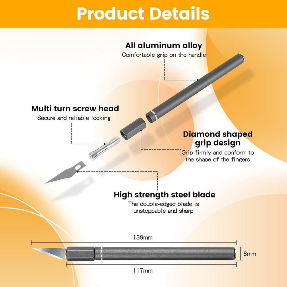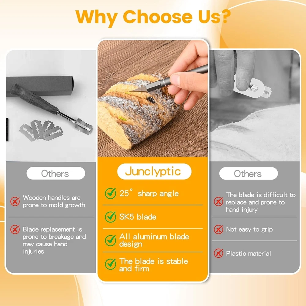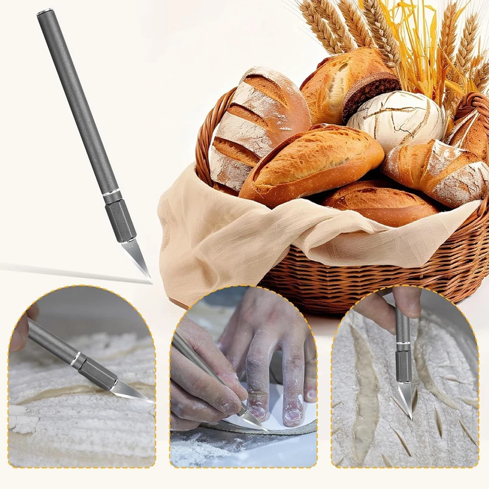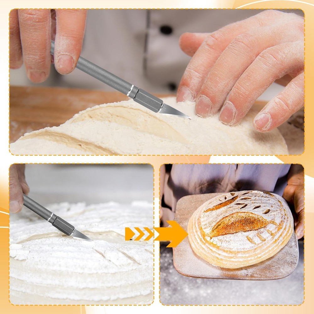 Free eBay listing template designed by dewiso.com Upgraded Bread Lame with 10 Blades - Professional sourdough Scoring Tool for bread scoring tool, Safety Cover & Ergonomic Handle - Premium Bread Scoring Knife for Artisan Bread Making FREE AND FAST SHIPPING! About this item Pro-Grade Precision Bread Lame. Engineered for perfection, our stainless steel bread scoring tool delivers ideal weight distribution for flawless control. Experience professional bread lame dough scoring with surgical precision, whether creating ear patterns or decorative designs, every slash lands exactly where intended Complete Sourdough Scoring Kit. The ultimate sourdough tools collection, featuring an adjustable-angle lame, 11 surgical-grade blades, scoring templates, and silicone finger shields. Master advanced techniques like wheat stalks or geometric patterns with this artisan's toolkit Safety-First Scoring Knife. Our lame bread tool knives where the blade is held by a chuck-type clamp that you turn to close or open. This makes it much easier to install or change blades. The included magnetic docking station ensures safe storage and instant access - no more fumbling with exposed blades Effortless Professional Results. The revolutionary scoring knife for bread baking features a gyroscopic balanced handle that naturally aligns to your cutting motion.The blade size of the bread scorer is just right, making it easy to control the cutting depth and achieve good baking results Usage scenarios and storage: bread cutting patterns, baking carving, vegetable and fruit carving, plate decoration, cheese cutting, and other food processing. Handmade creations: soap/clay carving, Halloween pumpkin lantern. Please dry the bread knife apply cooking oil and store it in a dry place. Product We offer a 30-Day Return Policy on items which you are not completely satisfied with. You have the option for a full-refund or an exchange of the item. No returns are available on items shipped outside of the US . Shipping We offer Free Shipping to the US and ship within 2 business days of payment, usually sooner. We use UPS express shipping. That's why your products are usually delivered within 3 days . Contact We try our very best to make sure every customer is completely satisfied. If there's a problem , message us! We're happy to help. 24/7 live chat available.