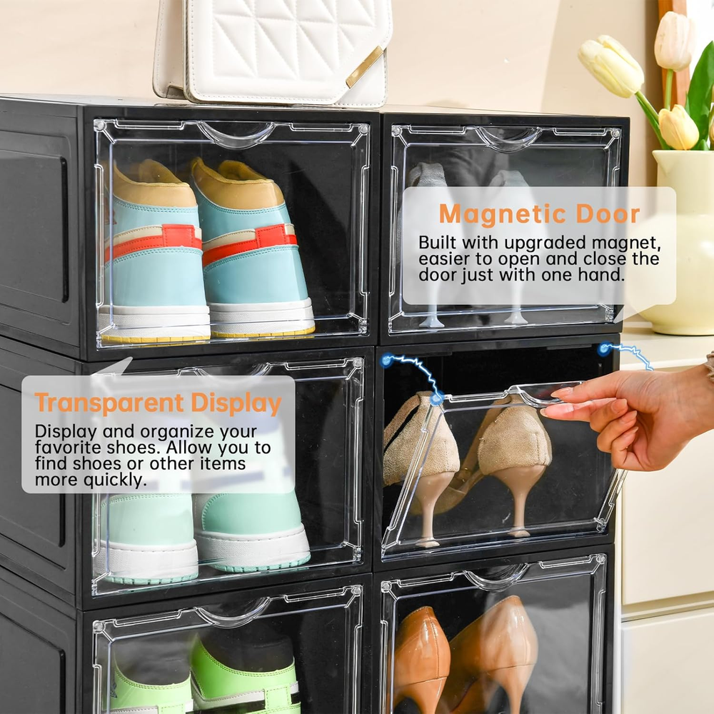 plastics 【XLarge Shoe Storage Box 】: Our sneaker storage is made of heavy-duty plastic, its thick design guarantees its liability and durability. The size of each package is 13.4x9.84x7.5 inches (length x width x height). 【Magnetic Door& Ventilate Design】: Our shoe box storage containers built with upgraded magnet, Its door has two upgraded magnet provides suction when door is closed. Ventilation design keep fresh air exchange all the time, effectively prevent odor. 【Sturdy And Stackable】: The shoe storage box has a simple interlocking design, and each stackable shoe bins can be connected together, keep it from falling when tilting. These drop front shoe boxes are stackable for easy shoe organization and sneaker storage. 【Transparent Display Design】: Display and organize your favorite shoes with clear viewing shoe box storage. If you want your shoes safe and clean, this shoe box is your perfect choice! 【Shoe Boxes】: This upgraded shoe box is not compatible with other shoe boxes in our store. If any shoe box are found to be defective. Please contact us. We will be there at your service! Product Description