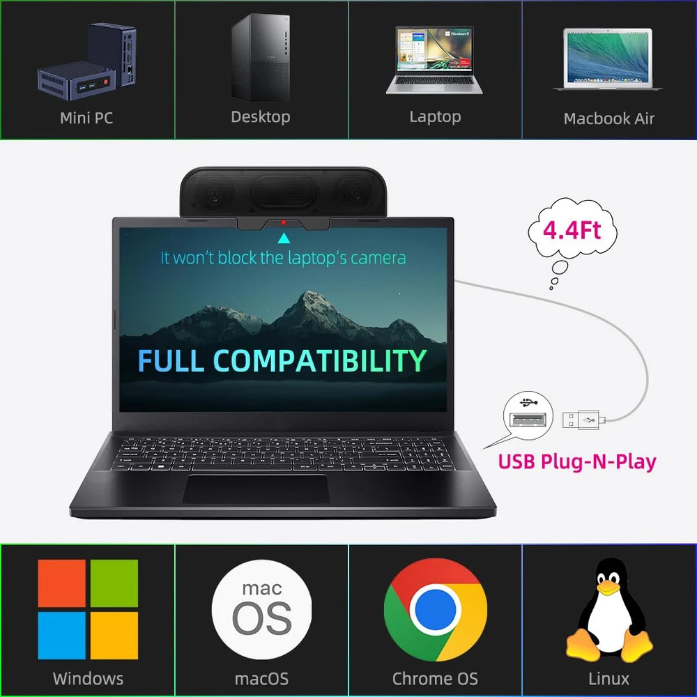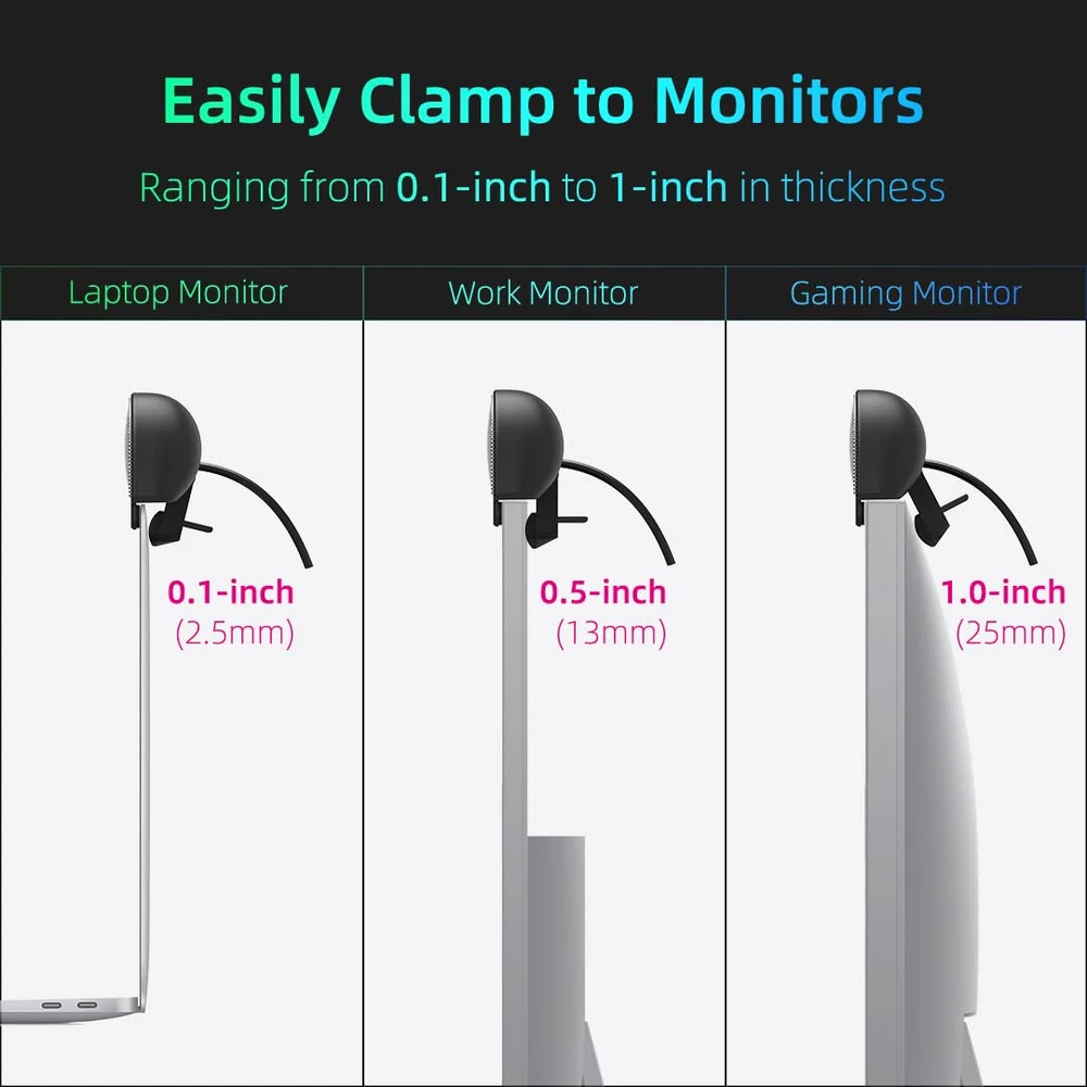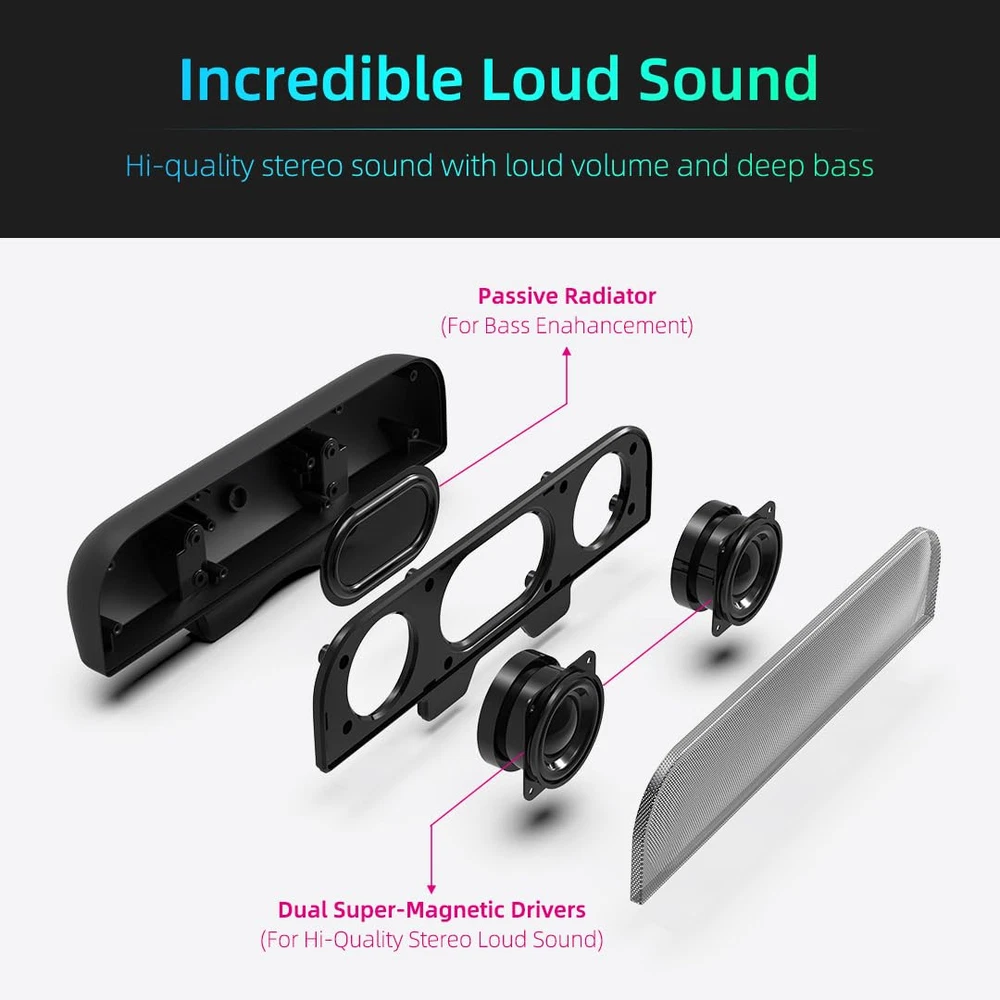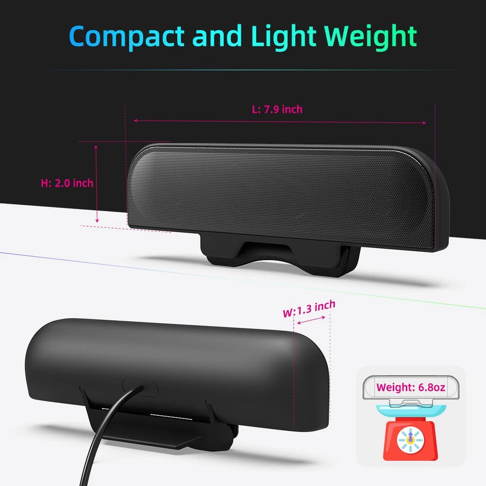 INCREDIBLE LOUD SOUND WITH DEEP BASS: The desktop computer speaker features dual super-magnetic drivers and a passive radiator, ensuring the delivery of hi-quality stereo sound with loud volume and deep bass from such a small body. EASILY CLIP-ON, SAVING DESKTOP SPACE: The monitor speakers can be quickly and easily clamped to the top, side or bottom of the monitors ranging from 0.1-inch to 1-inch in thickness, which effectively saves your desktop space. And of course, the patented clamp also allows the speaker to be placed smoothly on your desktop. USB PLUG-N-PLAY, VERY EASY TO USE: No need for 3.5mm headphone cable and driver software, only the single USB cable can feed both audio and electric power to the PC speakers, which greatly help avoid messy cables. FULL COMPATIBILITY: Proven by millions of users of our USB speakers, this enhanced computer sound bar would be a great external speaker for Windows/macOS/Chrome OS/Linux PC, laptop and desktop computers. NO EXTRA BUTTONS NEEDED: This USB plug-in speakers do not have any volume control buttons, you can simply adjust the volume on your computer system without needing to adjust both system volume and speaker volume like other computer speakers.