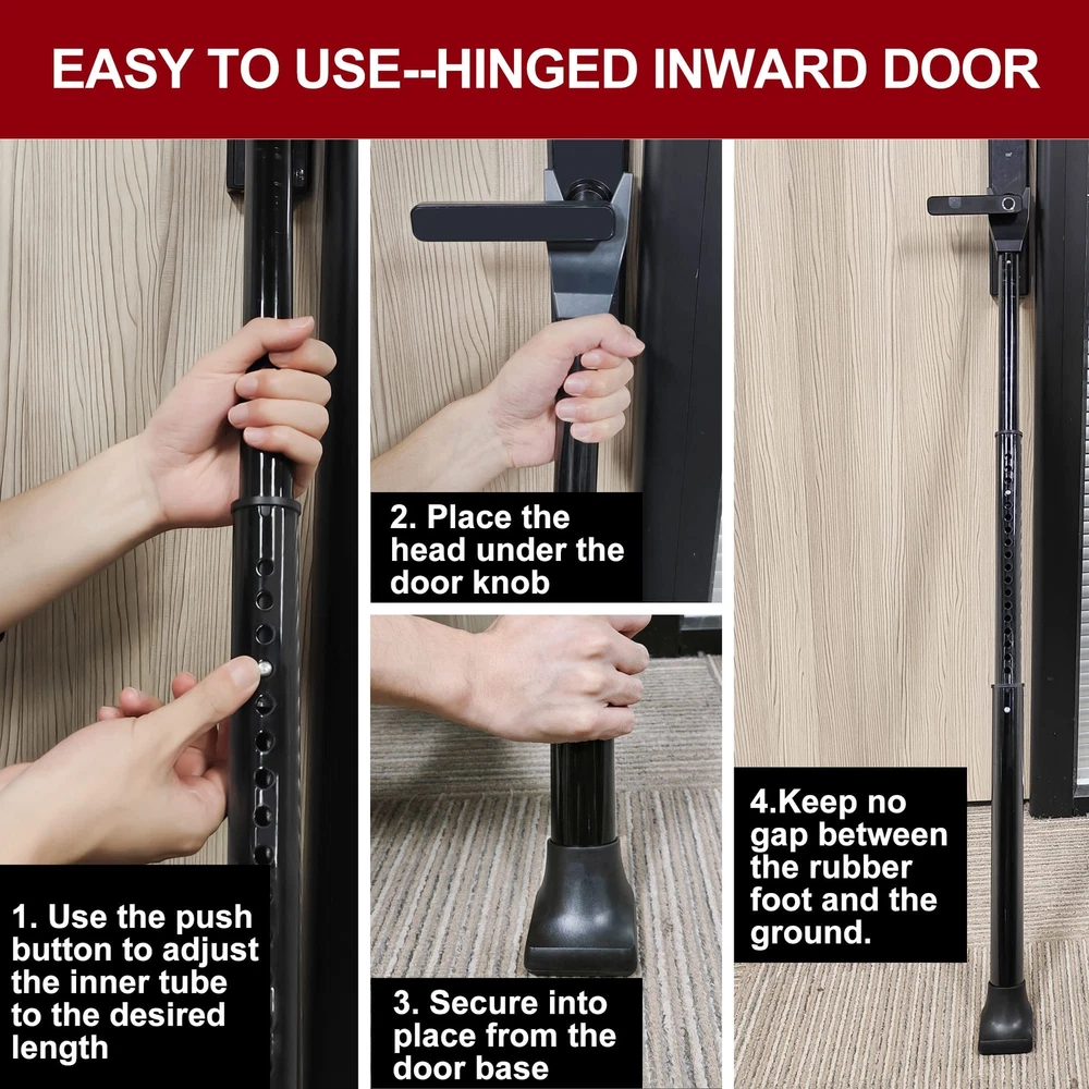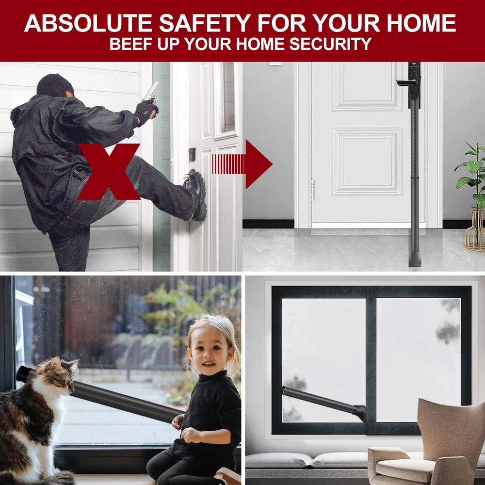 Bar for Security: If you are concerned that your windows and doors aren't sturdy enough or you feel it is unsafe when travelling alone, 's door stick security will offer you a complete sense of security with only one easy-to-use but distinctive lever which is also easy to install 2-in-1 Door and Sliding Door Security Bar: Use our adjustable security door bar to deter burglars from breaking into your house, apartment, or even hotel room; The length of the door barricade security bar can be adjusted from 21 to 46inch, and the full product weighs only 2.2 pounds, making it easy to carry during travel or store at home Easy to Use: According to our product manual or the installation instructions on the detail page, the door brace security bar is very simple to use, has a three-stage structure, and can be quickly deployed; This allows you to quickly strengthen your defense; However, while using it, you must be careful to ensure that there are no gaps between the rubber head and the ground Versatile and Enhanced Design: The bar is equipped with enhanced high-strength alloy connections to extend the service life; It also features thickened 1.57inch pipe diameter design, high-quality material upgrades and plastic components made of high-strength fiberglass material making it stable and sturdy; Since the security bar on an door stopper can endure 350 pounds of force, an invader would have to be as strong as a heavy weight boxer to open the door Customer Service: provides 20 months customer services; If you run across any issues or face any problem with the security bar for front door, please get in touch with us; Bring extra security for your loved one’s home without delay