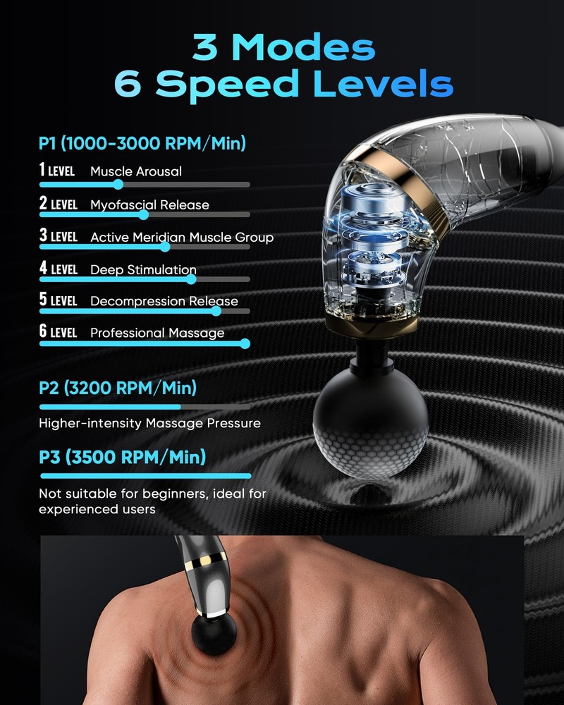 【Upgraded Extended Handle & Quick Pain Relieve】Our massage deep tissue is designed with an easy-to-grip extended handle and an ergonomic 120° curve that perfectly aligns with the natural curvature of your spine. Unlike regular massage , our massage deep tissue allows you to effortlessly reach and relax your back, neck, shoulders, arms, legs, and other hard-to-reach areas. Suitable for pain and speeding up recovery from sports injuries, it is a must-have for anyone seeking effective muscle relaxation and rejuvenation 【Smart LCD Screen & 4 Massage Heads】Our massage features an intuitive LCD screen that shows mode, speed level, and battery life. It comes with 4 massage heads to meet your various needs. When the massage is powered off, press the On/Off Switch once to check the battery level. Press and hold the On/Off Switch for 2 seconds to turn on the massage 【3 Modes & 6 Levels】Customize the massage with 3 modes and 6 speed levels. P1 Mode features 6 adjustable speed levels (1000-3000 RPM). P2 Mode (3200 RPM) and P3 Mode (3500 RPM) have a fixed speed setting. In P1 Mode, press the on/off Switch to adjust the speed from level 1 to 6. You can switch between modes by pressing the P key 【Long Battery Life】Recharge quickly in just 90 minutes with a USB-C cable. Enjoy a 15-minute massage session daily, and our massage will keep you relaxed for up to 15 days on a single charge. When the battery level shows 99, it indicates a full charge. Do not use the massage while it is charging 【Lightweight Holiday Gift Idea】Our massage is ergonomically designed for ease of use and portability. It's lightweight and comes with a user manual, this massage offers the best massage experience at home, in the gym, or at the office. This makes it the perfect present for Mother's Day, Father's Day, or any special occasion for your family, loved ones, and friends