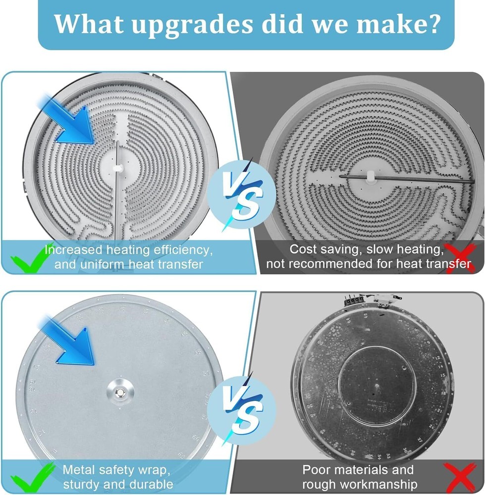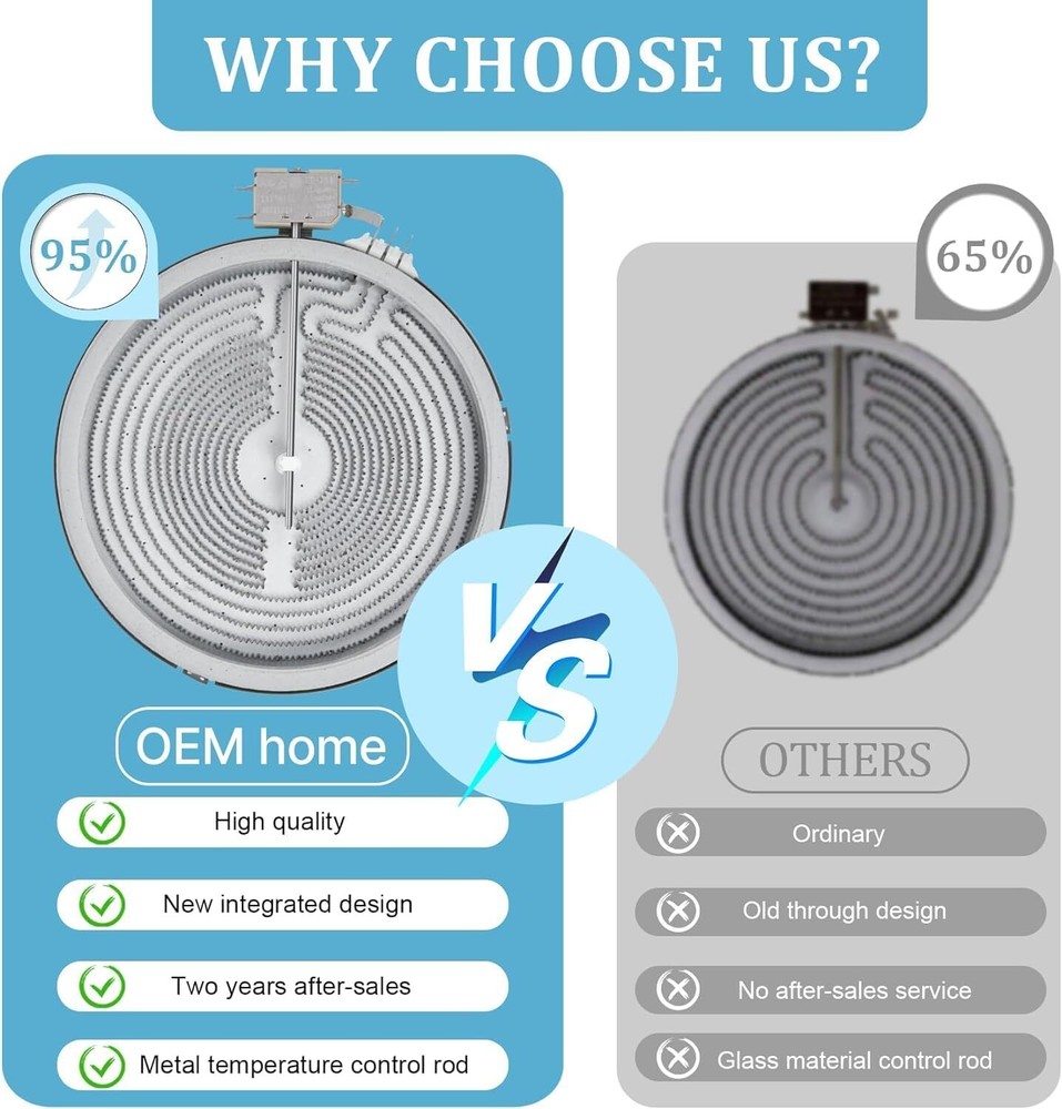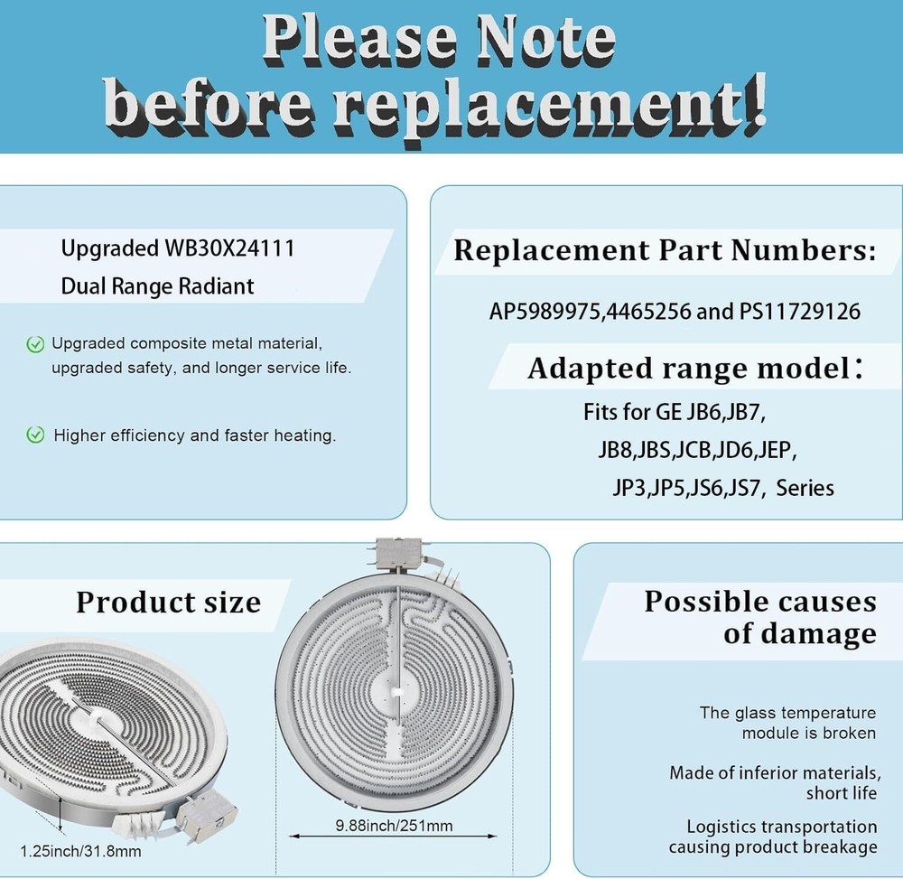 【 Excellent Quality 】WB30X24111 9in Dual Range Radiant component temperature sensor has been upgraded to a new composite metal material,with a longer service life. 【 High Adaptability 】Upgrade WB30X24111 for GE range dual radiant element 9 radiant surface element,Compatible with GE Range,replacing: WB30T10133, AP5989975, 4465256 and PS11729126.Circuit connector improved, easy to connect operation. 【 Stronger heating 】Upgrade WB30X24111 Replace for GE glass cooktop replacement : WB30X24111 haliant surface element dual radiation range, and the heating increased, resulting in higher efficiency and faster heating. 【Note】Before installing WB30X24111 9in Dual Range Radiant, take a photo of the original element's interface wiring pattern. Install the wires to the new component terminals according to the connector markings in the photo. If the component doesn't work post-installation, double-check the interface connection. 【Service】Upgrade WB30X24111 for GE electric stove oven replacement parts,we offer 24 hour customer service, If you have any product questions, please leave a message with us via Amazon; We'll get back to you within 12 hours.