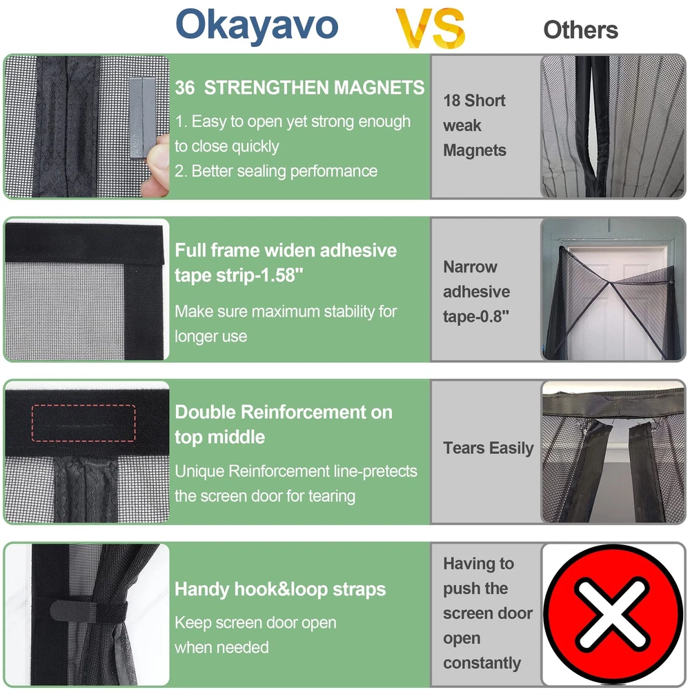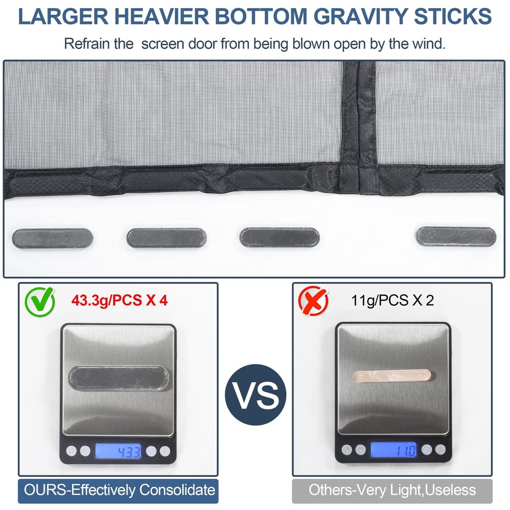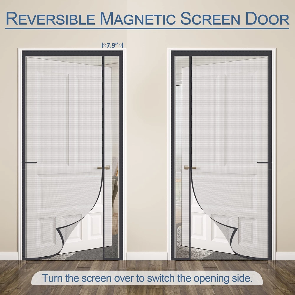 Why Upgraded Reinforced Retractable Magnetic Screen Door 1.UPGRADED HEAVY DUTY MESH:Made of reinforced thicker Mesh(255g/m²), which is stronger than ordinary old version screen door mesh(Only 134g/m²).This reinforced thicker Mesh magnetic screen door has a tough texture, high tensile strength, and wear resistance. It is sturdy, tear-proof, and scratch-proof, so there is no need to worry that the door screen will be broken in a short time. thickened reinforced mesh. 2.Left & right side universal opening,this retractable screen doors for front door can be switched freely according to the position of your door handle. 3.36 longer&stronger Magnets run along the entire Closing strip of the magnetic mesh screen for door. 4.Extra 4 HEAVIER heavier bottom gravity stick sewn-in,Refrain the mesh door screen with magnets heavy duty from being blown open by the wind. 5.Full Frame Widen Adhesive Tap Strip-1.5 Inch,make sure maximum stability for longer use. 6.Unique Reinforced Line in Top Middle,Protects the top middle of the patio screen door for tearing. 7.Handy hook&loop straps included-Keep Door open when need. UPGRADED HEAVY DUTY MESH:Made of reinforced thicker Mesh(255g/m²), which is stronger than ordinary old version screen door mesh(Only 134g/m²).This reinforced thicker Mesh magnetic screen door has a tough texture, high tensile strength, and wear resistance. It is sturdy, tear-proof, and scratch-proof, so there is no need to worry that the door screen will be broken in a short time. thickened reinforced mesh LEFT & RIGHT SIDE UNIVERSAL OPENING-Made of soft plush edging, this magnetic door screen can be attached with hook&loop tape on both sides, so that this door net screen with magnet can be switched freely according to the position of your door handle. With side opening screen door magnets,you can see a you can see a nicer unobstructed rectangle of light (vs a line going through the middle of it while you are using middle opening door magnetic screen). EASY TO INSTALL: Screen Door Measures 37"x 81”, Fits Door Sizes: 34"x 80”. It is super simple, quick and fast to install the sliding screen door. Simply attach it to the door frame with the included Velcro-like strips. Extra push pins are included for added security and strength. For best adhesive results, clean and dry surface properly. MORE POWERFUL MAGNETS:There are 36 pcs longer&stronger Magnets run along the entire Closing strip of the magnetic mesh screen door,the stronger and more powerful magnetism provides a "no hands needed" and self sealing way to get in and out of your home. Magnetic screen door mesh curtain never Breaks Gaps. LARGER HEAVIER BOTTOM GRAVITY STICKS:With Powerful magnetic force in the entire closing strips and the extra 4 HEAVIER BOTTOM GRAVITY STICKS sewn-in,Refrain the magnet screen door from being blown open by the wind. DOUBLE REINFORCEMENT:Full Frame Widen Adhesive Tap Strip-1.5 Inch,make sure maximum stability for longer use.Unique Reinforced Line in Top Middle,Protects the top middle of the mesh screen for door for tearing