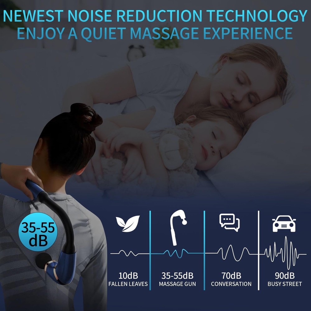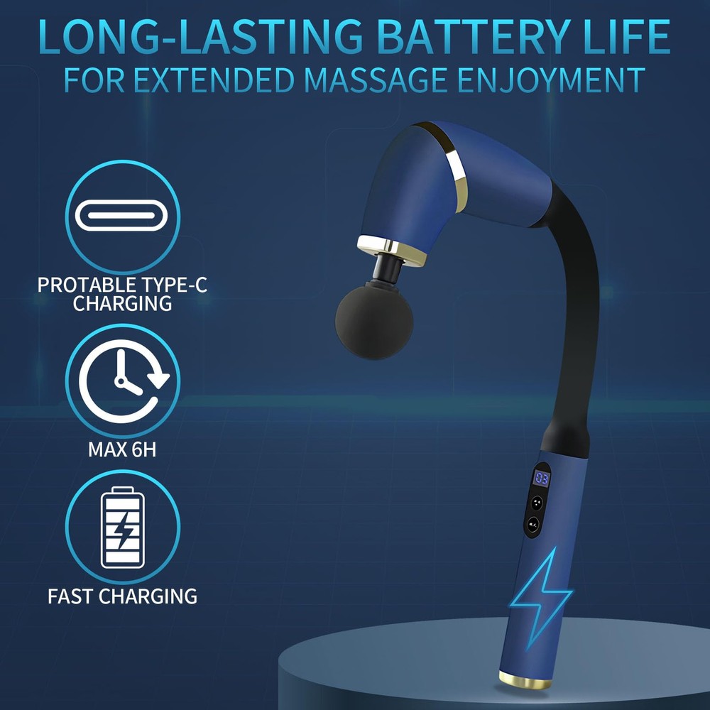 【Upgraded Extended Handle and Ergonomic Design】Our massage gun features an extra-long handle and ergonomic 120° U-shaped design and can fit your spine and waist naturally.Compared to regular massage guns, it's easy to target your back and hard-to-reach areas, allowing you to select your desired massage area more effortlessly. It's a must-have for pain relief and accelerating recovery from sports injuries. 【Powerful Motor and Long Battery Life】Equipped with brushless motors for intelligent control, more scientific control of intensity and frequency, noise reduction information and extremely comfortable high-frequency percussion to relieve deep tissue pain. Our percussion massage gun charges fully in under 2hours via USB Type-C, Enjoy a 15-minute massage every day, allowing you to easily experience a massage journey of up to 15 days on a single charge. 【LCD Screen & 4 Massage Heads】Our massage gun features an intuitive LCD screen, can help you intuitively observe the mode, speed level and battery life.It comes with 4 massage heads to meet your various needs. Includes 1 x Spherical head suitable for relaxing and muscle sculpting; 1 x U-head simulate multi-point massage, evenly distributed force; 1 x Flat head stimulates deep muscle tissue; 1 x Conical head for trigger point pressure release. 【3 Modes & 6 Speed Levels】Our Cordless Muscle Massager has 3 operating modes and 6 speeds adjustments, You can choose the corresponding mode and speed according to your preferences.Switch modes by pressing the P key, Let you enjoy a deep massage experience at home. 【Best Gift Idea】 This Portable Back Massage Gun is especially suitable for people with sore back, shoulders and muscles. This makes it the perfect present for Mother's Day, Father's Day, or any special occasion for your family, loved ones, and friends.