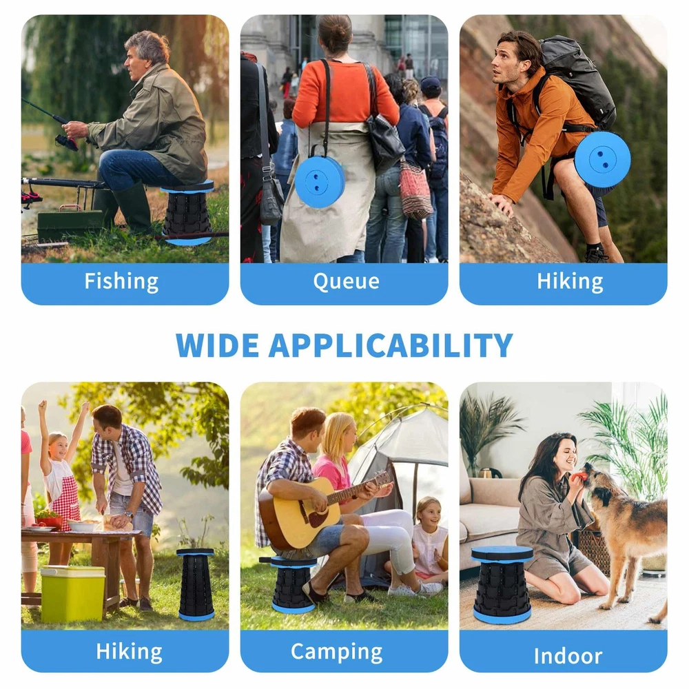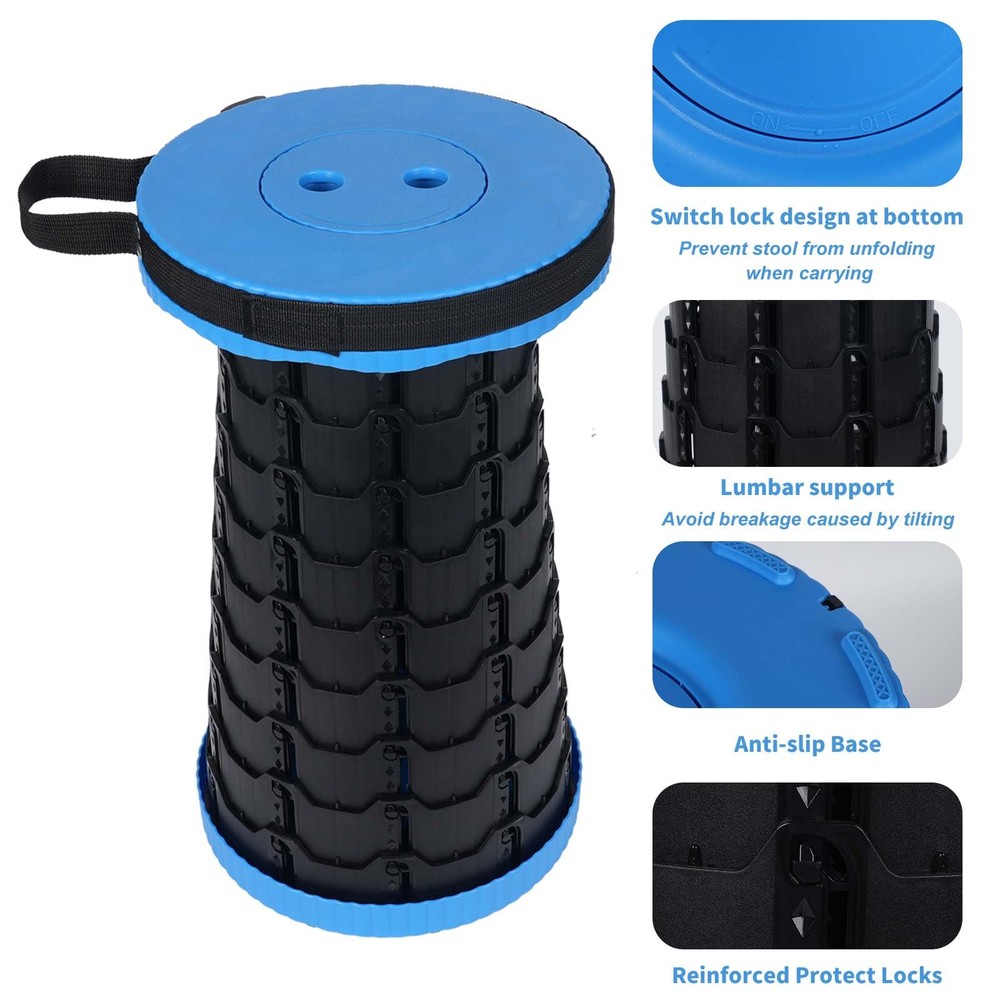 PORTABLE DESIGN: This portable collapsible stool is only 2.54 pounds, with a diameter of 9.7 inches/25cm, and can be folded into 2.4 inches, which is easy to carry and store. The adjustable shoulder strap makes it easy to carry or hang over the shoulder. You can fold the collapsible stool up and put it in your bag. No matter where you go, you can sit anytime, anywhere. MORE COMFORTABLE: This newly upgraded portable collapsible stool is made of high-density thickened PP material, which is hard, stable, scratch-resistant, and wear-resistant. The bottom of the portable stool has a non-slip design, and the side support and anti-tilt ability have also been strengthened, making the stool more durable and safe. Easy To Open And Use: The interior of this portable collapsible stool is designed with stiffeners to hold it in place, making the stool stronger and easier to open and close. The top and bottom of the collapsible stool are designed with two holes, you need to hold the two holes, stretch and turn them clockwise/counterclockwise, and easily open and close them. Height Adjustable/Retractable: The telescoping stool adjustment range: is 2.4inch - to 17.5inch, you can adjust the height according to your needs, this adjustability makes it suitable for adults and children. The telescoping stool is a great gift for anyone looking for a portable stool and a telescoping stool. Wide Application & Satisfaction Guarantee: Portable telescoping stool is very suitable for indoor and outdoor, such as living room, bedroom, office, camping, travel, fishing, leisure, grilling, gardening, etc. The beauty, functionality, durability, and portability of the telescoping stool make it the best choice for friends and family for holidays or any occasion.