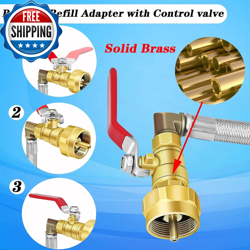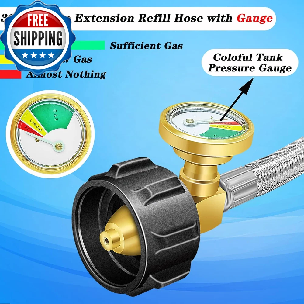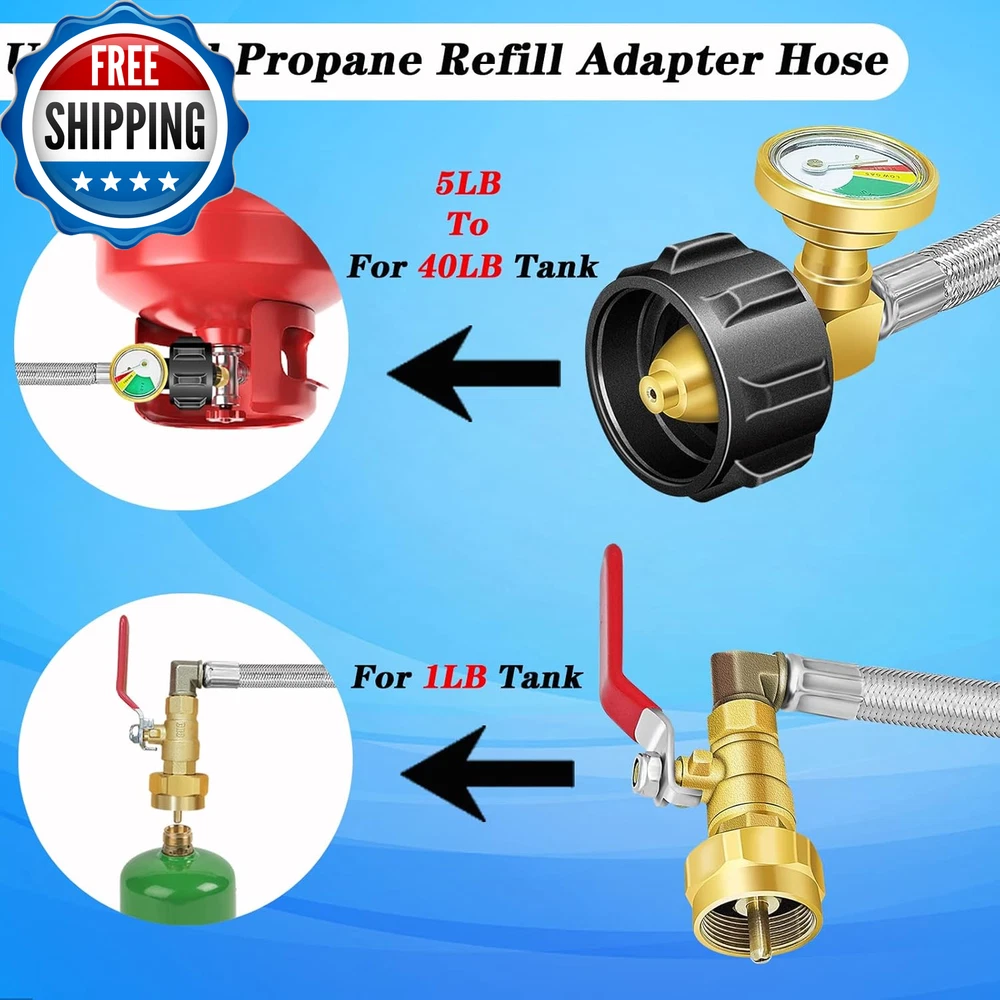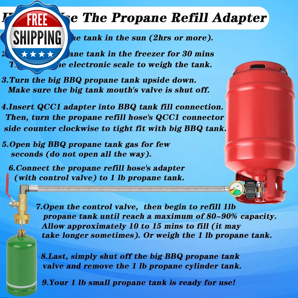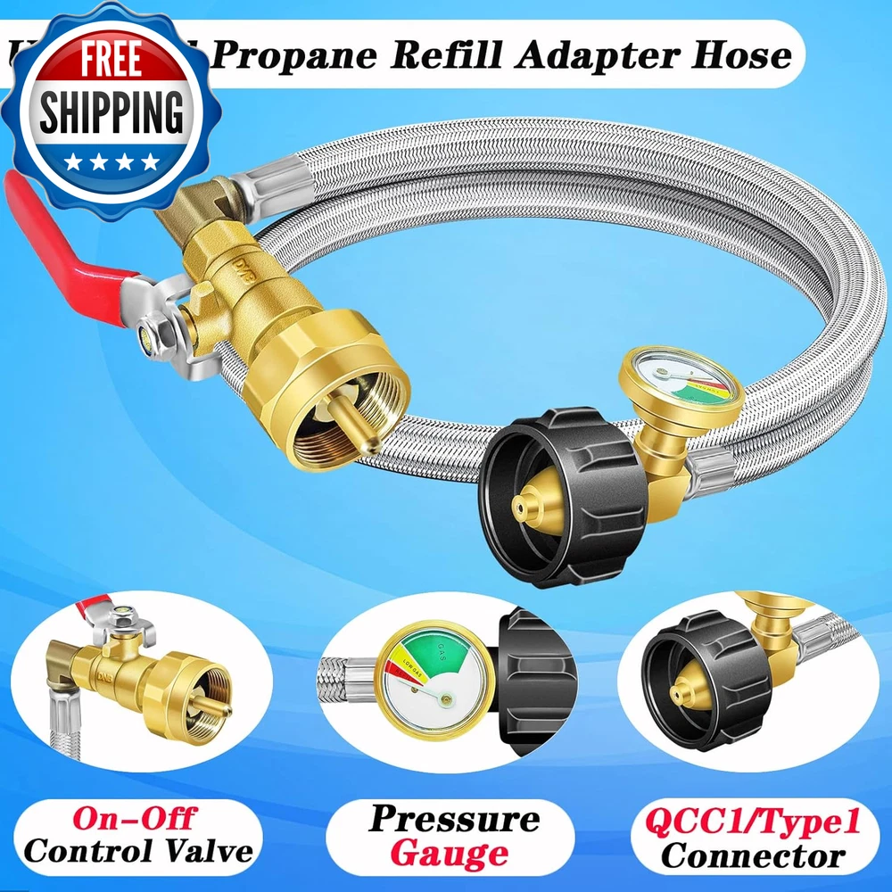 Upgraded Propane Refill Adapter Hose with Gauge and On/Off Valve, 36" Propane Extension Refill Hose Kit, 1LB Propane Filling Hose Set with 1 LB Propane Bottle Cap, Roll Sealing Tape (Stainless Steel) 【Upgraded Propane Refill Adapter Hose】The 36" 1LB propane refill hose upgrade to coloful dial gauge (match with tank gauge level indicator) , which allows you to read and monitor the gas level without necessarily removing the tank, and can detect the leaks. Besides, the 36" propane refill hose upgrade to stainless braided hose with Shut-Off ball Valve. 【How to Use】Step 1: Connect the QCC1 adapter to your big propane tank. Step 2: Open gas for few seconds or it may not work. Step 3: Connect the side of the tank adapter connection with shut-off control valve to your small propane bottle. Step 4: Refill your 1lb bottles with propane from the big propane tank. If you do not want to refill,close the refill valve. So, you can refill the 1lb propane bottle from 20-50Lb propane tank directly without having to move or carry the large tanks easily. 【Product's Standards】The QCC1 Type inlet propane refill adapter hose meets the US CSA certification to ensure safety and durability. And the length of the Upgraded propane refill hose is:3 feet / 36 Inch / 91 cm. Rate pressure of the propane extension refill hose: 350PSI rated high pressure. 【Upgraded Material】The propane extension refill hose is made of stainless braided and the QCC1 male connect, propane tank gauge , gauge, and 1lb bottle tank adapter connection with shut-off control valve is made of premium brass to ensure secure and durable for long-lasting to use. And Anti-aging, anti-corrosion, heat-resistance, air tightness, flexibility features,ensures air tightness and stability. 【Wide Compatibility】The updated propane refill adapter hose can be compatible with camp stoves, heater, portable grill, home applications and so on. Ideal tool set for camping, tailgating, heating needs or having an outdoor cookout. 【Propane Refill Adapter Hose Kit】The propane extension refill hose set comes with 1pcs upgraded 36" stainless braided propane extension hose with coloful dial gauge and on-off control valve, 1pcs 1lb propane bottle cap, 1 roll sealing tape, 1pcs flannelette bag. Upgraded Propane Refill Adapter Hose, 36" Stainless Braided Propane Extension Refill Hose with Gauge, Shut off Valve, 1LB Propane Filling Hose Kit with 1 LB Propane Bottle Cap, Roll Sealing Tape Batteries Required? No Power Source NO Maximum Pressure 350 Pound per Square Inch Color Black Product Dimensions 7.4 x 4 x 0.74 inches Material Stainless Steel Country of Origin China Item Weight 1.32 pounds Shape Round Batteries Included? No Item Length 3 Feet Shipping Fast shipping is very important for us. Our standard US shipping service is FREE. Your order will be shipped within 2-3 business days upon full payment received. Your order will be delivered within 2-3 business days after the handling time. We only ship to the confirmed PayPal address. We reserve the right to cancel any order for any reason at any time. We are not responsible for undeliverable addresses. Returns and payment We offer a 30 days return policy from checkout winning date. We allow only PayPal as payment method FeedBack Your feedback very important to us, after you get your package and you are satisfied with our service please leave us positive feedback If you have any problem with your order / any questions please before leave any type of feedback Please visit our eBay store to check out other items for sale! Thank you for shopping at our store.
