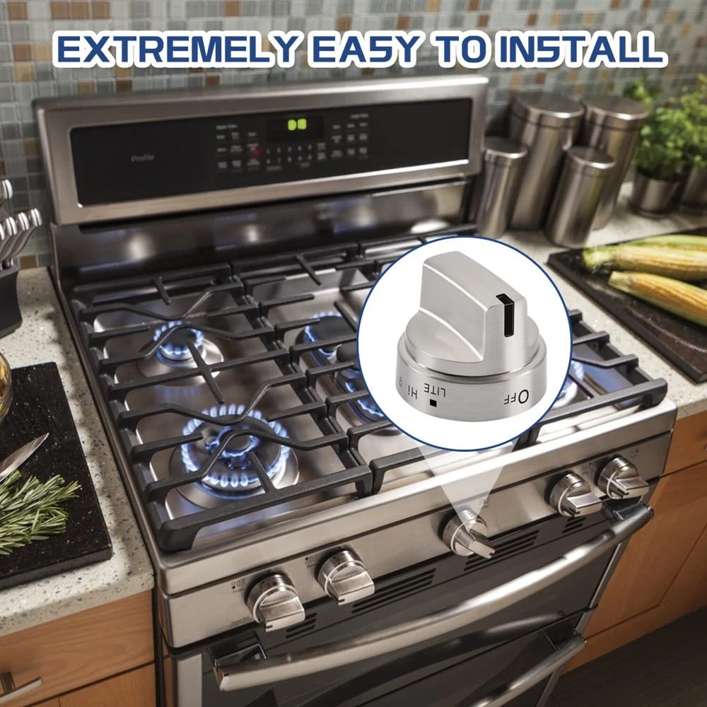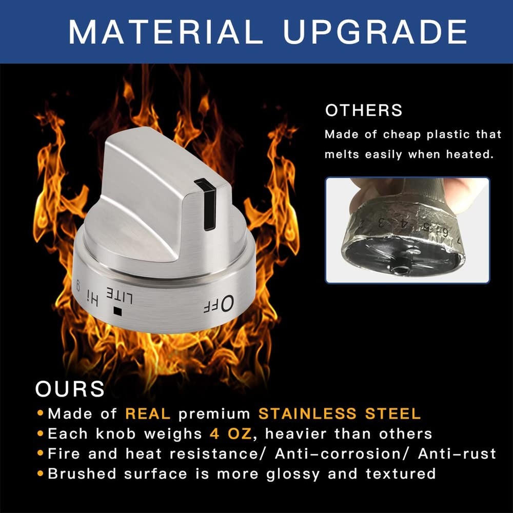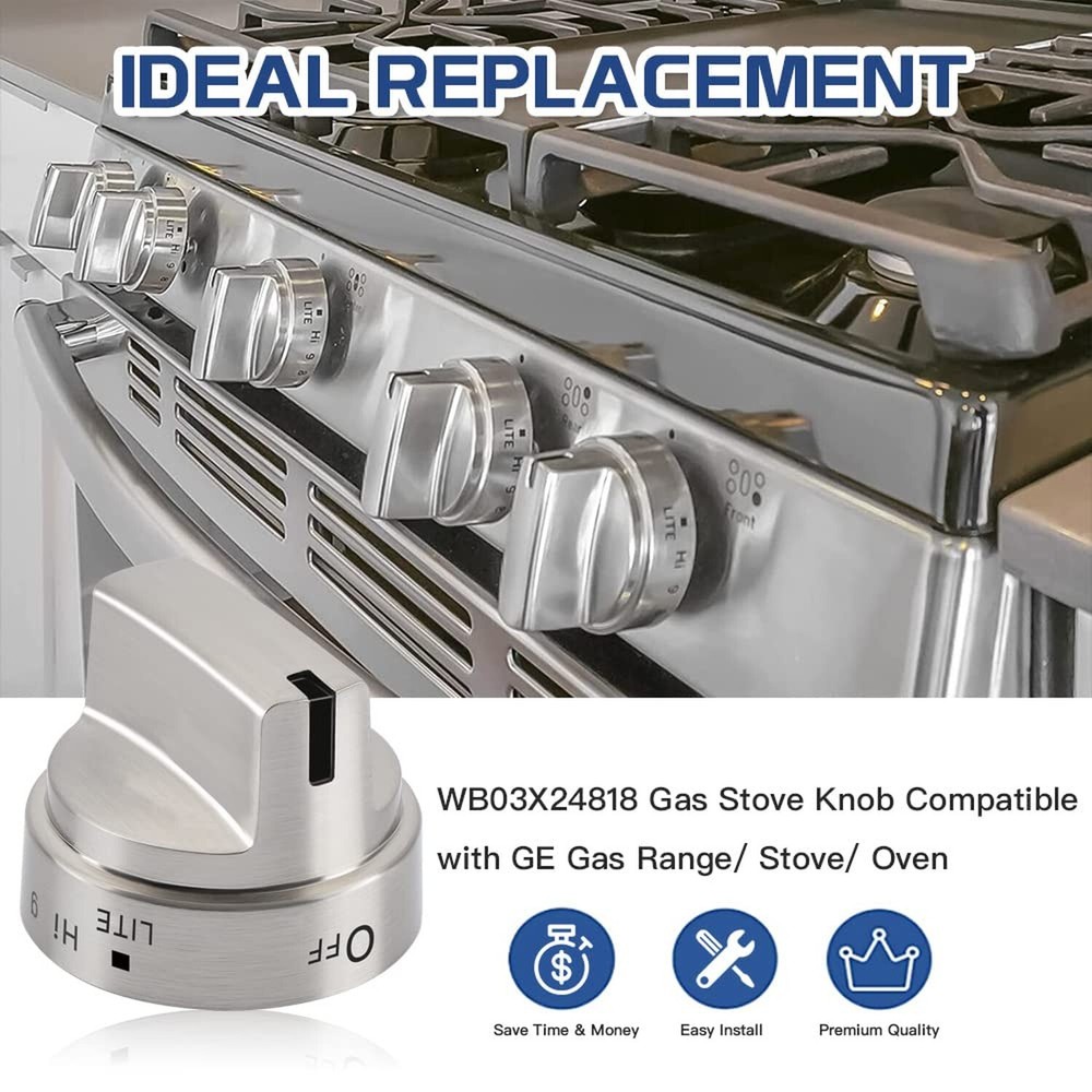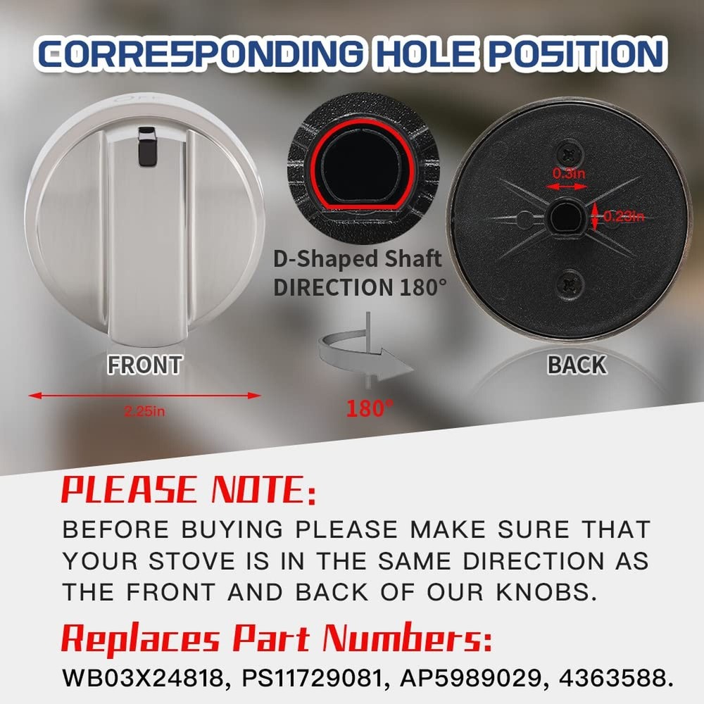 [Upgraded] Stainless Steel GE Stove Knob WB03X24818, Gas Range Burner Control Knob Replacement Part, Replaces AP5989029, PS11729081 (5Pcs Stainless Steel) Product Details Style: 5Pcs Stainless Steel Brand: KOZHOM MPN: Does not apply UPC: Does not apply EAN: Does not apply Material: Stainless Steel Brand: KOZHOM Color: Silver Product Dimensions: 2.25"L x 2.25"W Exterior Finish: Stainless Steel Material: Stainless Steel Brand: KOZHOM Color: Silver Product Dimensions: 2.25"L x 2.25"W Exterior Finish: Stainless Steel Special Feature: Easy to Install, Durable Included Components: Knob Item Weight: 4 Ounces Metal Type: Stainless Steel Handle Material: Stainless Steel Hand Orientation: Ambidextrous Package Type: Flat Free Package Unit Count: 5 Count Number of Items: 5 Manufacturer: KOZHOM Brand Name: KOZHOM Item Weight: 4 ounces Special Features: Easy to Install, Durable Material Type: Stainless Steel Batteries Included?: No Batteries Required?: No Date First Available: May 19, 2022 UPGRADED VERSION - This WB03X24818 Gas Stove Knob is made of REAL premium STAINLESS STEEL, NOT other cheap plastics on the market. The weight is heavier than other knobs. Fire and heat resistance, anti-rust, anti-corrosion, more durable and provide longer service life. The brushed surface is more glossy and textured. WIDE COMPATIBILITY - The range surface burner knob replaces part numbers: PS11729081, AP5989029, 4363588. Compatible with GE gas stove and models: JGB645EEK1ES, JGB660EEJ1ES, JGB700EEJ1ES, JGB720EEJ1ES, JGB735EP1ES, JGB860EEJ1ES, JGBS62REK1SS, JGBS66EEK1ES, JGBS66REK4SS, etc. IDEAL REPLACEMENT - Item Dimensions: 2.25"x 1.9"H, D-shaped shaft: 0.25''Lx 0.22''W. This Range Dial Knob features bold markings for OFF, Lo, 1, 2, 3, 4, 5, 6, 7, 8, 9, Hi, and LITE. Please carefully check the size of the D-shape shaft at the bottom of your original knob before purchase. SIMPLE INSTALLATION - No tool required. Easy to install the part YOURSELF and quickly get your range oven burner back to work within few minutes. Exceed OEM Quality At Half The Price. Saves your time and money. WHAT YOU GET - 5 x WB03X24818 Surface Burner Control Knobs for GE. We have a professional after-sales service team. For any reason you're not completely satisfied, please don't hesitate to contact us, we promise excellent quality and customer service. Customer satisfaction is our tireless pursuit. Upgraded Wb03x24818 Surface Burner Control Knob: 1. This Gas Stove Knob is made of REAL premium STAINLESS STEEL, NOT other cheap plastics on the market. 2. Have high heat and corrosion resistance, more durable and provide longer service life. 3. The brushed surface is more glossy and textured. 4. In order to prevent damage to the installation interface, we have added a metal ring to the interface to ensure service life. 5. Have been tested by the manufacturer to meet and / or exceed OEM specifications. Replaces Part Numbers: Wb03x24818, PS11729081, AP5989029, 4363588 Compatible with GE GAS Range/ Oven/ Stove, Fits Following Models: JGB645EEK1ES JGB645EEK2ES JGB660EEJ1ES JGB660EEJ2ES JGB660EEJ3ES JGB660EEJ4ES JGB660EEJ5ES JGB660EP1ES JGB660SEJ1SS JGB660SEJ2SS JGB660SEJ4SS JGB660SEJ5SS JGB660SP1SS JGB660YP1FS JGB700EEJ1ES JGB700EEJ2ES JGB700EEJ3ES JGB700EEJ4ES JGB700EEJ5ES JGB700SEJ1SS JGB700SEJ2SS JGB700SEJ3SS JGB700SEJ4SS JGB700SEJ5SS JGB720EEJ1ES JGB720EEJ2ES JGB720EEJ3ES JGB720EEJ4ES JGB720EEJ5ES JGB720SEJ1SS JGB720SEJ2SS JGB720SEJ3SS JGB720SEJ4SS JGB720SEJ5SS JGB735EP1ES JGB735SP1SS JGB860EEJ1ES JGB860EEJ2ES JGB860EEJ3ES JGB860EEJ4ES JGB860EEJ5ES JGB860EEJ6ES JGB860EEJ7ES JGB860SEJ1SS JGB860SEJ2SS JGB860SEJ3SS JGB860SEJ4SS JGB860SEJ5SS JGB860SEJ6SS JGB860SEJ7SS JGBS62REK1SS JGBS62REK2SS JGBS66EEK1ES JGBS66EEK2ES JGBS66EEK3ES JGBS66REK2SS JGBS66REK3SS JGBS66REK4SS JGBS86SP1SS Specifications: ►Material: Premium Stainless Steel ►Color: Silver ►Dimensions: 2.25" L x 2.25" W x 1.9" H ►Diameter of install hole: 0.25''Lx 0.22''W, D shaft accepted ►Package included: 5 PCS