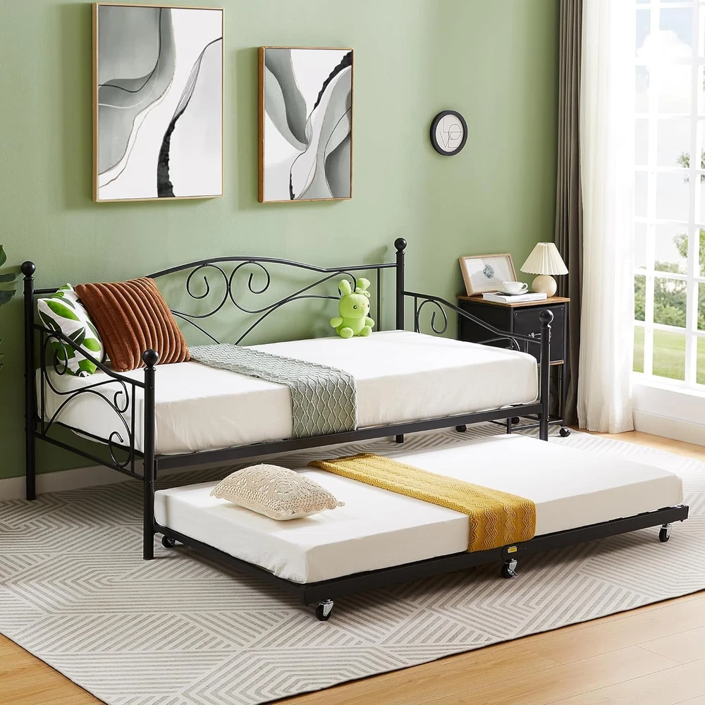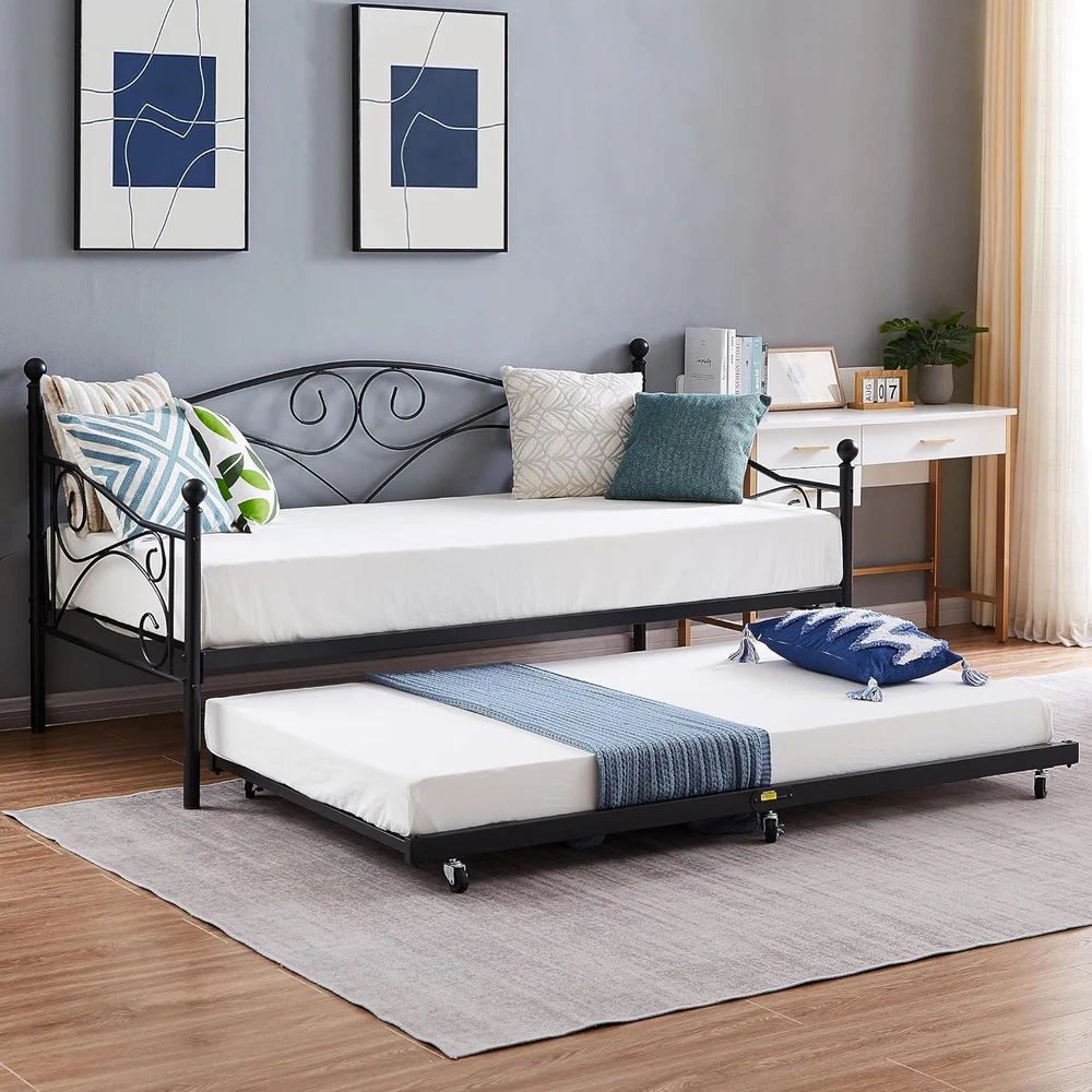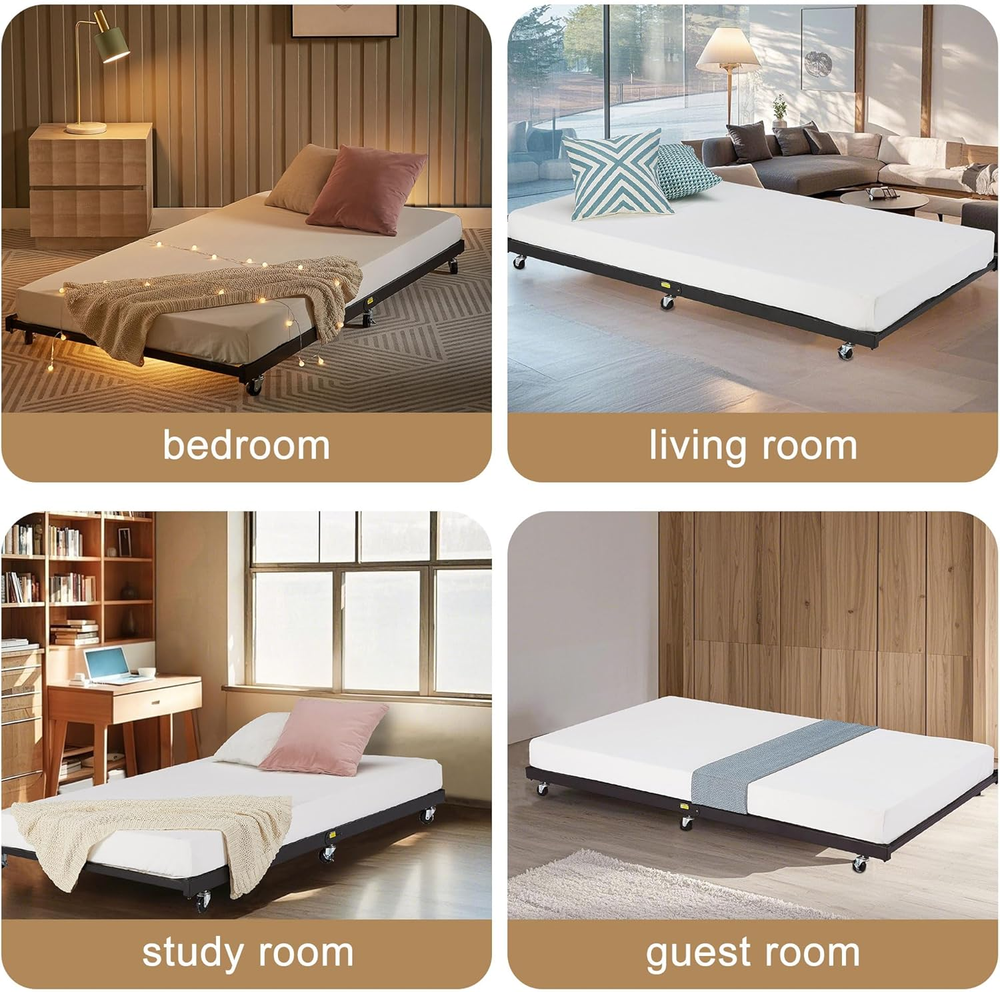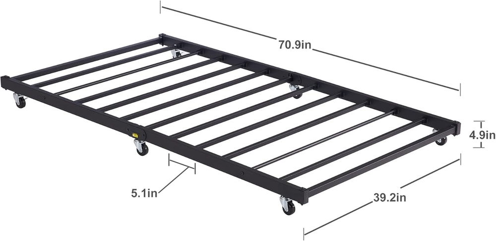 Store New Arrivals Add to Favorite View Feedback Contact Twin Trundle Bed Frame Only/Roll Out/Enhanced & Up-Graded Metal Slats Support with Lockable Casters, Black Description Item model number KHD-LT-Q07-VC021 Style Trundle Bed Material Metal Style Trundle Bed Country of Origin China Compatible With Mattress Size Twin Assembly Required Yes Batteries required No Product Dimensions 70.9"L x 39.2"W x 4.9"H Finish Type Powder Coated Included Components Installation Manual, 1* Trundle, Guardrails Fabric Type Metal Item Weight 23 pounds Ground To Item Distance 4.9 Inches Special Feature No Box Spring Needed, Multi-functional Daybed Frame, Sturdy, Durability, Squeak Resistant Maximum Weight Recommendation 300 Pounds Item Weight 23 Pounds Form Factor Trundle Bed Furniture Finish Alloy Steel Color Black Finish types Powder Coated Product Care Instructions Wipe with Dry Cloth, Wipe with Damp Cloth Size Twin Metal Trundle bed frame: The twin trundle bed Frame is ideal for accommodating family and friends for sleepovers. Also fit for Bedroom; guest room. No quaking & scratching: This trundle bed includes 6 easy-glide casters – two locking and four non-locking. Premium Steel slat support, no shaking, Weight capacity up to 300 lbs. Twin size trundle bed dimensions: 70.9"L x 39.2"W x 4. 9"H (L x W x H). Designed to fit one twin size trundle bed frame mattress (Sold separately). Space saving: This trundle is easy to keep, you could put it under your daybed frame or other places, the surface of the twin trundle bed frame is smooth, and this trundle bed just needs a simple wiping for cleaning. Easy assembly: This trundle bed comes with all accessories, tools, and instruction manual included, no additional tools required. if you need any help. VECELO Twin Size Trundle Bed frame, You Definitely Deserved It! What are our advantages? NO Box Spring Needed NO Squeak & Scratching Space Saving Enhanced Metal Legs Excellent Customer-Service Cost Effective (Price Advantage) Specifications:VELELO Twin Trundle Bed Bed Frame Color: Black/White Style: Trundle Max Load: 400 lb(Twin) Package Includes: 1 x Trundle Bed 1 x Instruction 1 x Assembly Kit Tips: Do not tighten screws until fully assembled. Make sure the legs remain in contact with the ground. Mattress is not included Check all screws or bolts are tightened and inspected regularly. ABOUT US We offer the best prices around on high quality products. Our E-store includes media such as books, movies, music and games while offering electronics, toys, sporting apparel, clothing, tools, general home, garden items and more. SHIPPING We are always working hard to ensure your package arrives as soon as possible. Please understand that some factors like weather, high postal traffic, and the performance of shipping companies are outside of our control. We offer free shipping to the lower 48 states and ship within 2 business days of payment, usually sooner. We do not accept P.O. Boxes. Please provide a physical address. For shipping outside of the continental USA, we only use eBay's Global Shipping Program.The item is shipped to KY and then sent to the rest of the world. International customers are responsible for all duties and taxes. Continue to check out in order to calculate costs for shipping the item to your country. Messages regarding eBay's Global Shipping Program MUST be directed at eBay EXCLUSIVELY. RETURNS We offer a 30-Day Return Policy on items which you are not completely satisfied with. You have the option for a full-refund or an exchange of the item. No returns are available on items shipped outside of the USA. PAYMENT We accept PayPal. CONTACT US This page content is yet to come Please ad us to your favorite seller and visit again later Thank You CUSTOMER SATISFACTION We try our very best to make sure every customer is completely satisfied. If there's a problem, message us! We're happy to help. WE ACCEPT Copyright © 2021 AutoDS. | All Rights Reserved